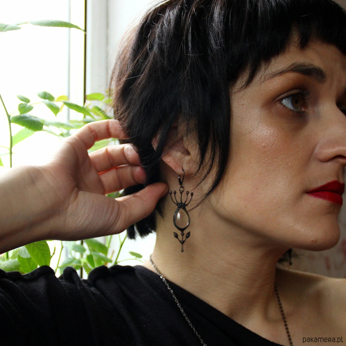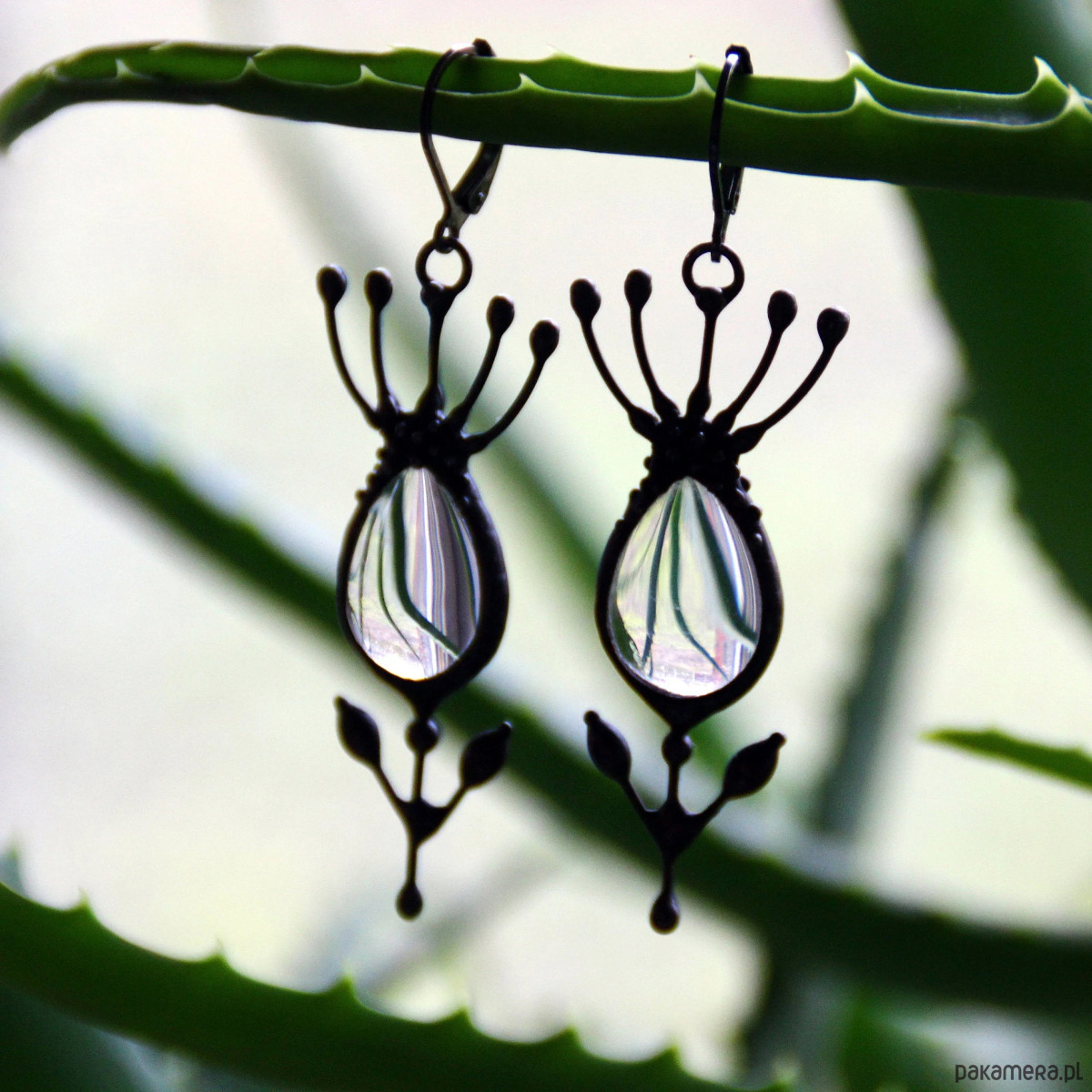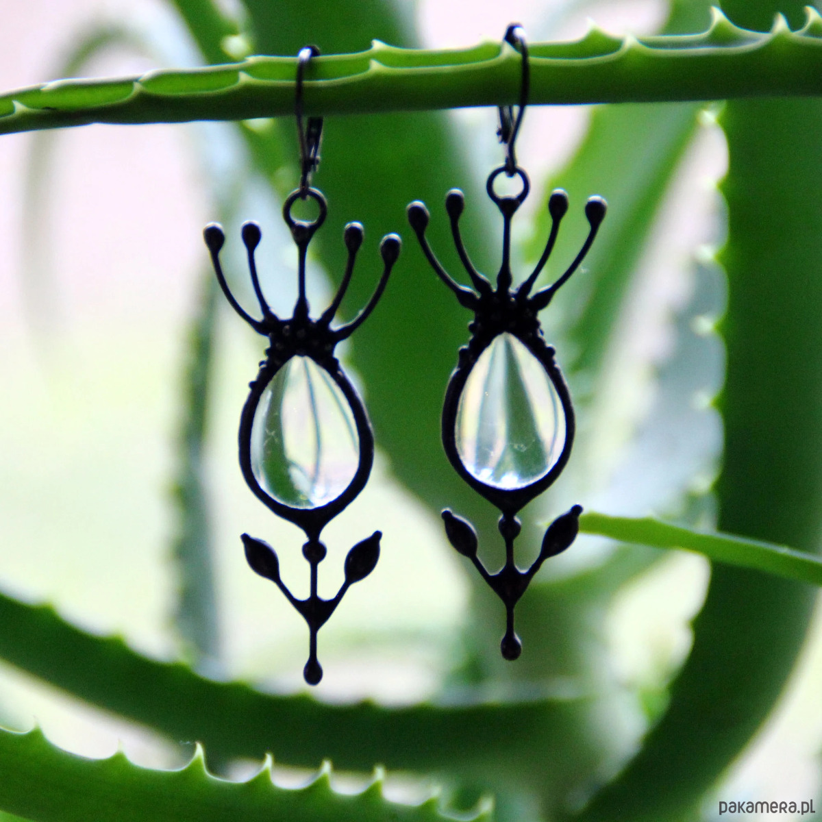 Wszystkie elementy są wykonane ręcznie, co gwarantuje indywidualność każdego produktu, który powstaje w pracowni Yadovito. Stop cyny i miedzi jest polerowany roztworem wykończeniowym, aby nadać biżuterii szlachetny wygląd, a jednocześnie zapobiec utlenianiu się metalu.Kolor: Czarny/Przezroczysty. Rozmiar około 5/3 cm.