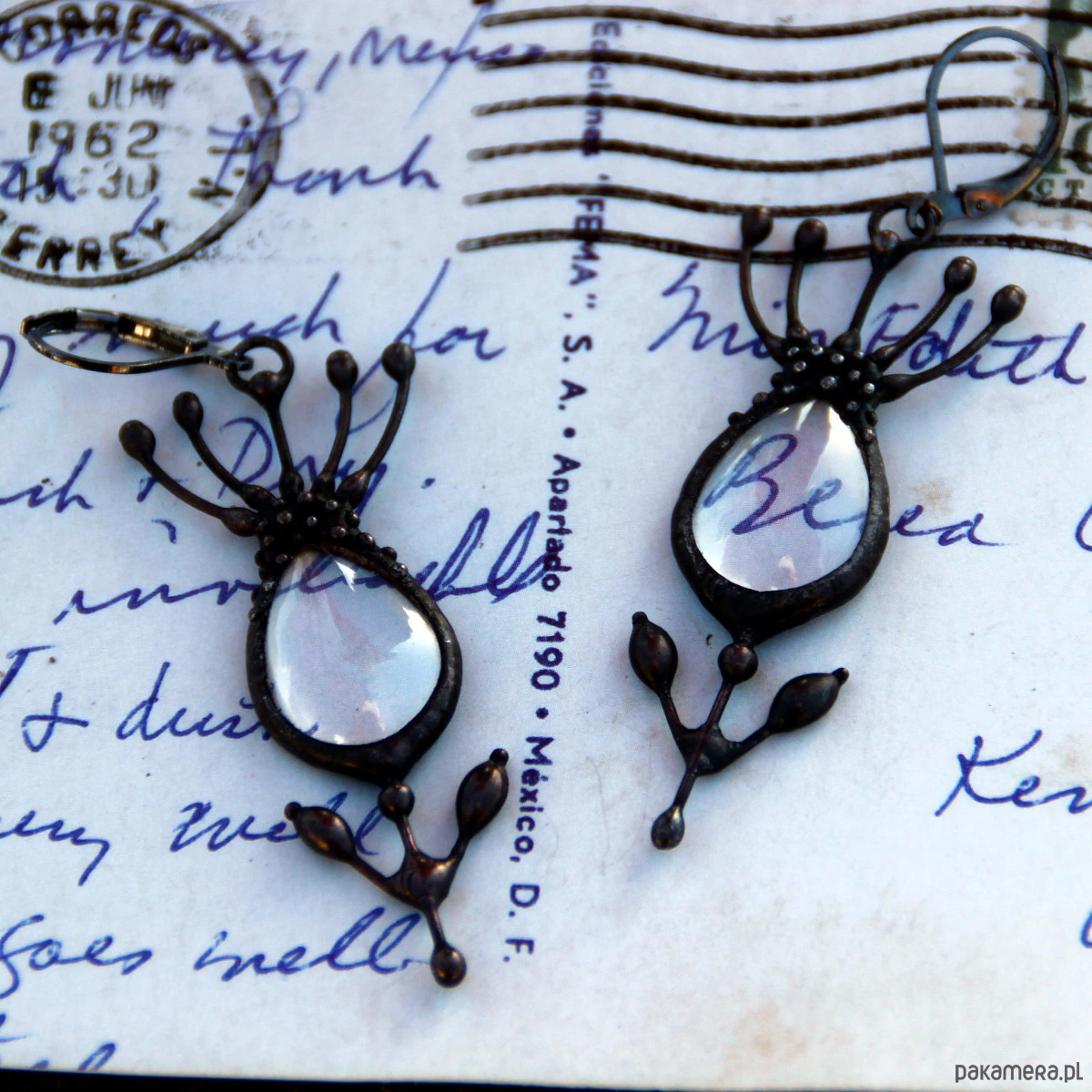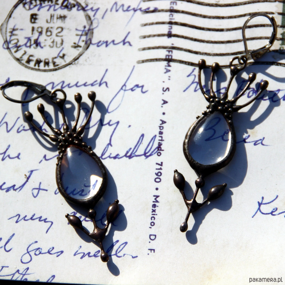Te ręcznie robione kolczyki boho z motywem kwiatów, wykonane z drutu miedzianego, stopu cyny i przezroczystego szkła. Pokryte patyną, zabezpieczone antyoksydantem, szlifowane i polerowane. Niezwykłe i solidne, boho hippie, kwiatowe kolczyki botaniczne z motywem kwiatów.