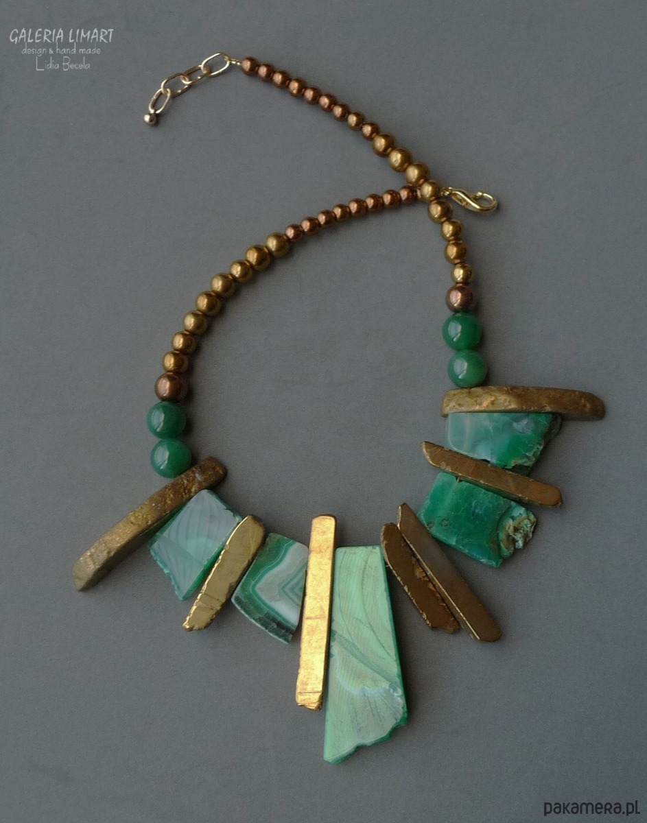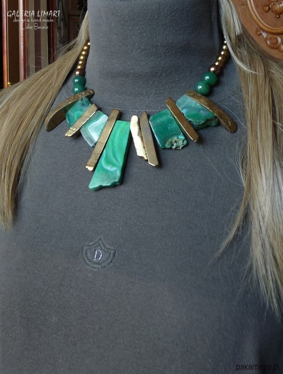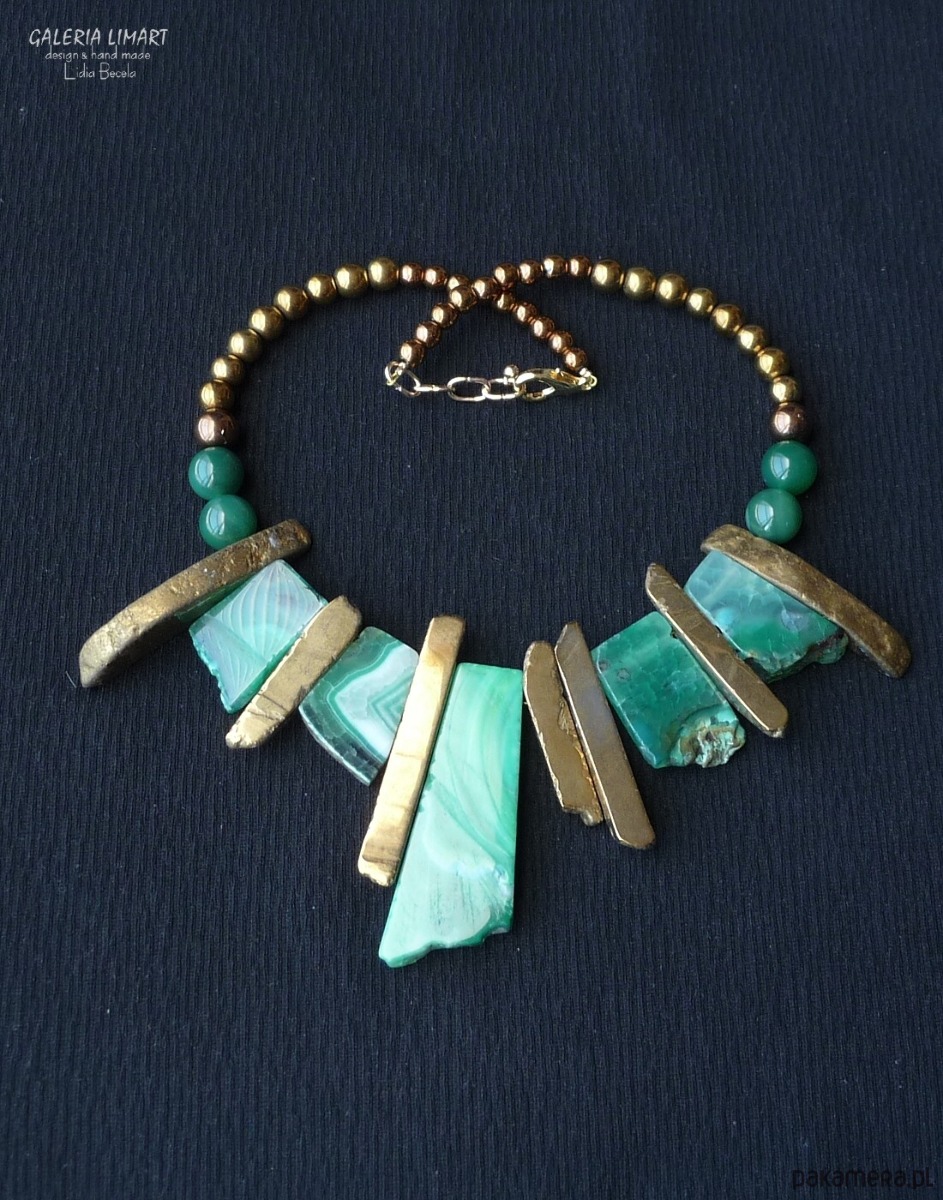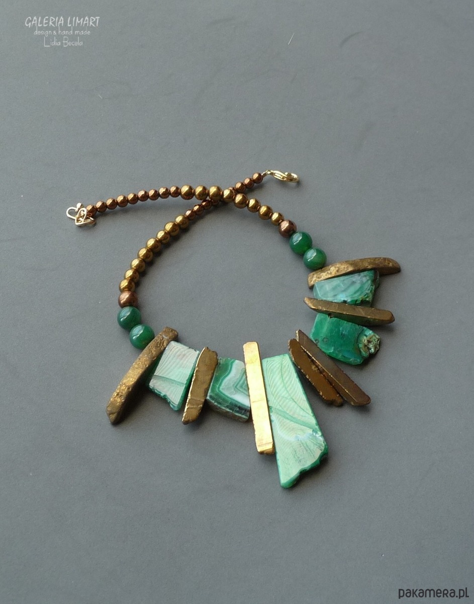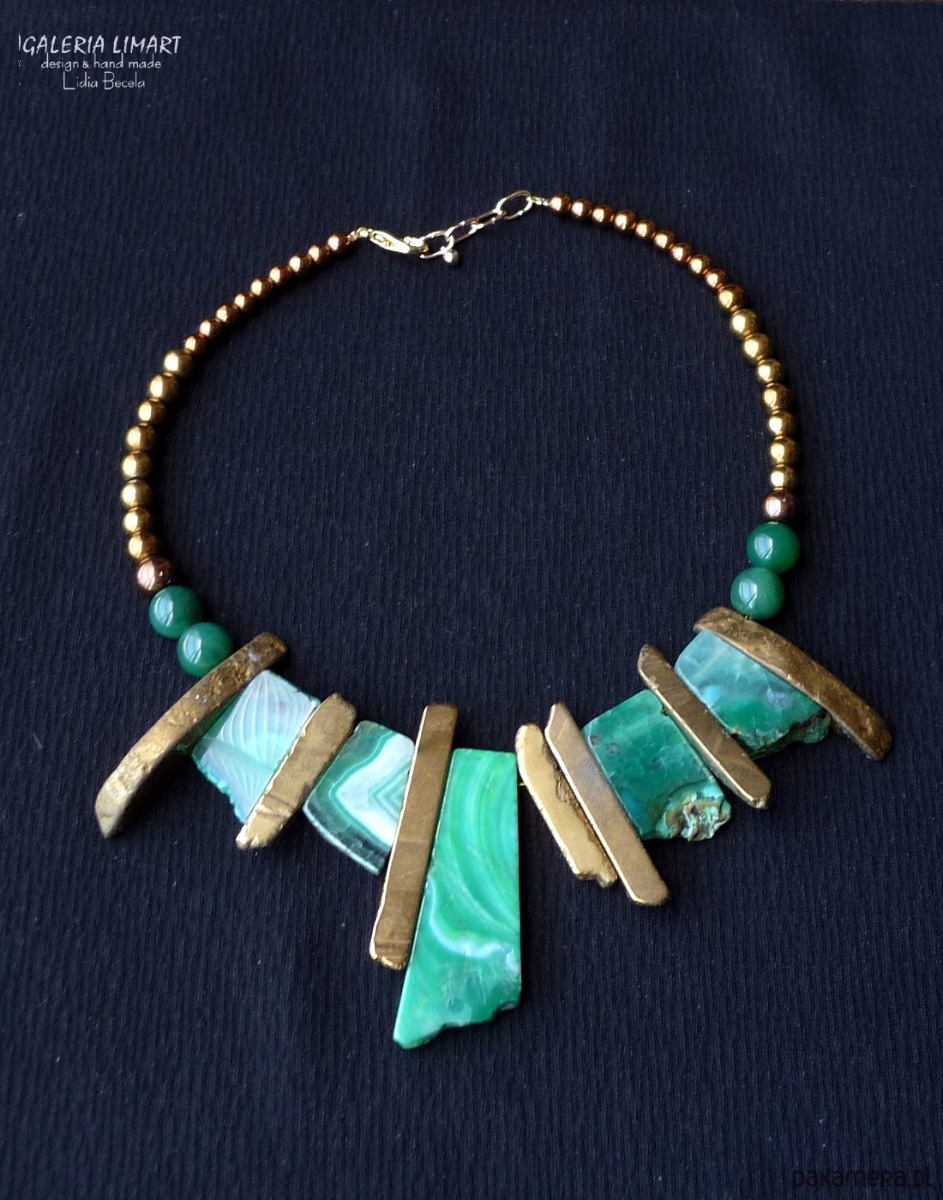 Moja niezmiernie spektakularna, efektowna i elegancka kompozycja naszyjnika z 5 wielkich surowych naturalnych zielony agatów, 7 podłużnych pozłacanych surowych agatów i graduowanych kulek złotego hematytu, Długość ok. 45 cm + regulacja.