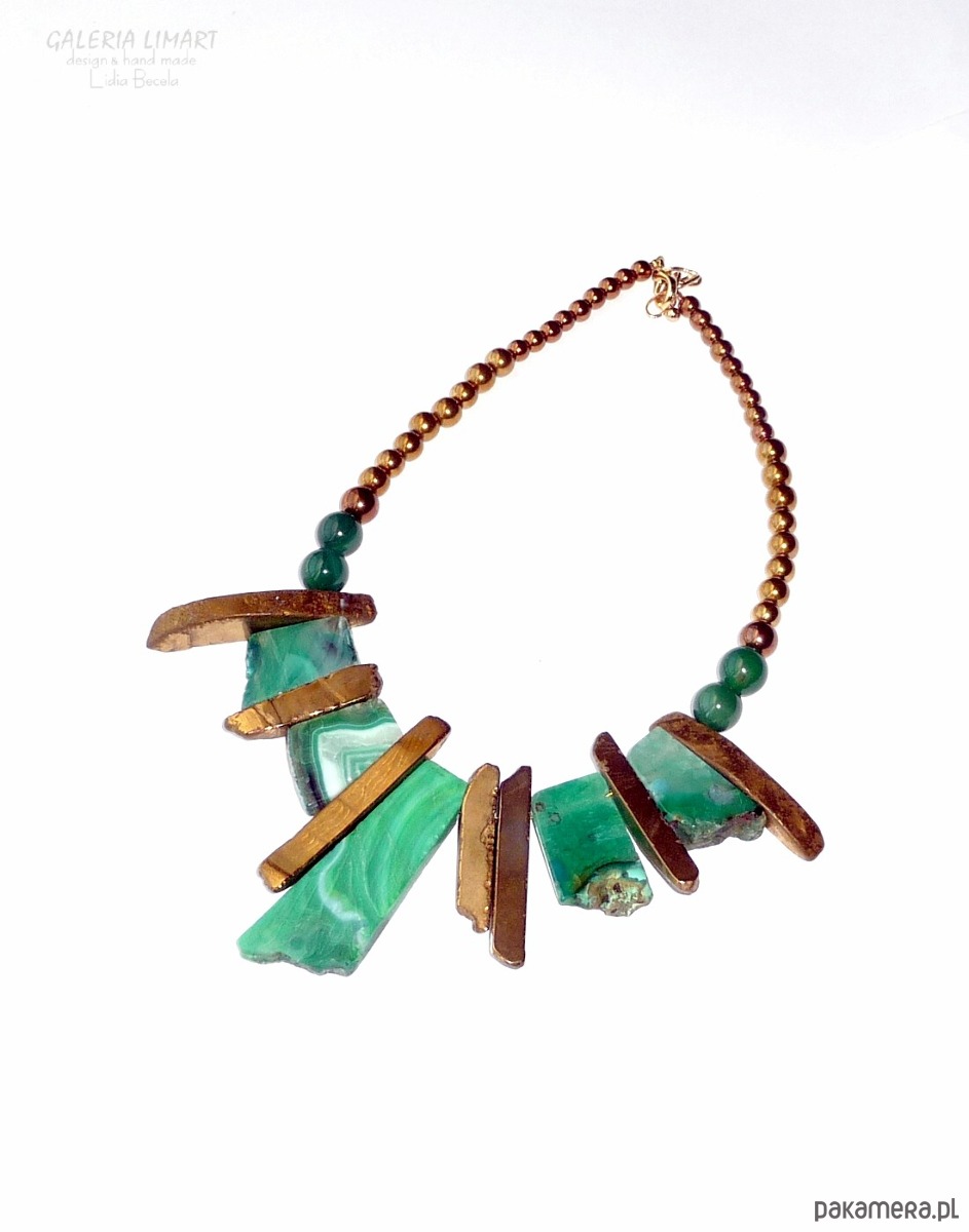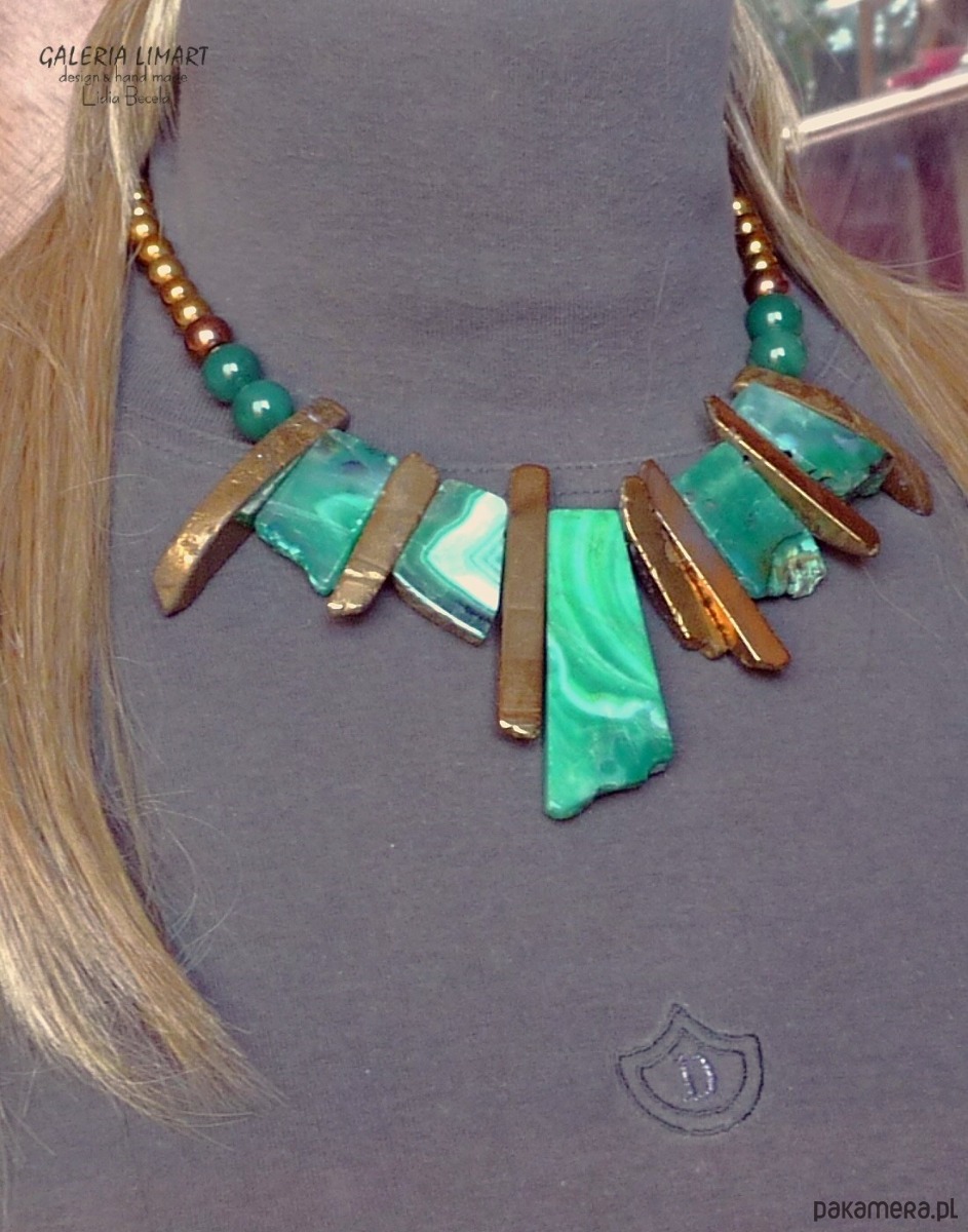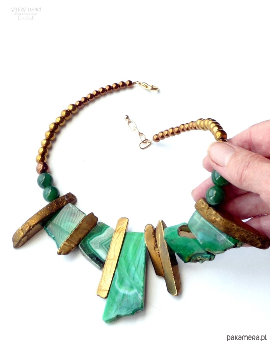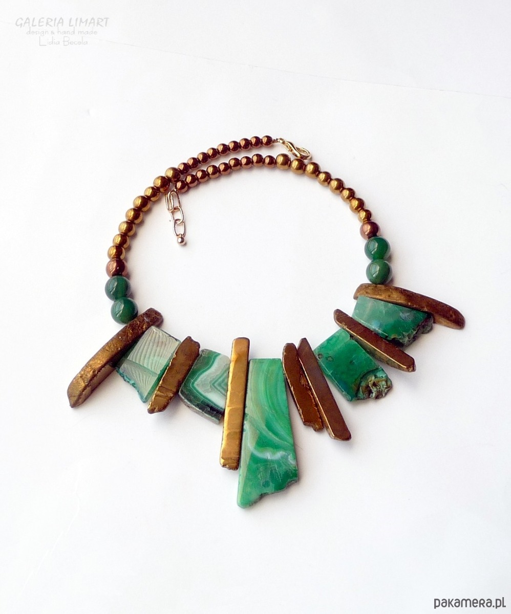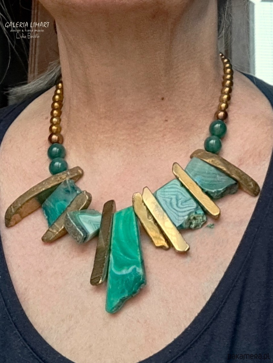 Moja niezmiernie spektakularna, efektowna i elegancka kompozycja naszyjnika z 5 wielkich surowych naturalnych zielony agatów, 7 podłużnych pozłacanych surowych agatów i graduowanych kulek złotego hematytu, Długość ok. 45 cm + regulacja.