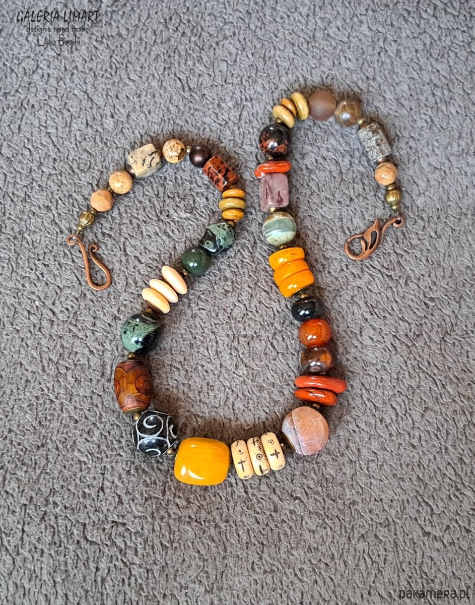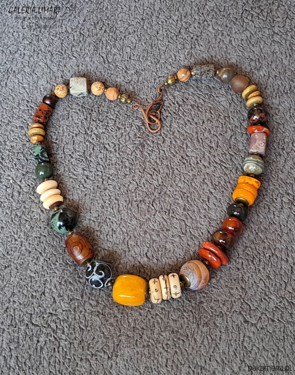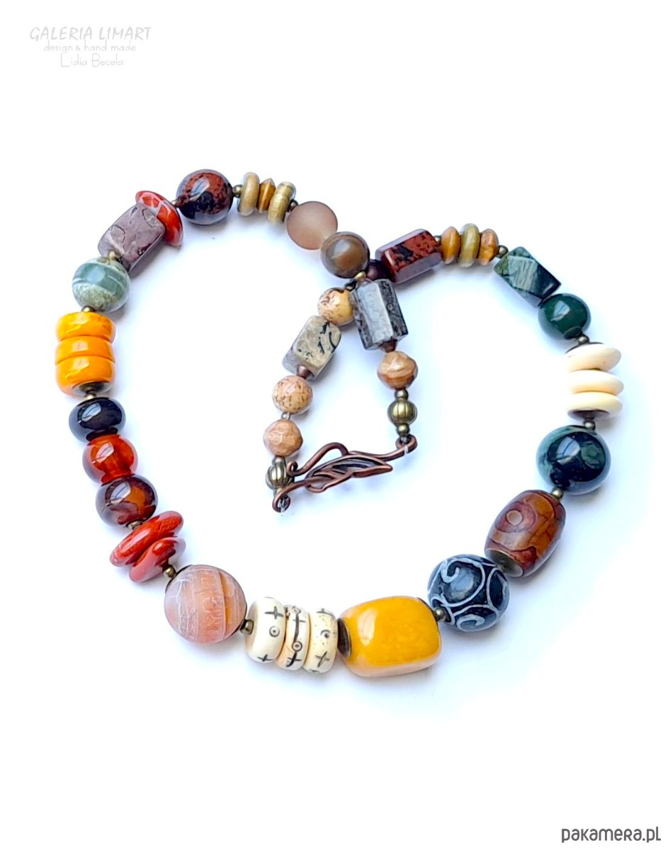 Oto elegancki, spektakularny i niezwykły naszyjnik, który powstał dzięki unikatowej kompozycji przeróżnych minerałów w ciepłych odcieniach żółci, brązu, czerwieni i zieleni ( jaspis oceaniczny, turkus afrykański, róg jaka, jadeit, gat DZ i inne ). Minerały zostały bardzo starannie dobrane i dopasowane w przepięknej jesiennej kolorystyce w taki sposób by powstał piękny unikatowy naszyjnik jedyny w swoim rodzaju. Długość (ok. 48 cm). Ten przemyślany melanż minerałów została tak stworzony by powstał stylowy naszyjnik dla eleganckiej kobiety, która doceni jego urodę.