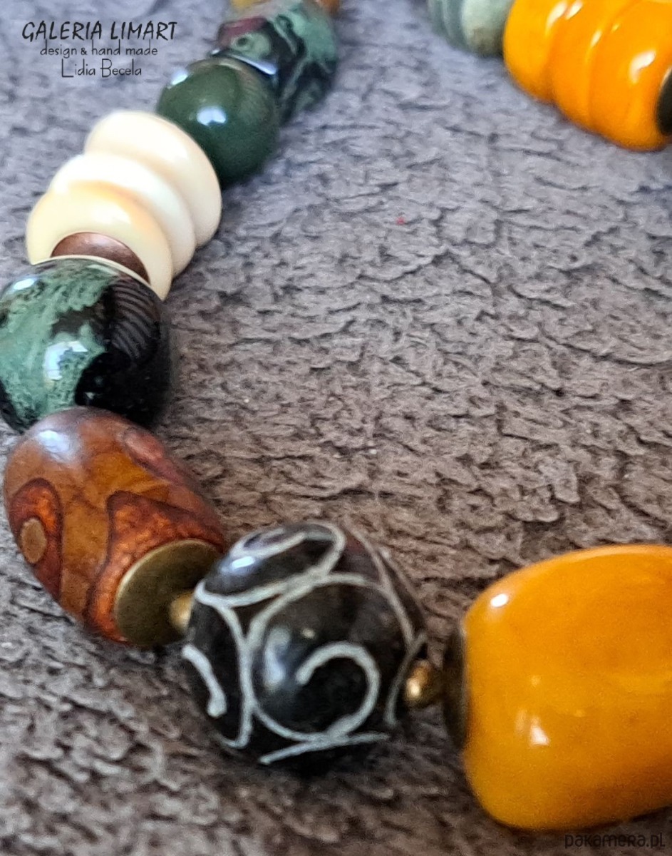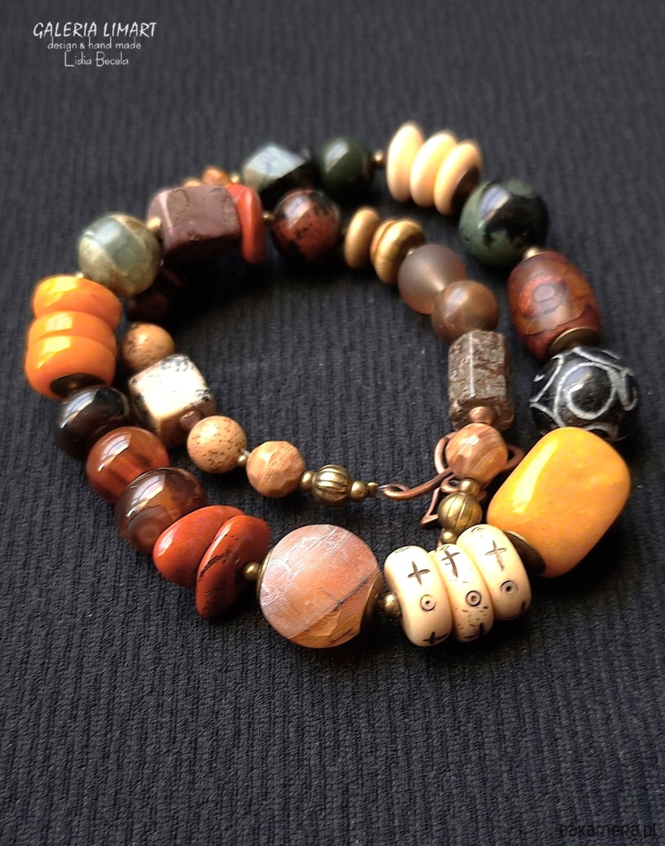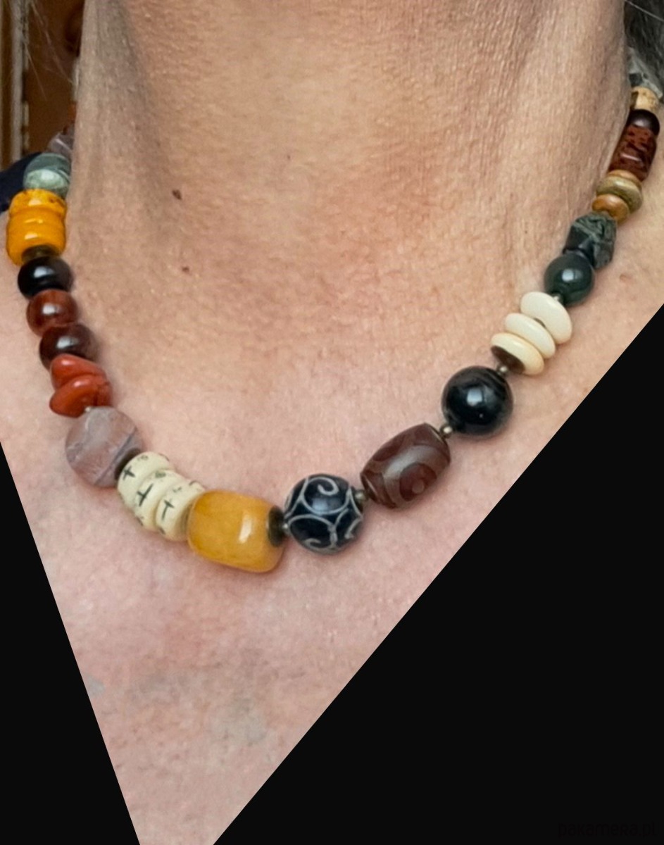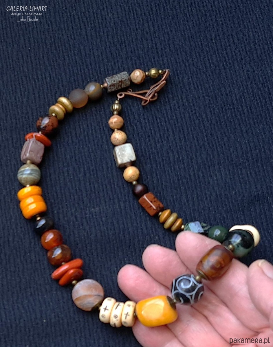Oto elegancki, spektakularny i niezwykły naszyjnik, który powstał dzięki unikatowej kompozycji przeróżnych minerałów w ciepłych odcieniach żółci, brązu, czerwieni i zieleni ( jaspis oceaniczny, turkus afrykański, róg jaka, jadeit, gat DZ i inne ). Minerały zostały bardzo starannie dobrane i dopasowane w przepięknej jesiennej kolorystyce w taki sposób by powstał piękny unikatowy naszyjnik jedyny w swoim rodzaju. Długość (ok. 48 cm). Ten przemyślany melanż minerałów została tak stworzony by powstał stylowy naszyjnik dla eleganckiej kobiety, która doceni jego urodę.