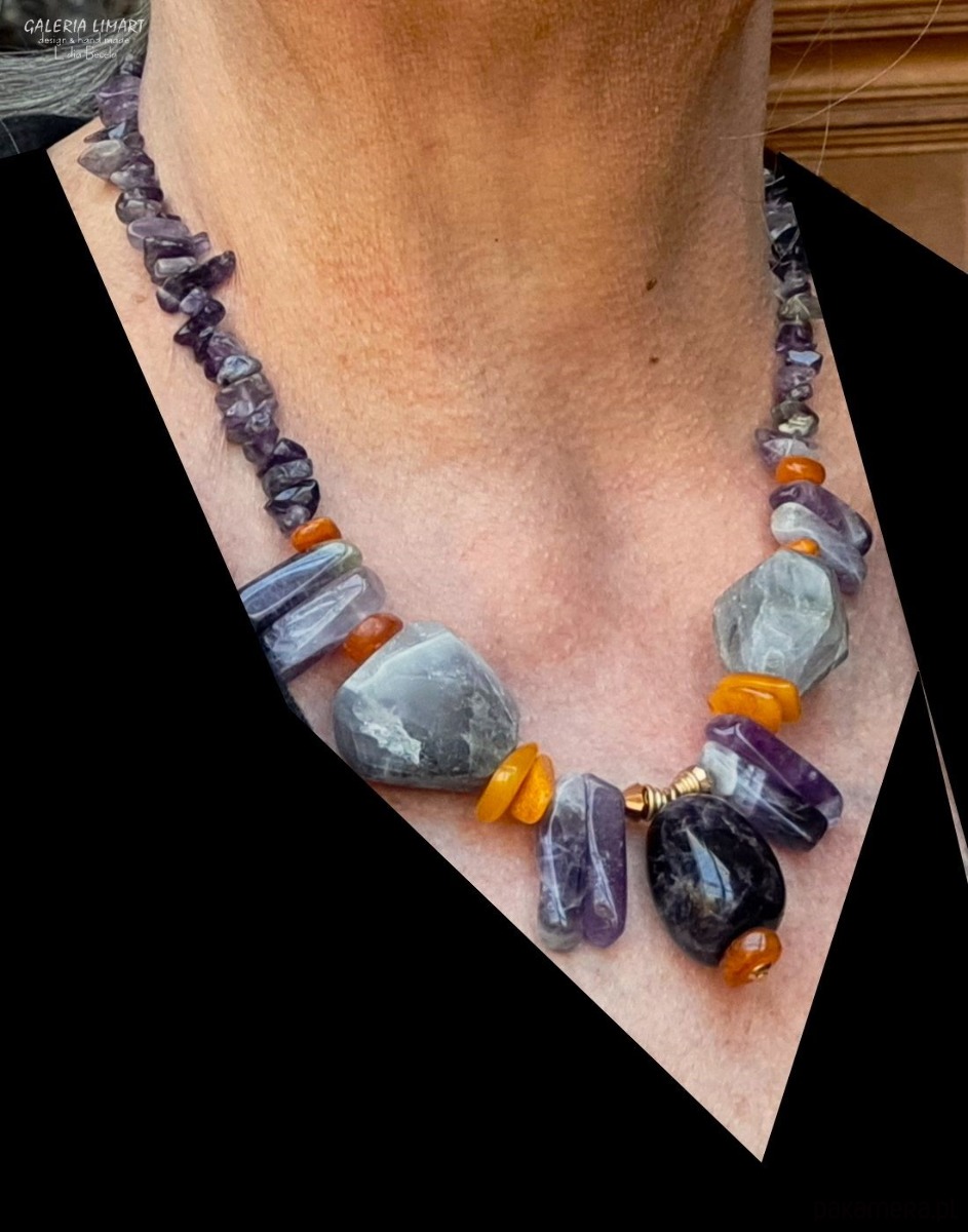 Elegancko. Piękne surowe ametysty i bursztyn w ciekawym naszyjniku dla ...