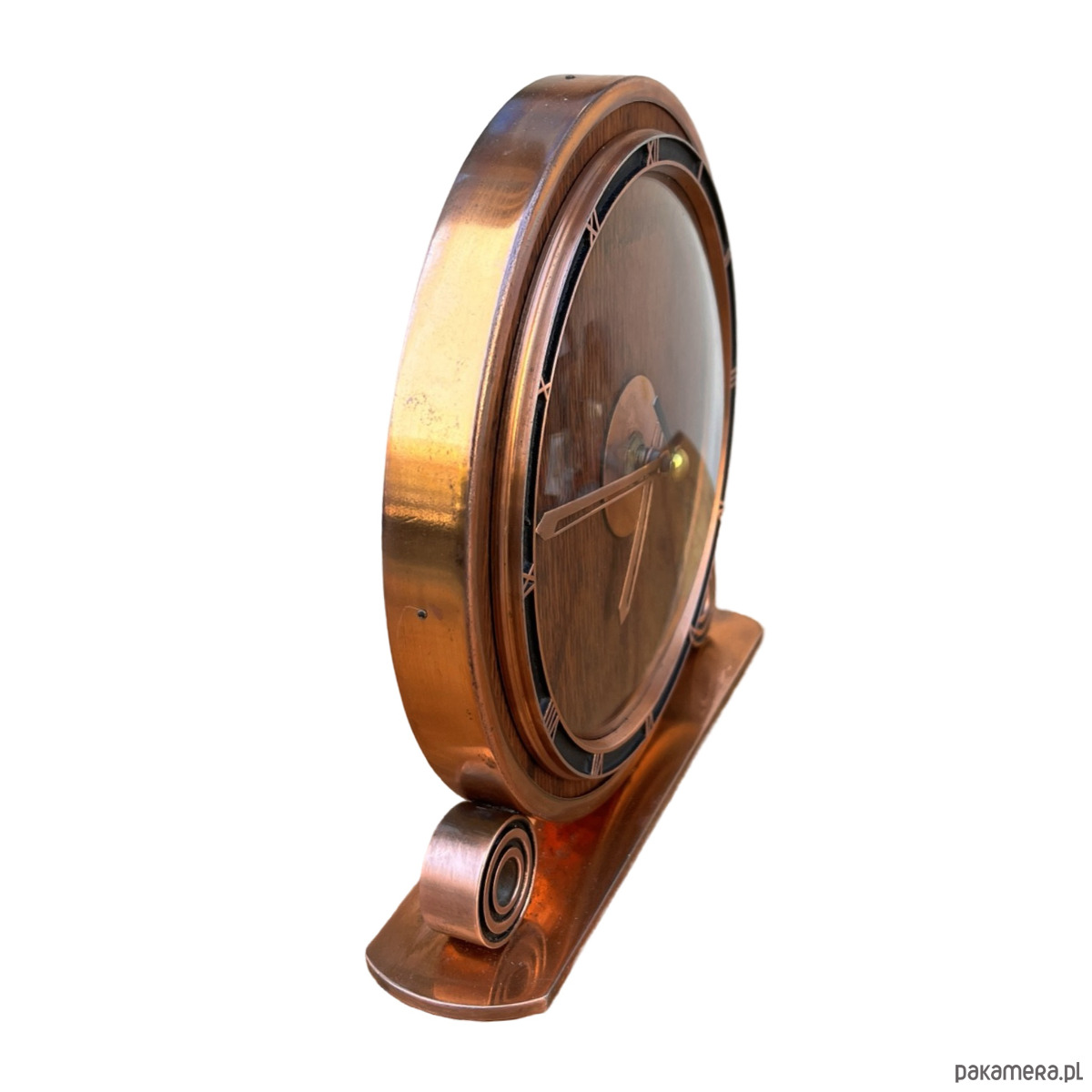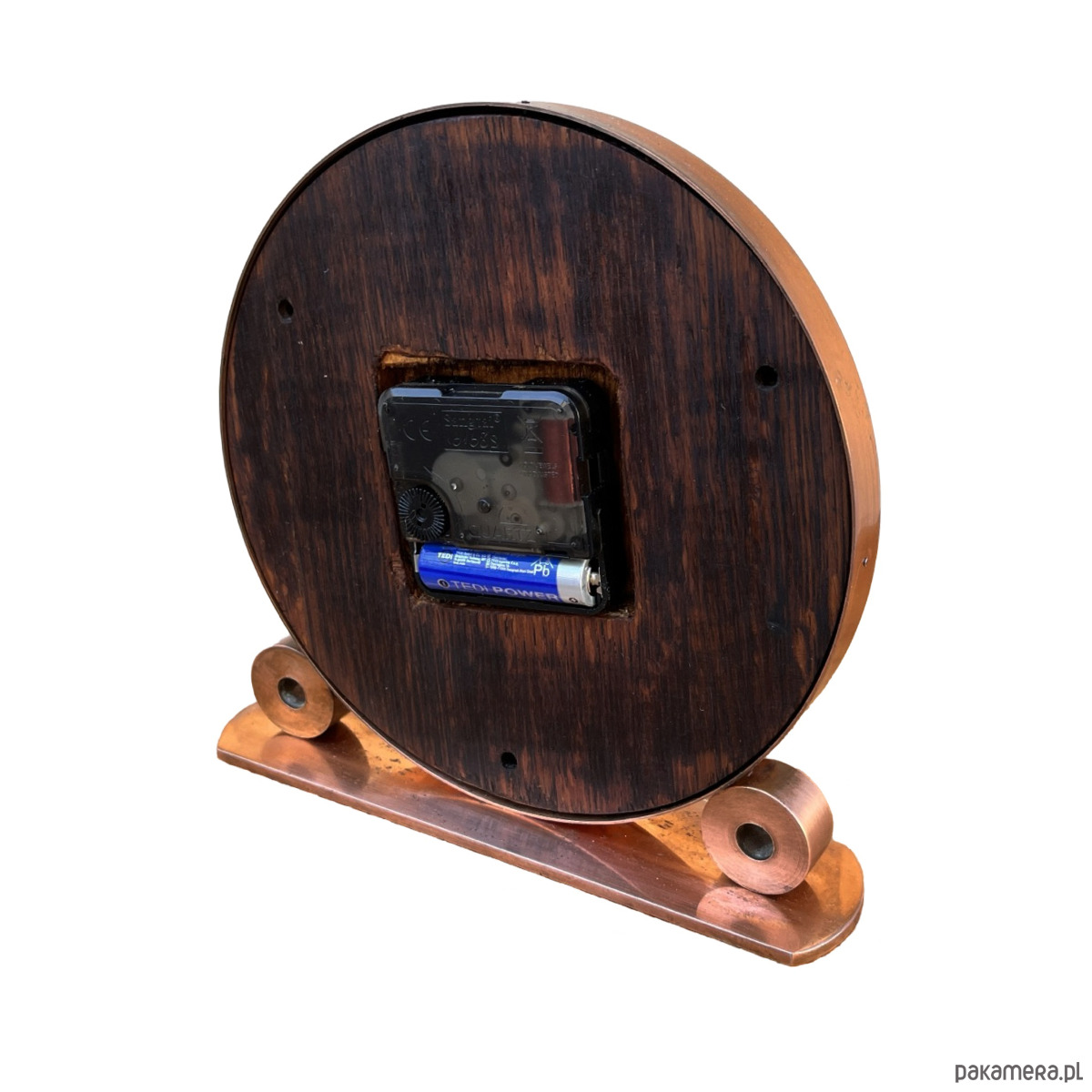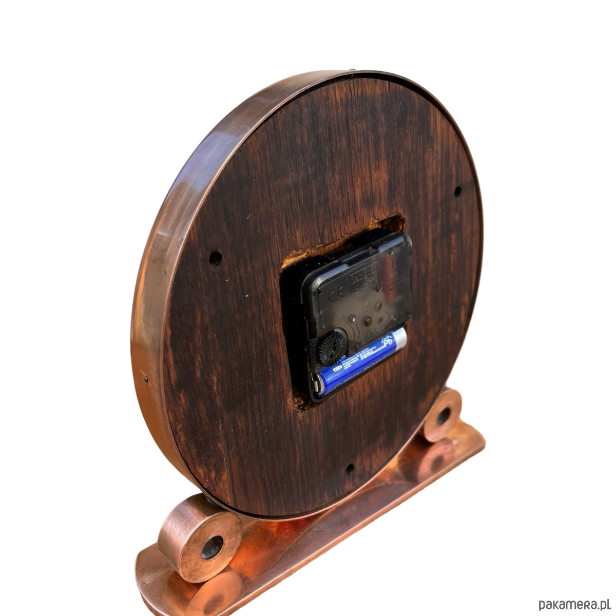 Elektryczny zegar kominkowy wyprodukowany na początku lat 70. przez niemiecką firmę Kienzle. Zegar z cyferblatem z masywu dębowego pokrytym ręcznie kutą miedzią osadzonym na miedzianych nóżkach z metaloplastyki. Cyferblat przykryty soczewkową szybą/ Zegar sprawny na pojedynczą baterię AA. Zegar w stanie dobrym, ma niewielkie ślady użytkowania.