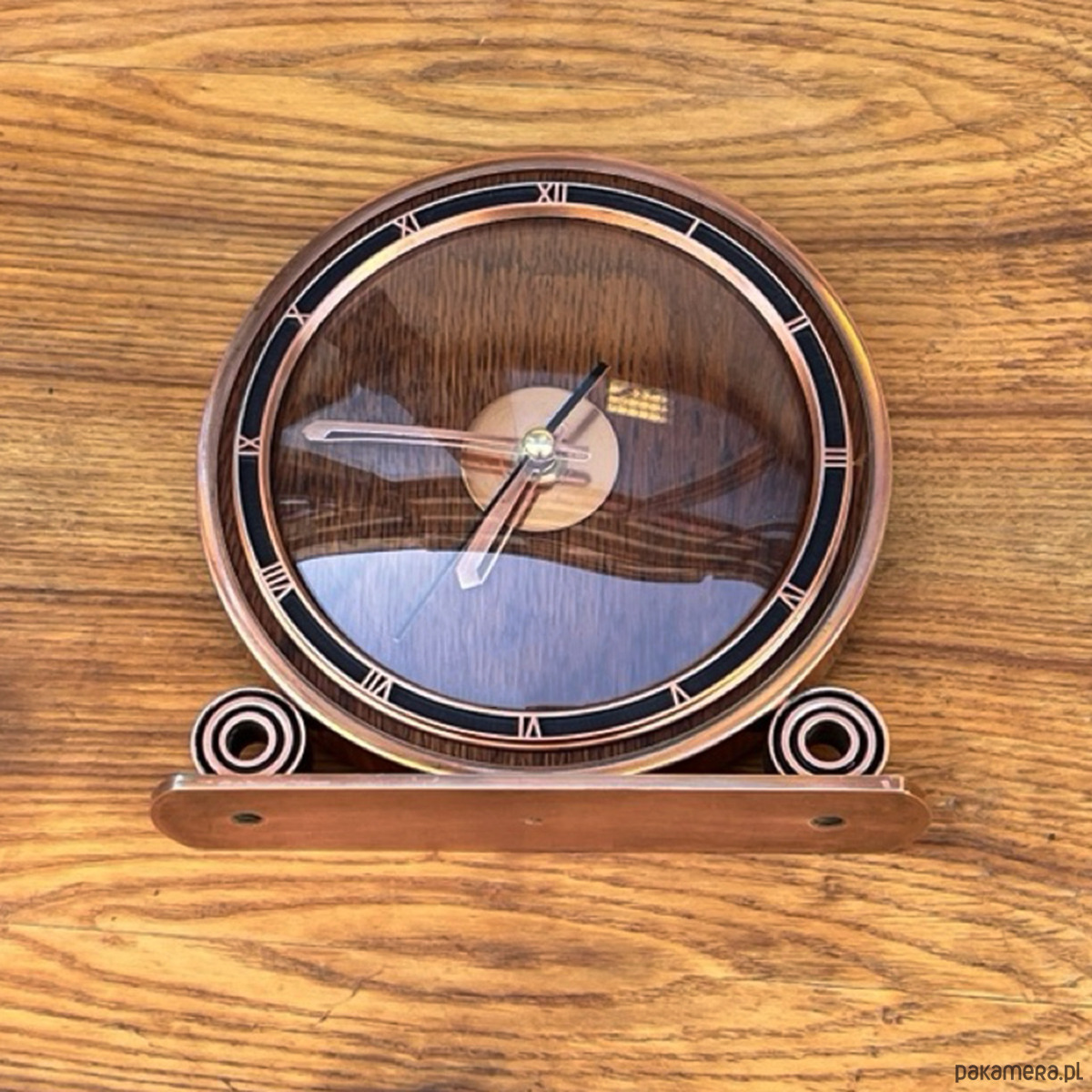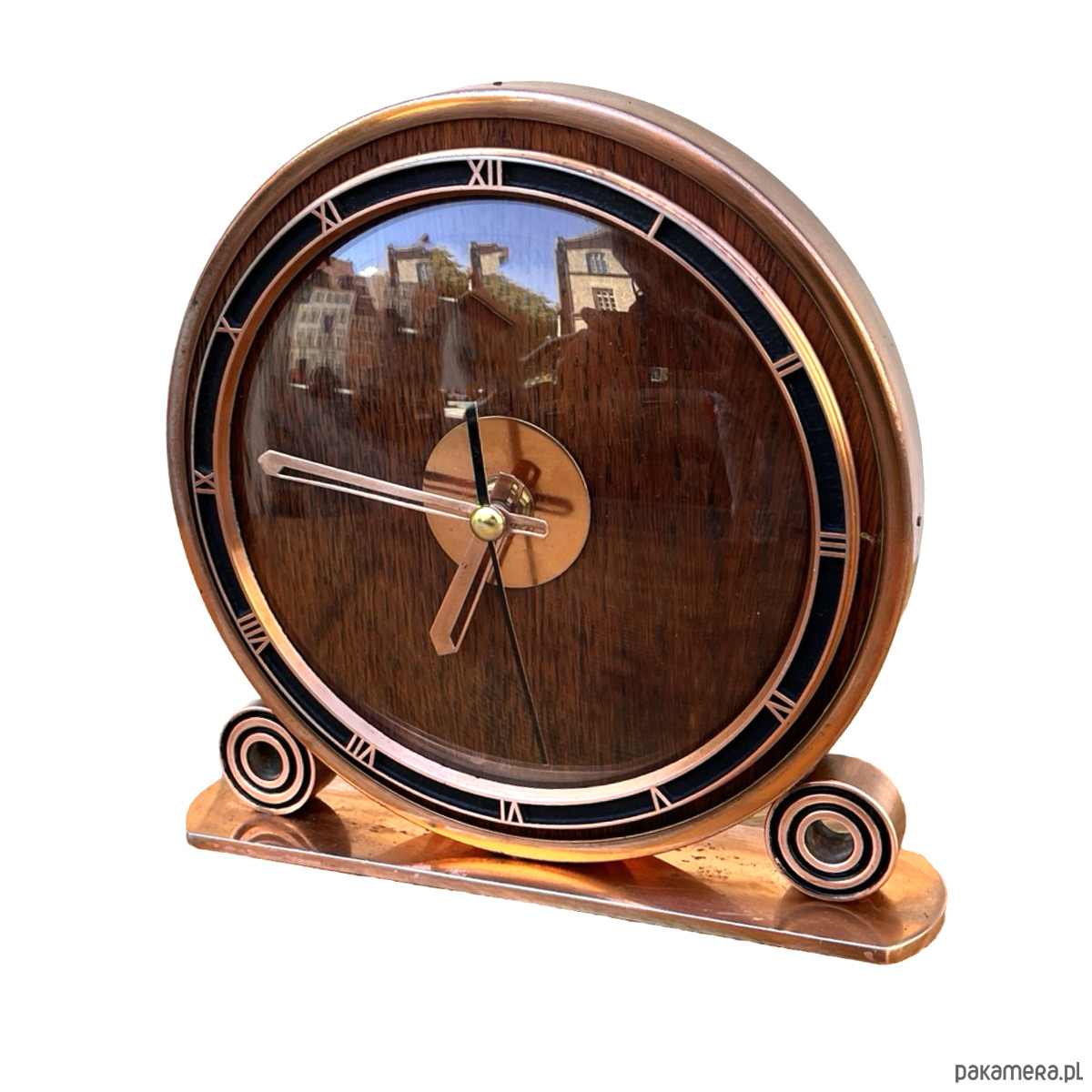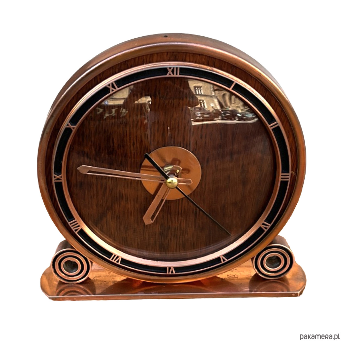 Elektryczny zegar kominkowy wyprodukowany na początku lat 70. przez niemiecką firmę Kienzle. Zegar z cyferblatem z masywu dębowego pokrytym ręcznie kutą miedzią osadzonym na miedzianych nóżkach z metaloplastyki. Cyferblat przykryty soczewkową szybą/ Zegar sprawny na pojedynczą baterię AA. Zegar w stanie dobrym, ma niewielkie ślady użytkowania.