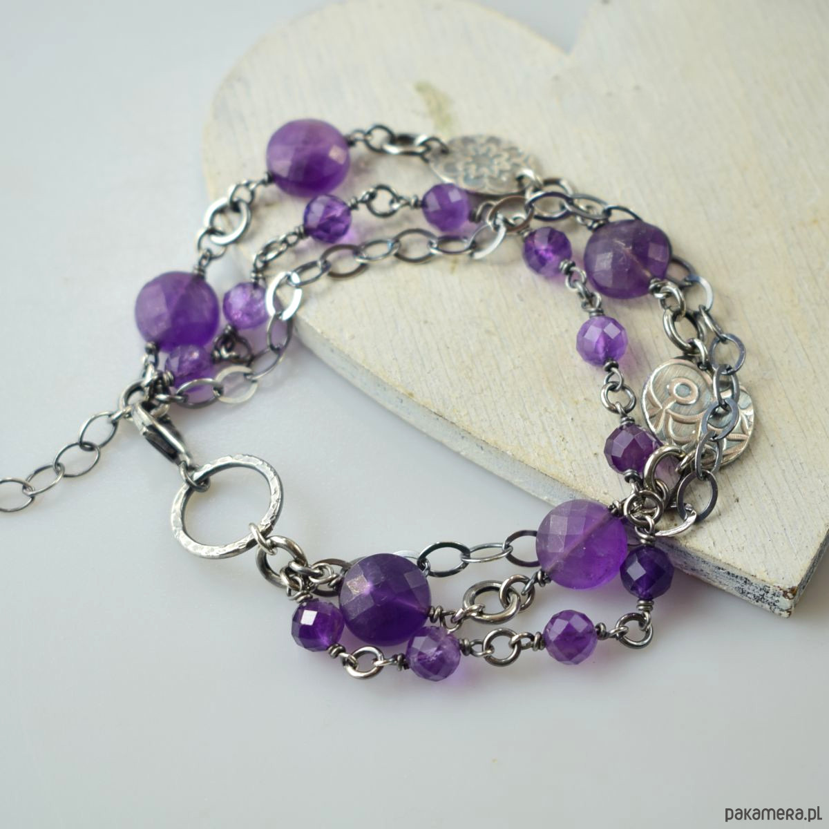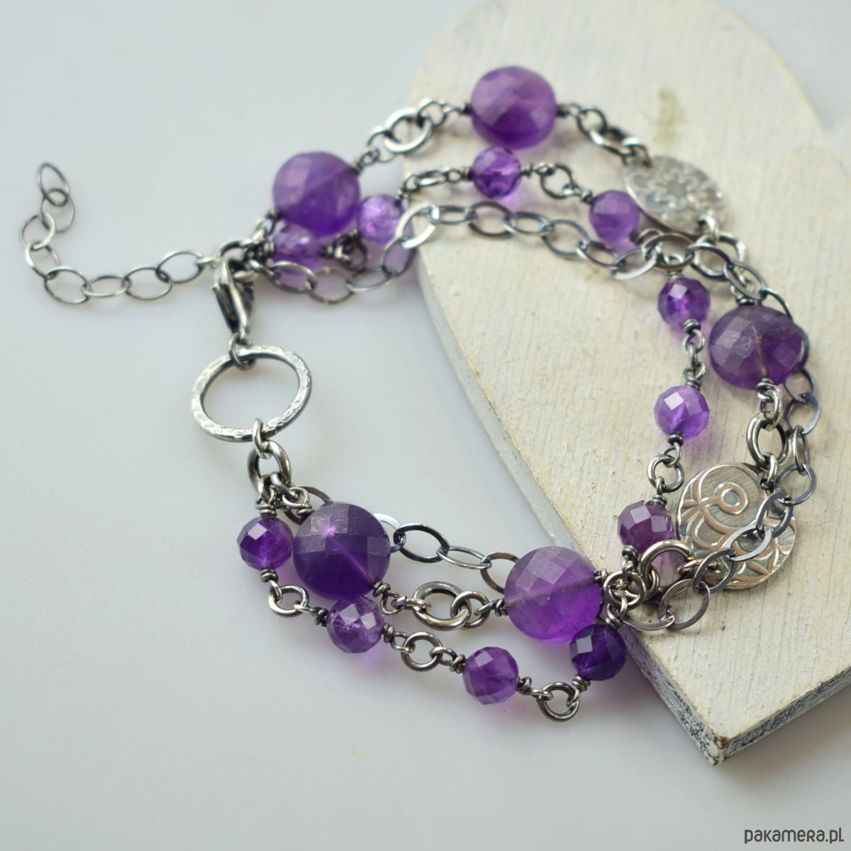 Bransoletka wykonana w całości ze srebra (próba 925) z ametystem. Całość została zoksydowana (przyciemniona) i wypolerowana. Długość regulowana 20,5 - 24 cm. Biżuteria zostanie ozdobnie zapakowana.