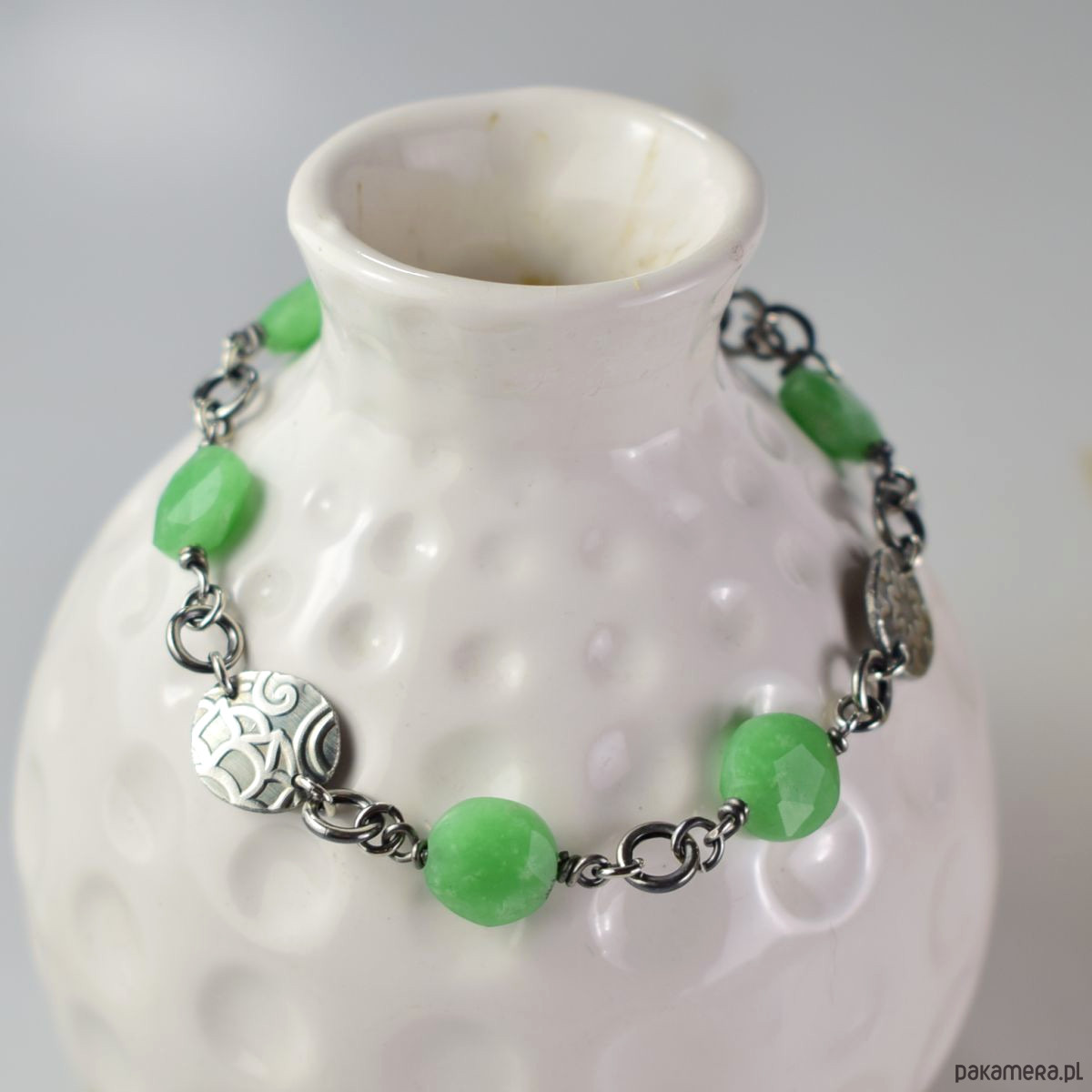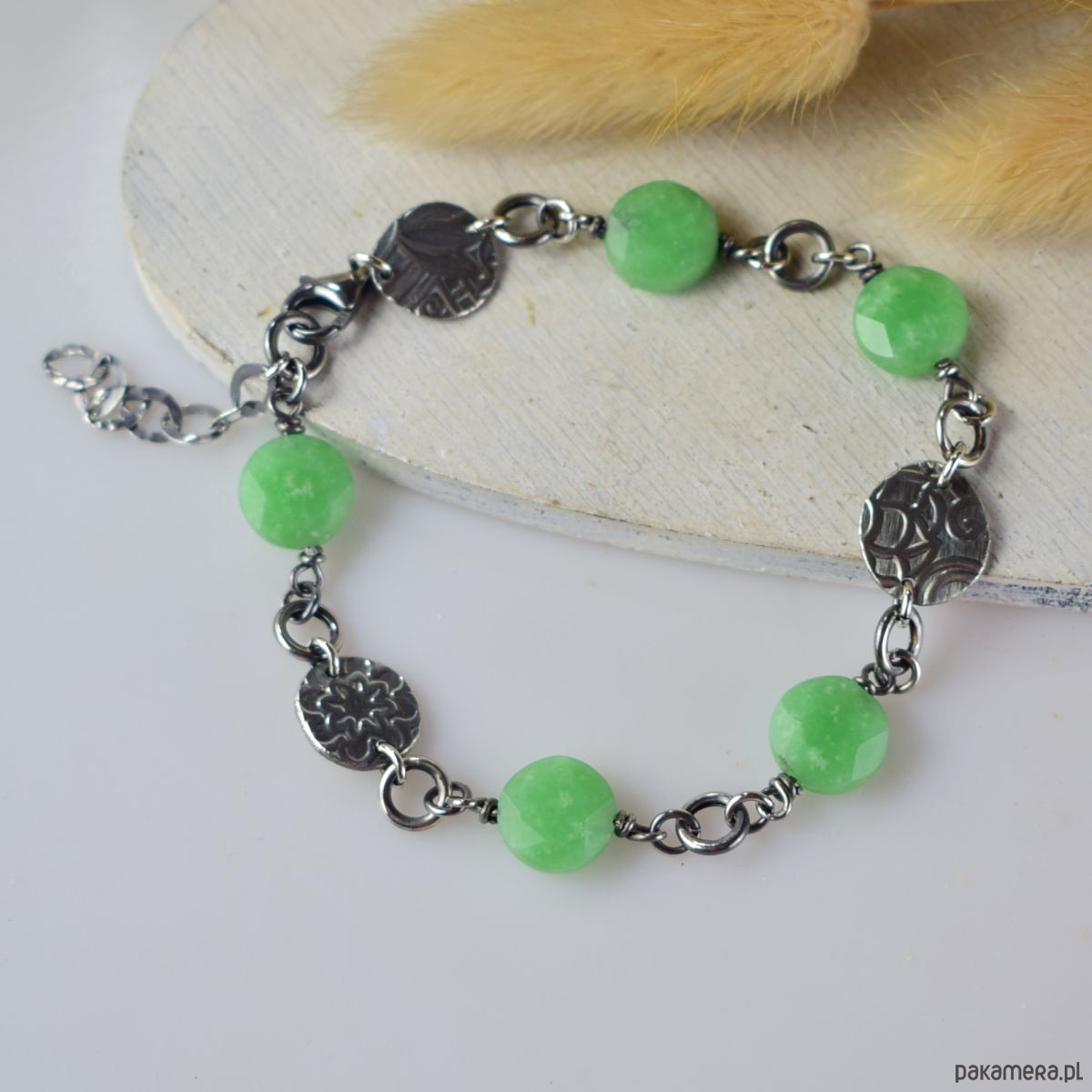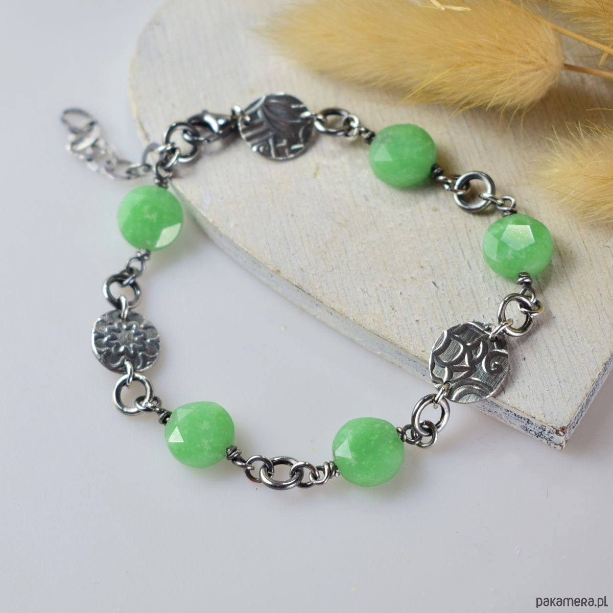 Bransoletka wykonana w całości ze srebra (próba 925) z zielonym awenturynem. Całość została zoksydowana (przyciemniona) i wypolerowana. Długość regulowana 20.5 - 25 cm. Biżuteria zostanie ozdobnie zapakowana.