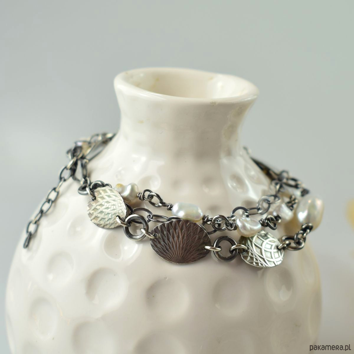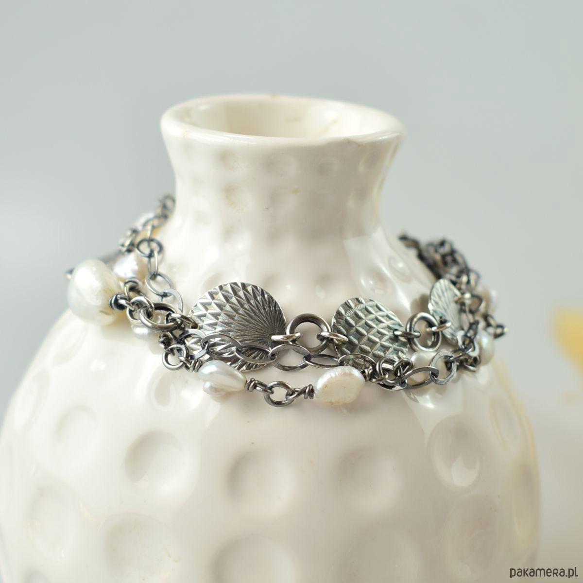 Bransoletka wykonana w całości ze srebra (próba 925) z perłami. Całość została zoksydowana (przyciemniona) i wypolerowana. Długość regulowana 19 - 22 cm. Biżuteria zostanie ozdobnie zapakowana.