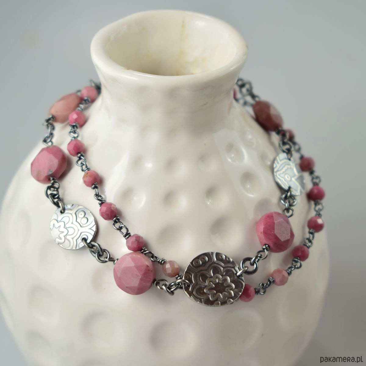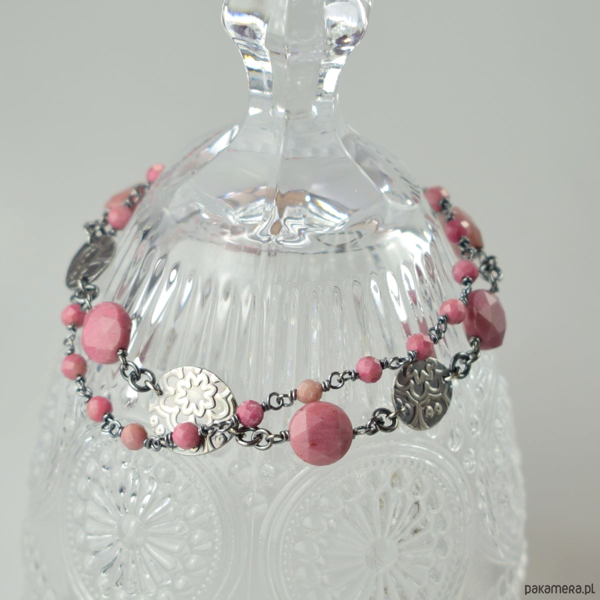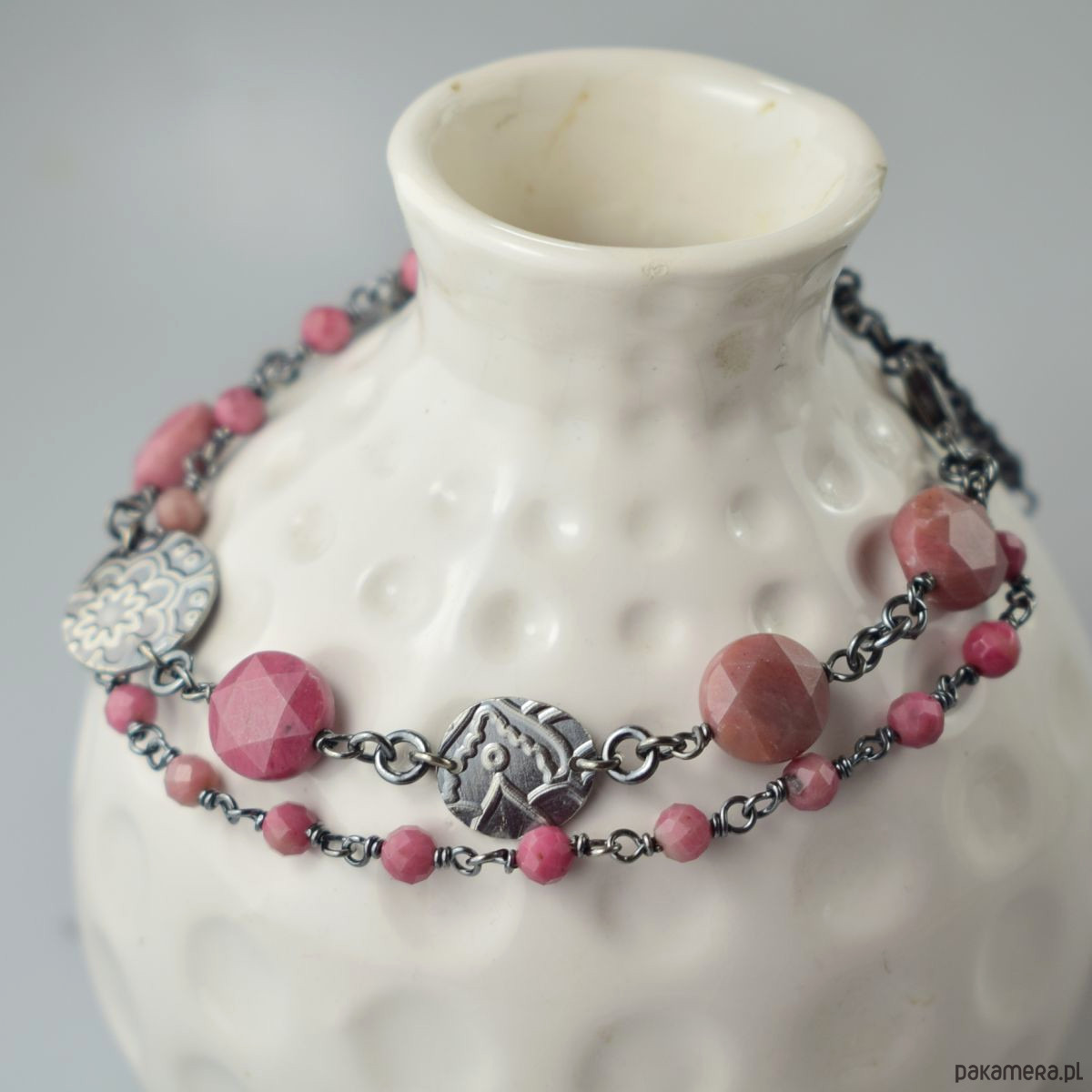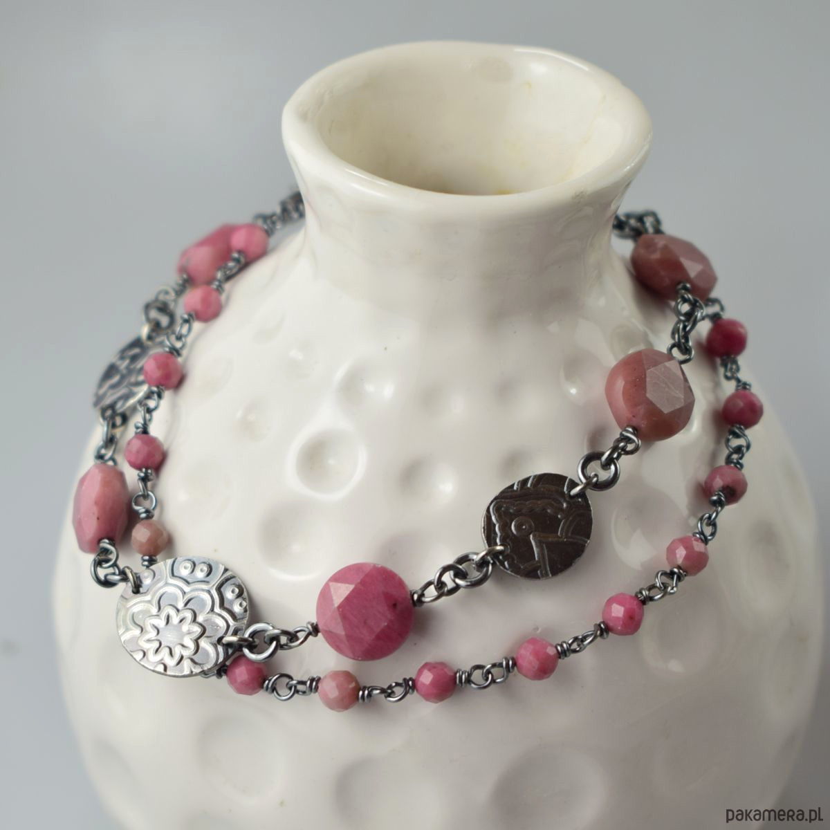 Bransoletka wykonana w całości ze srebra (próba 925) z rodonitem. Całość została zoksydowana (przyciemniona) i wypolerowana. Długość regulowana 20,5 - 23,5 cm. Biżuteria zostanie ozdobnie zapakowana.