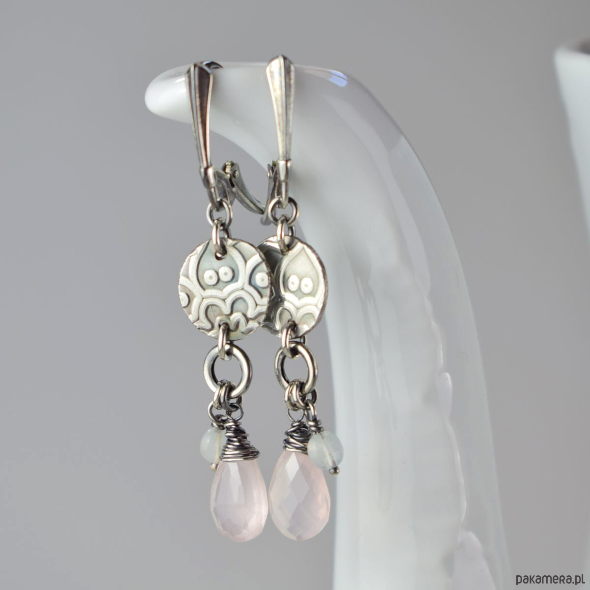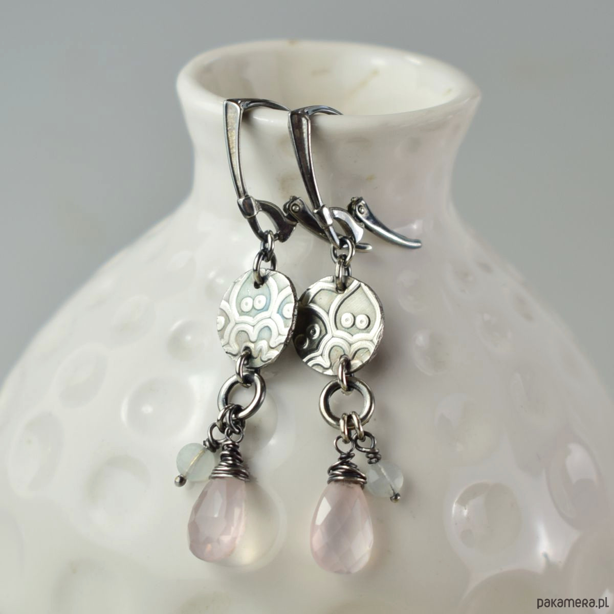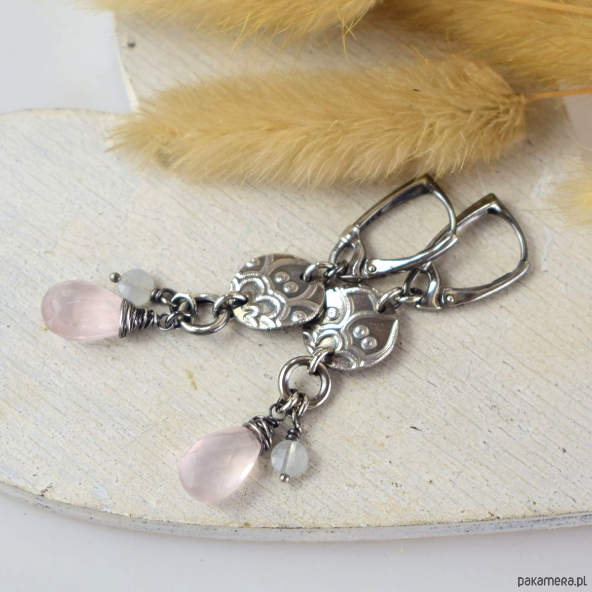 Kolczyki zostały zaprojektowane i wykonane od podstaw w pracowni Sunflower. Jedyny egzemplarz. Długość całego kolczyka 5,7 cm. Użyte materiały: kwarc różowy, akwamarynt, srebro 925 oksydowane. Biżuteria zostanie ozdobnie zapakowana.