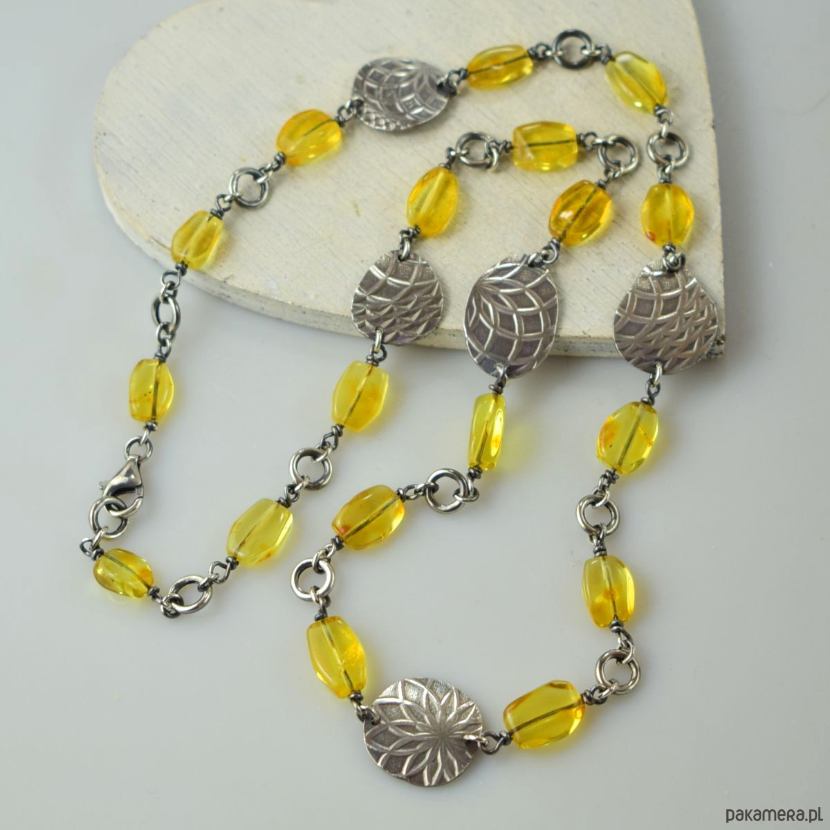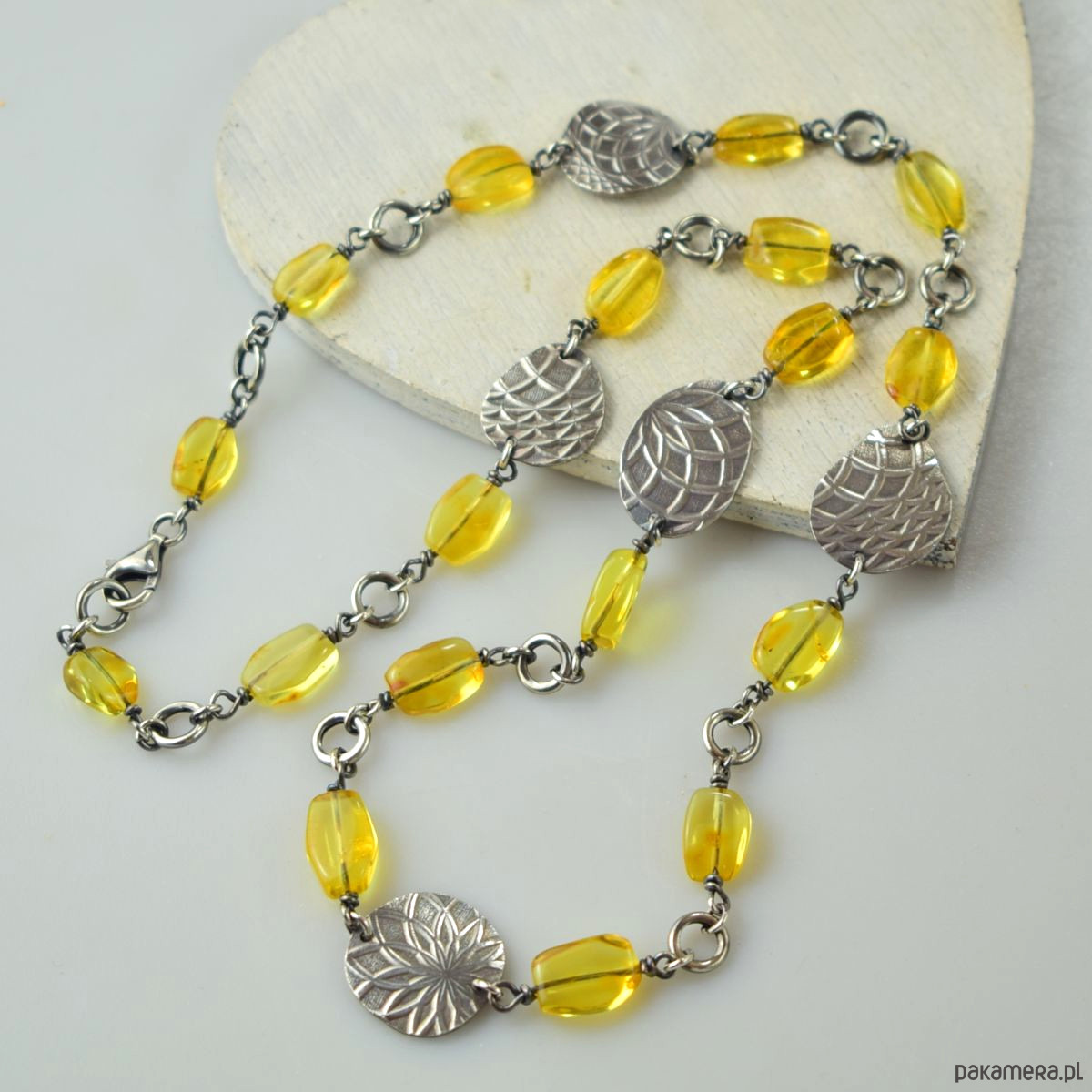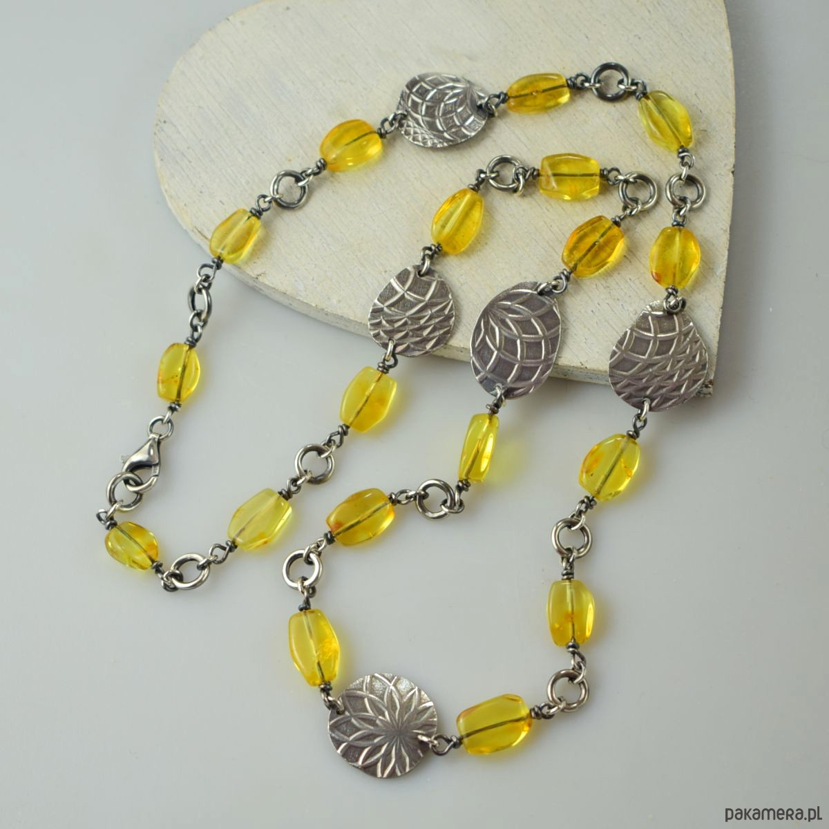 Naszyjnik wykonany w całości ze srebra (próba 925) z bursztynem. Całość została zoksydowana (przyciemniona) i wypolerowana. Długość 53 cm. Biżuteria zostanie ozdobnie zapakowana.
