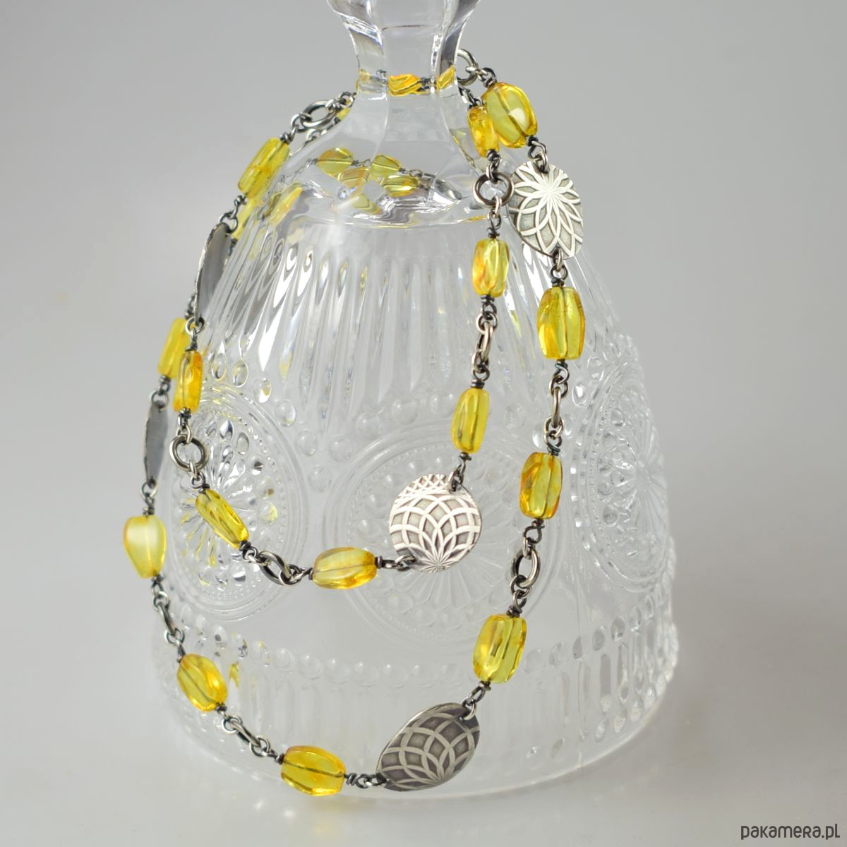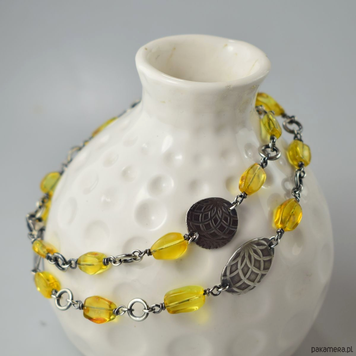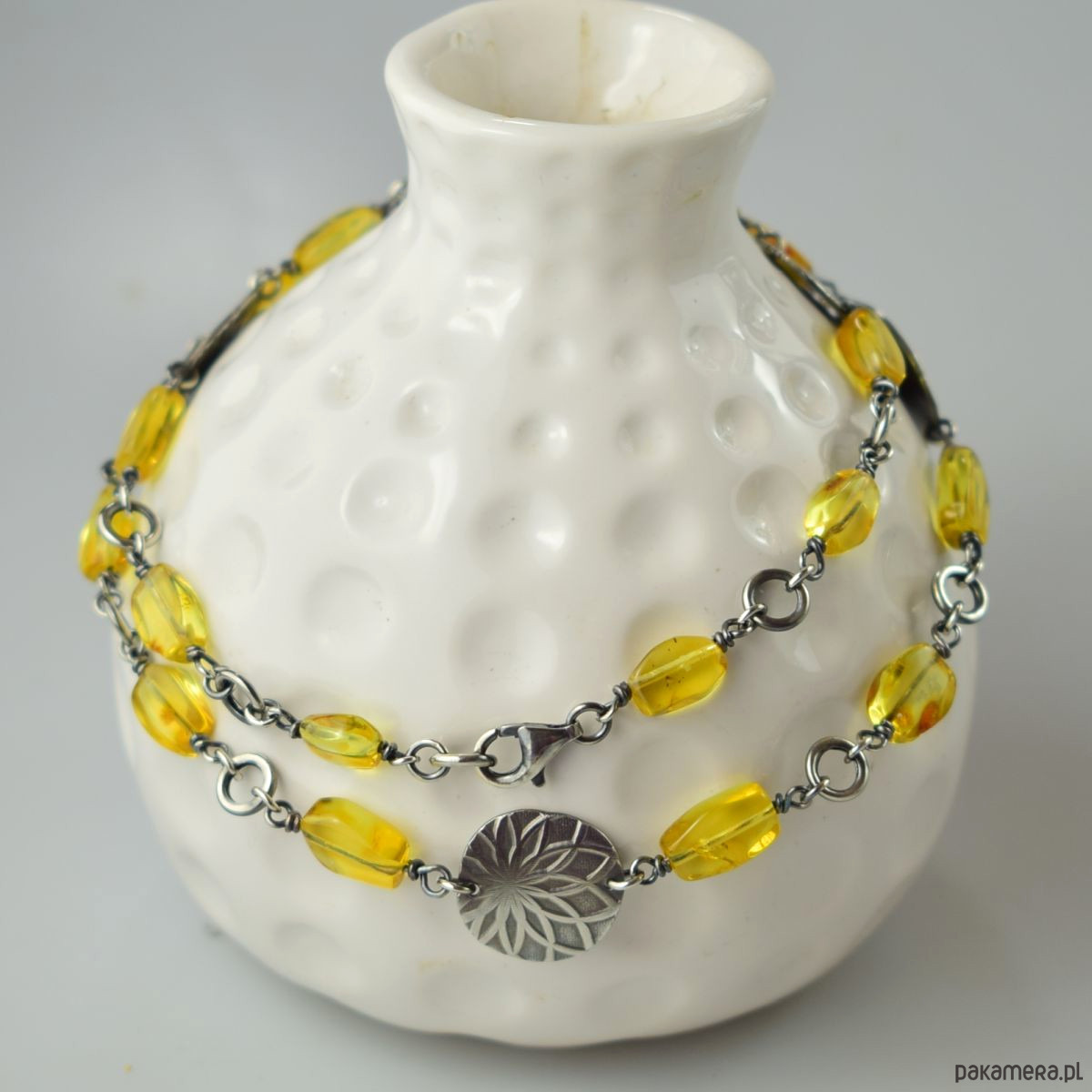 Naszyjnik wykonany w całości ze srebra (próba 925) z bursztynem. Całość została zoksydowana (przyciemniona) i wypolerowana. Długość 53 cm. Biżuteria zostanie ozdobnie zapakowana.