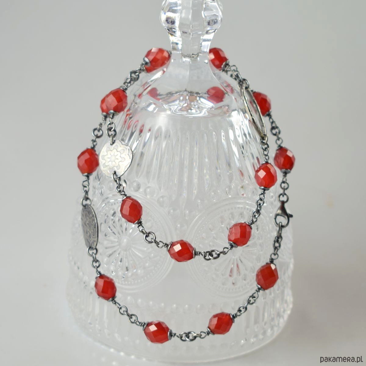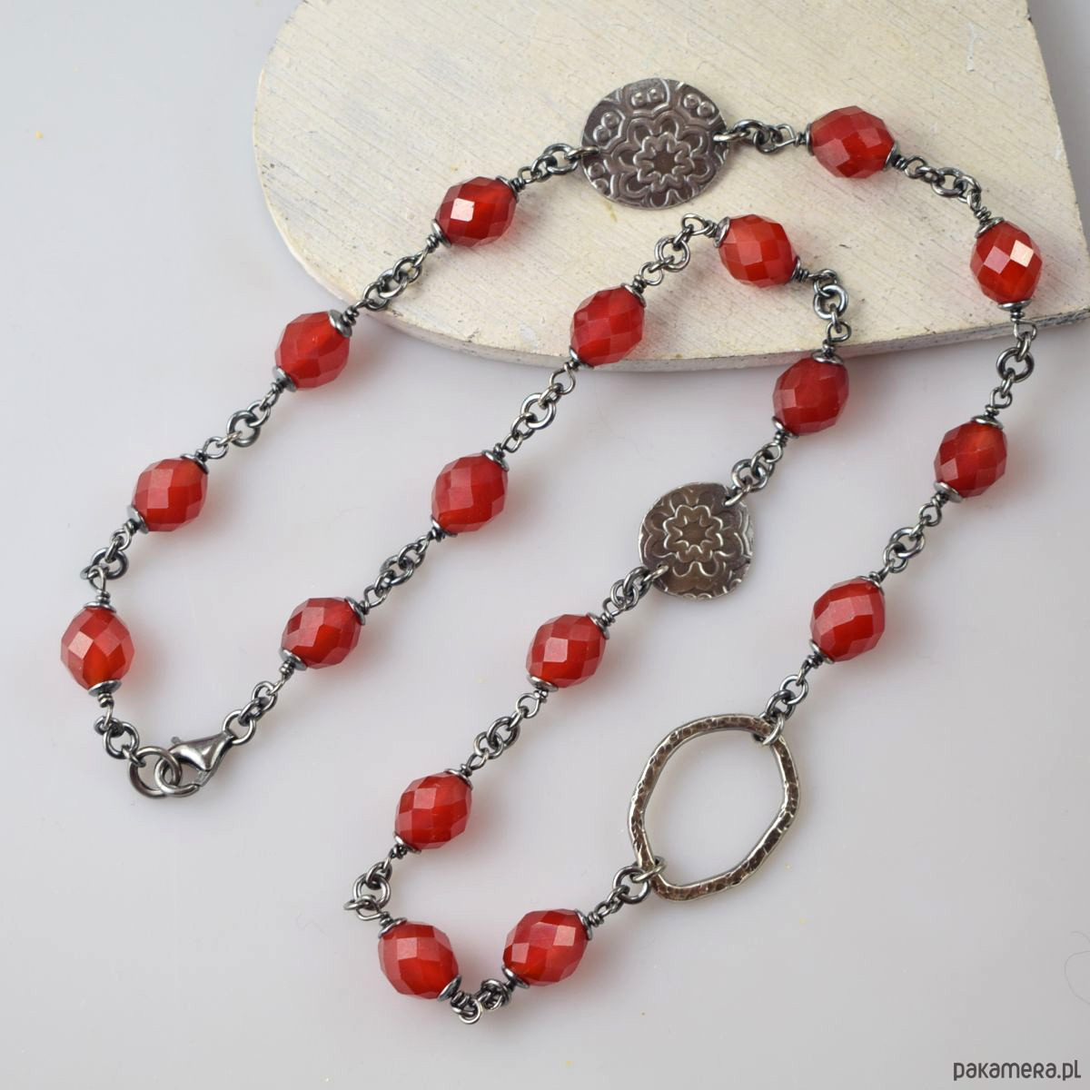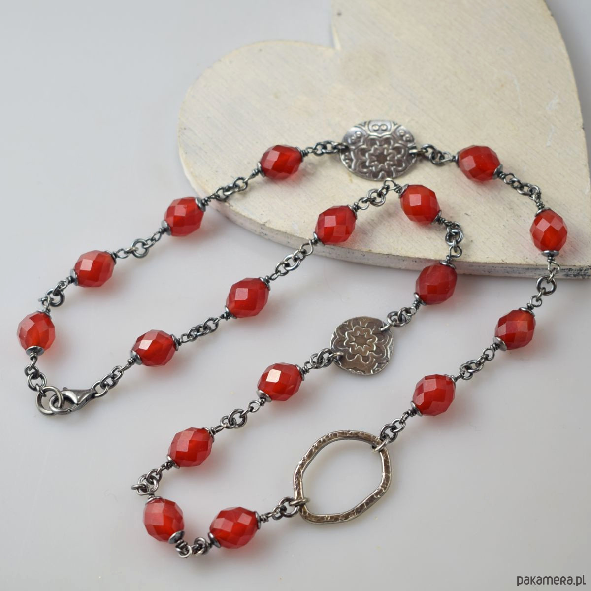 Naszyjnik wykonany w całości ze srebra (próba 925) z karneolem. Całość została zoksydowana (przyciemniona) i wypolerowana. Długość 52 cm. Biżuteria zostanie ozdobnie zapakowana.