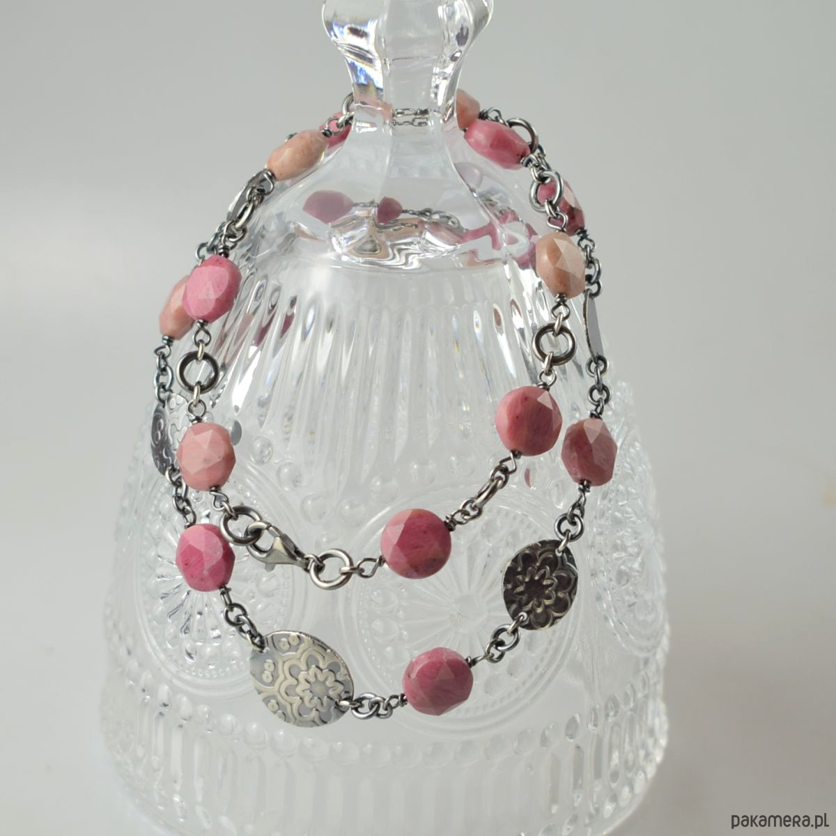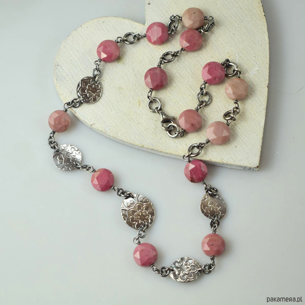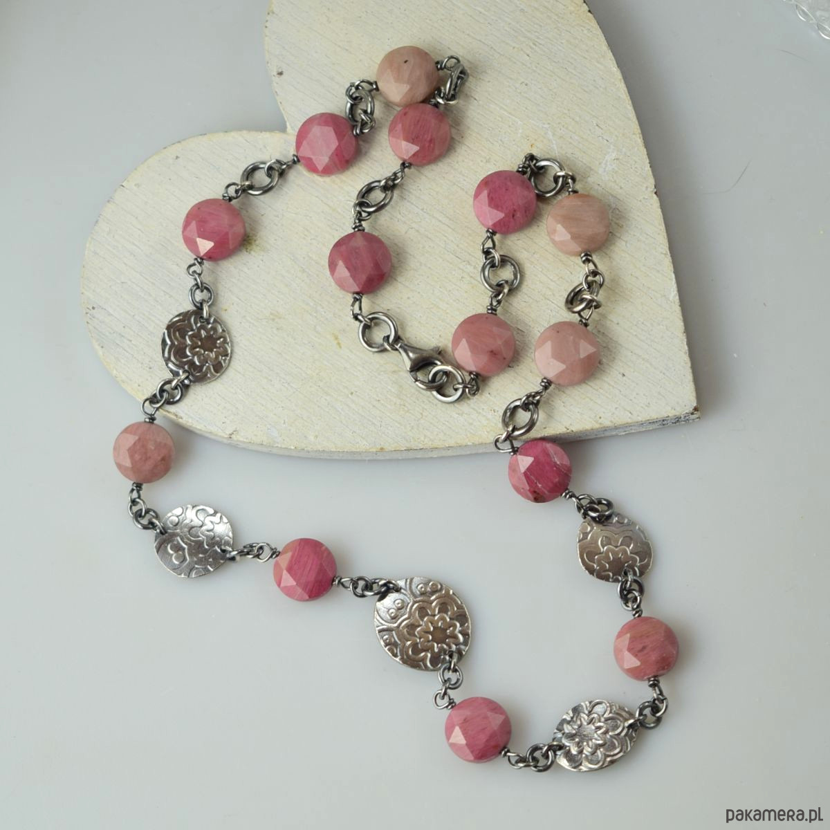 Naszyjnik wykonany w całości ze srebra (próba 925) z rodonitem. Całość została zoksydowana (przyciemniona) i wypolerowana. Długość 46 cm. Biżuteria zostanie ozdobnie zapakowana.