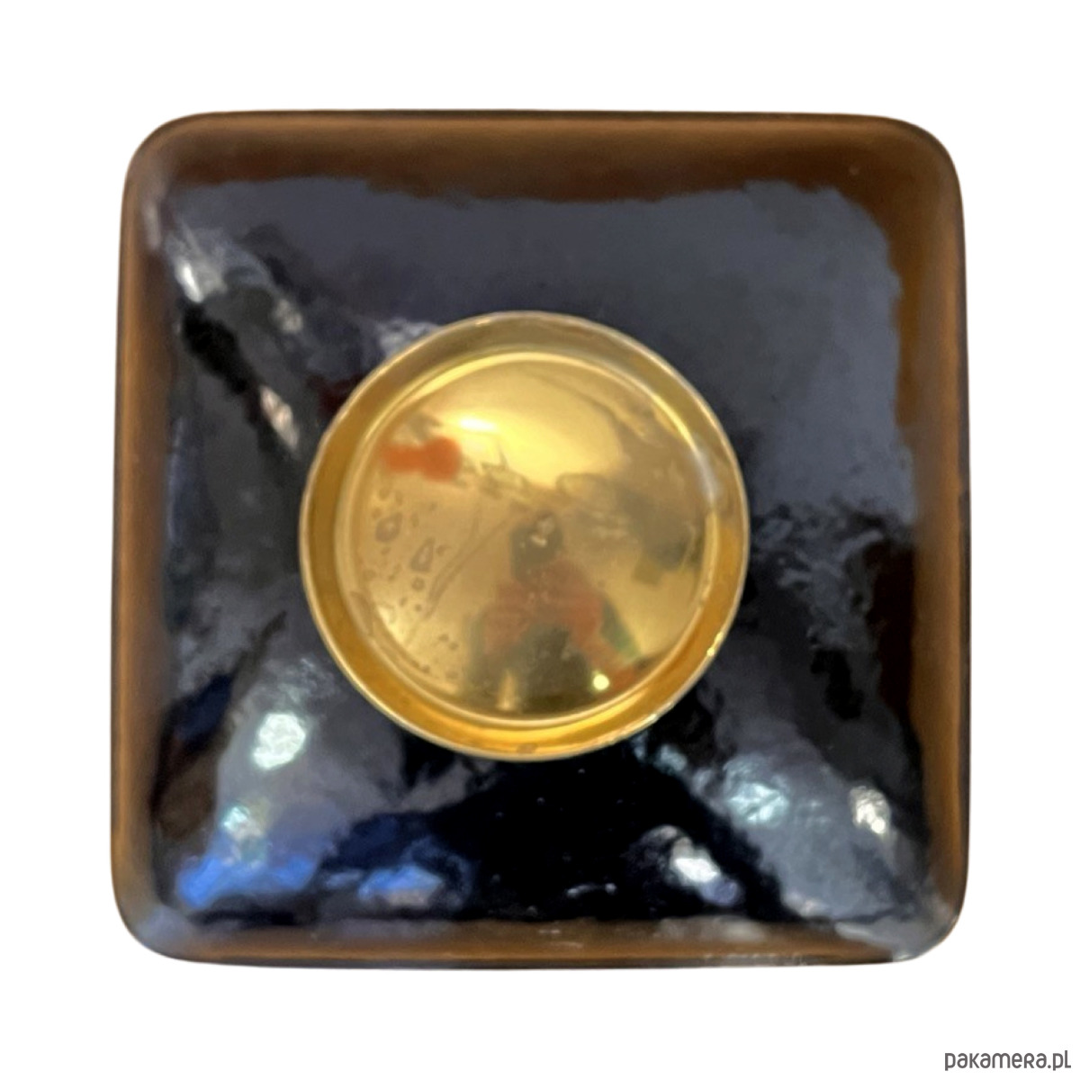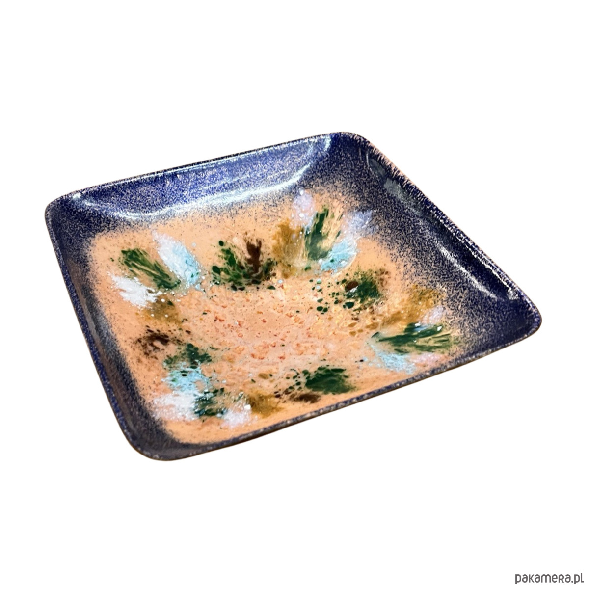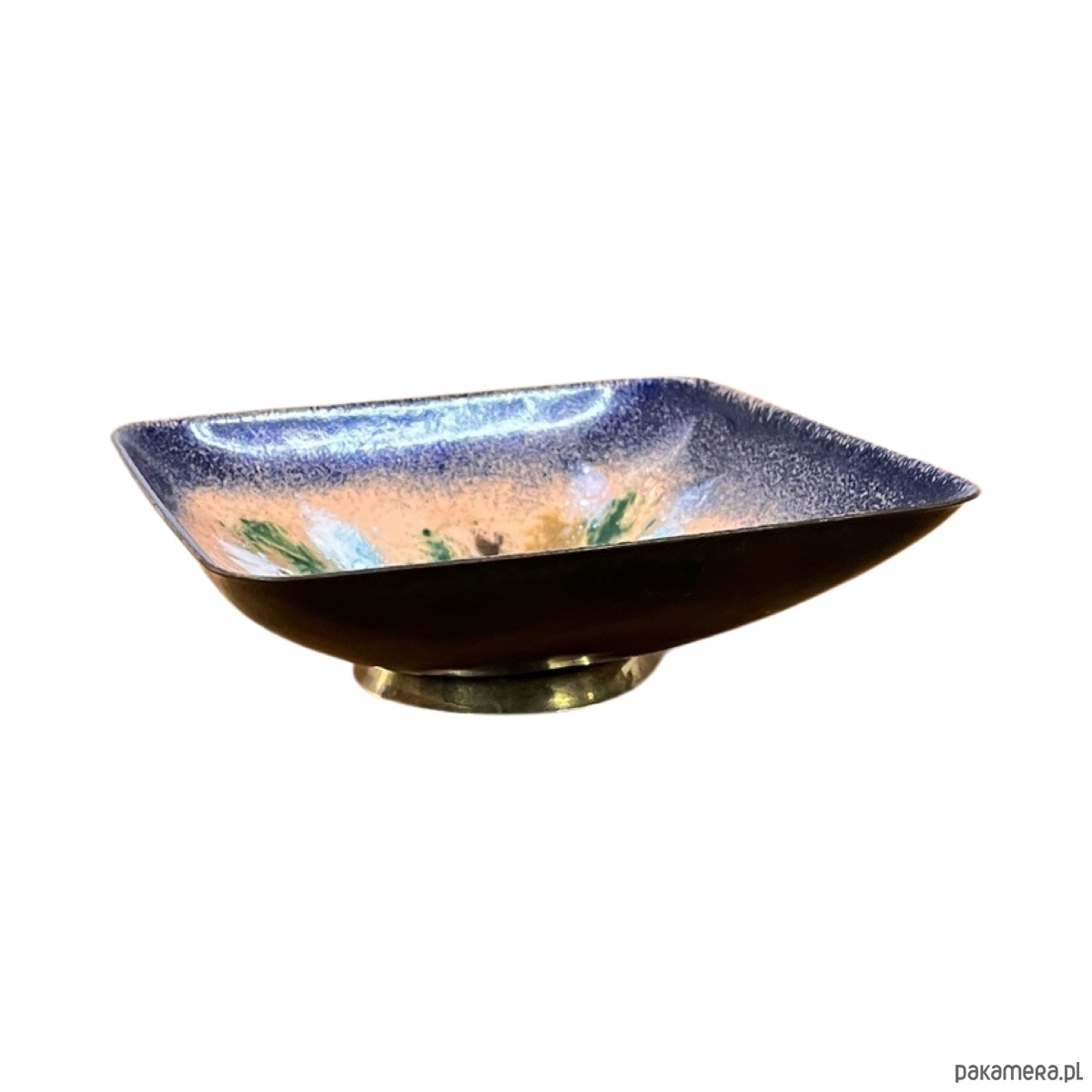 Miska lub patera miedziana została wyprodukowana w Niemczech na przełomie lat 50. i 60. Talerzyk powleczony jest ręcznie zdobioną emalią. Klasyczny przedmiot dekoracyjny, charakterystyczny dla Niemiec Wschodnich z połowy XX wieku. Przedmiot w stanie bardzo dobrym, ma niewielkie rysy na powierzchni emaliowanej. podstawa patery wykonana z mosiądzu.