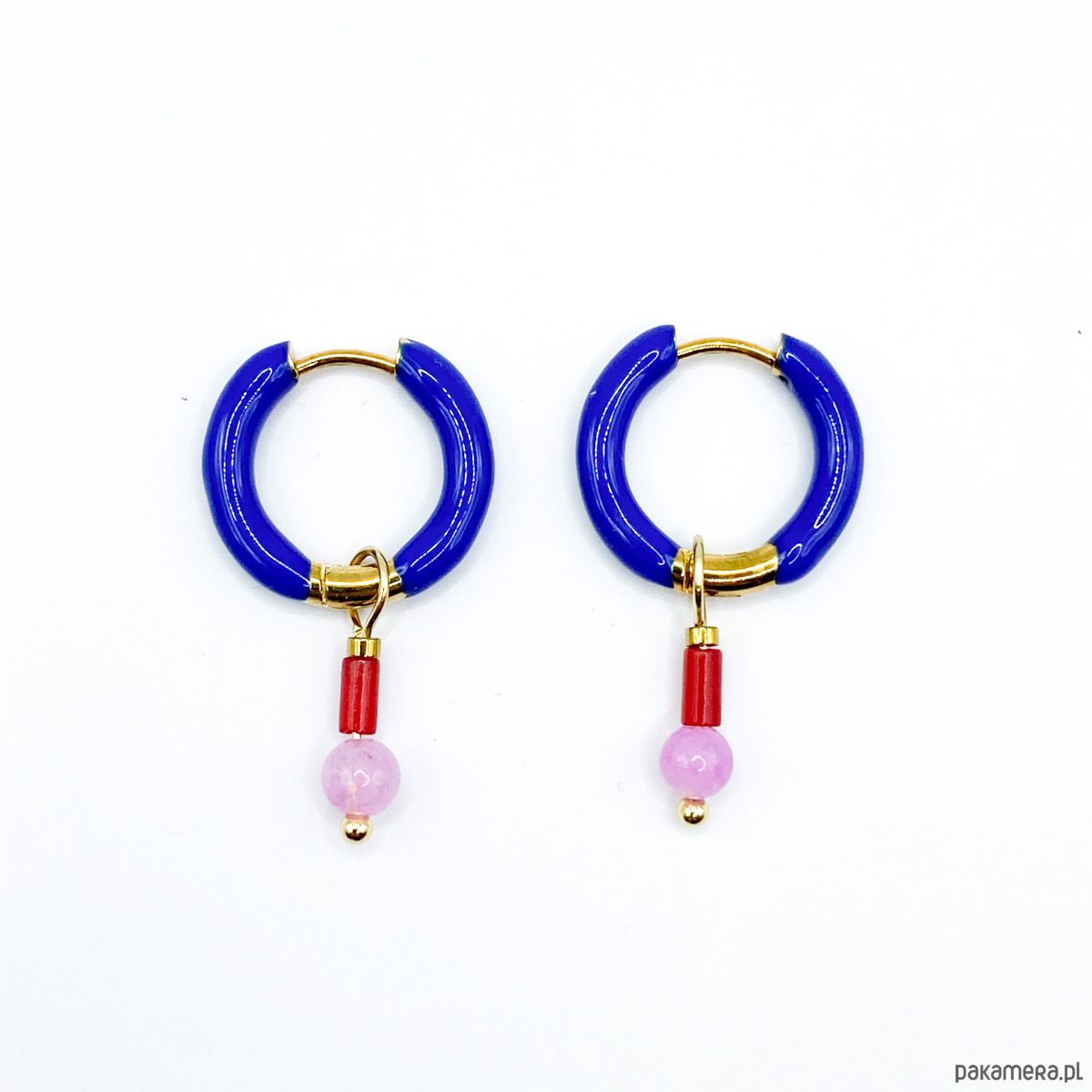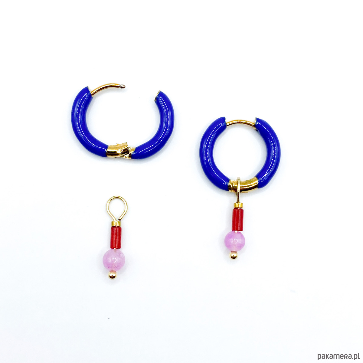 Wykonane ze stali bigle, w kolorze złotym, pokryte częściowo ciemno niebieską emalią, zamykane na ‘klik’, z zawieszką z minerałów, którą można , w razie potrzeby lub chęci, swobodnie zsuwać z kółka i nosić samą kolorową bazę.