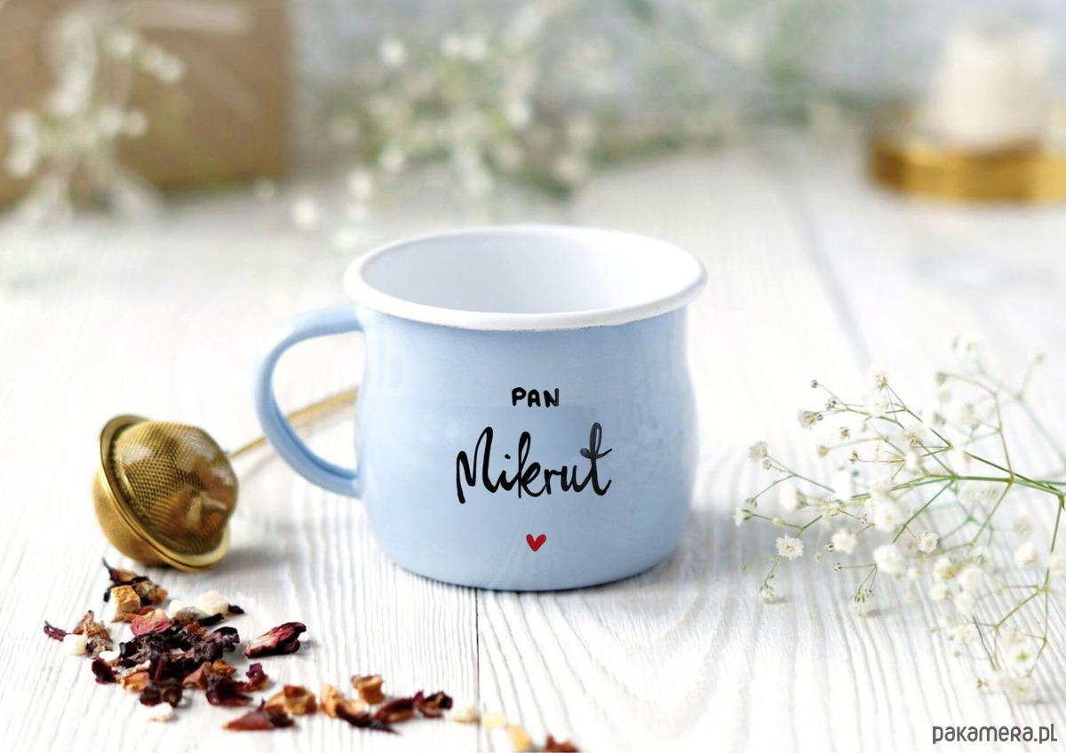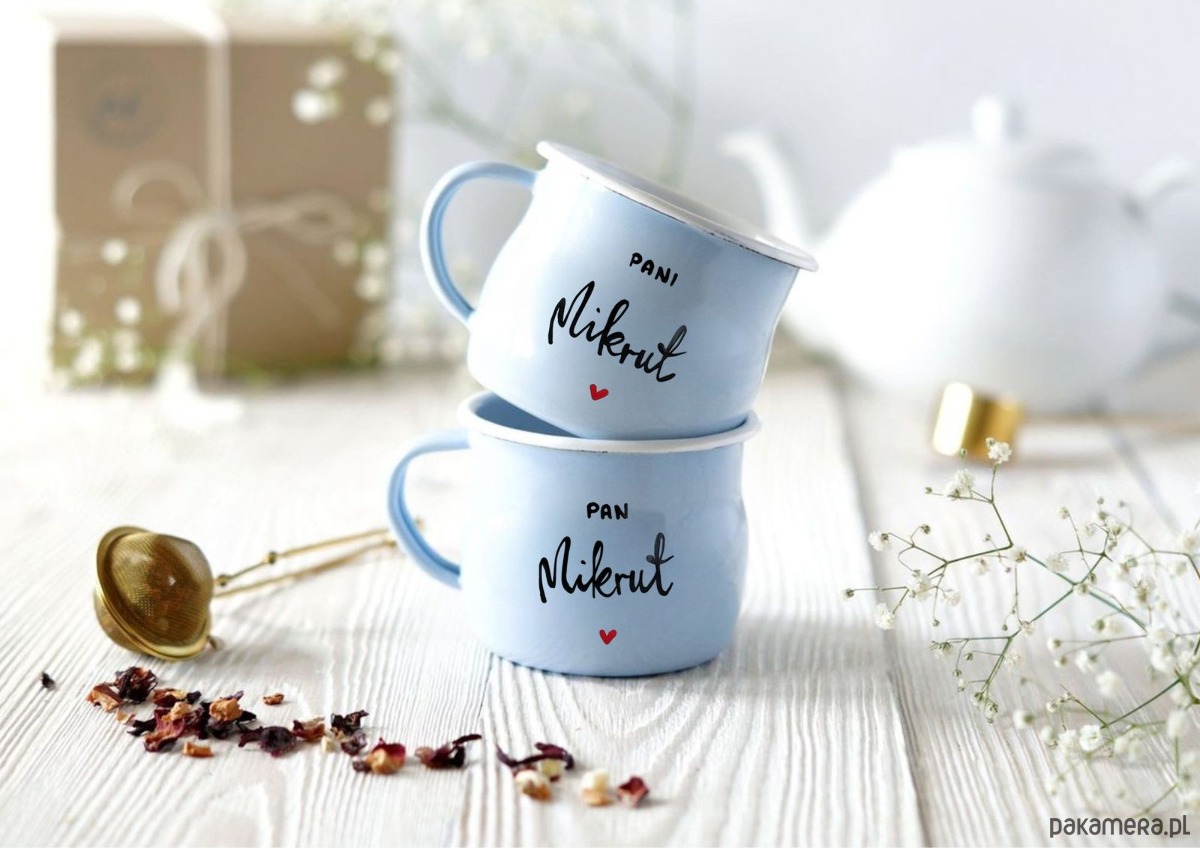 Pamiątkowe kubki emaliowane z nowym nazwiskiem nowożeńców.