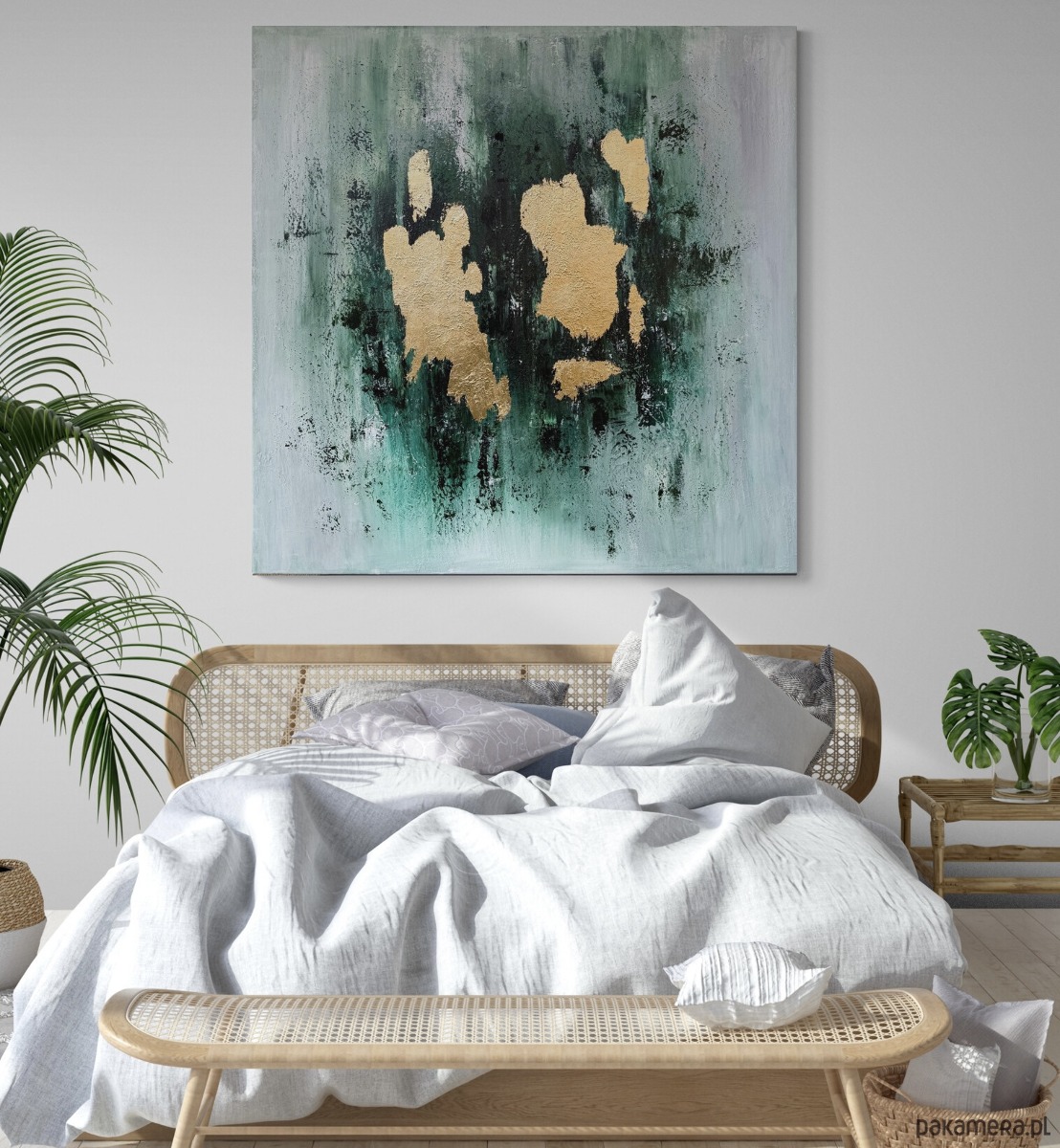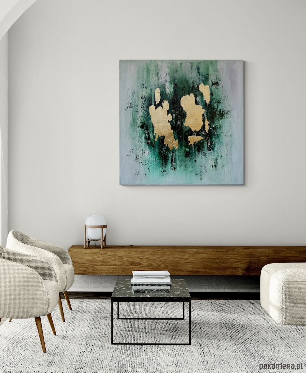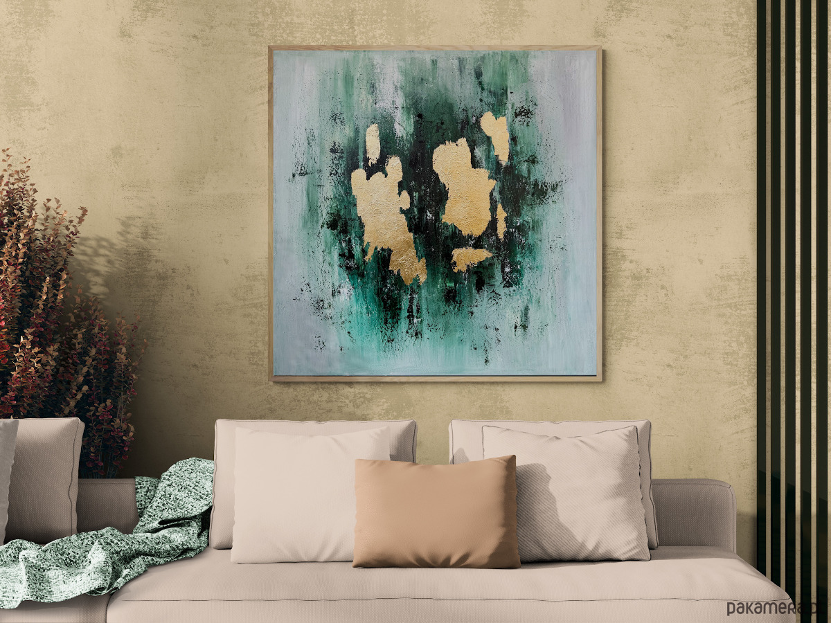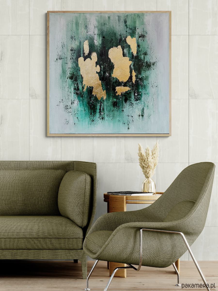 Abstrakcja w wielu odcieniach zieleni i bieli ze złotymi akcentami.