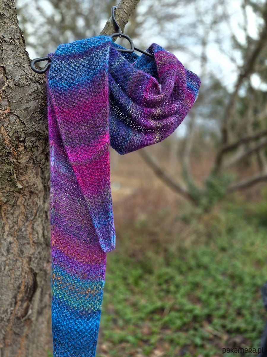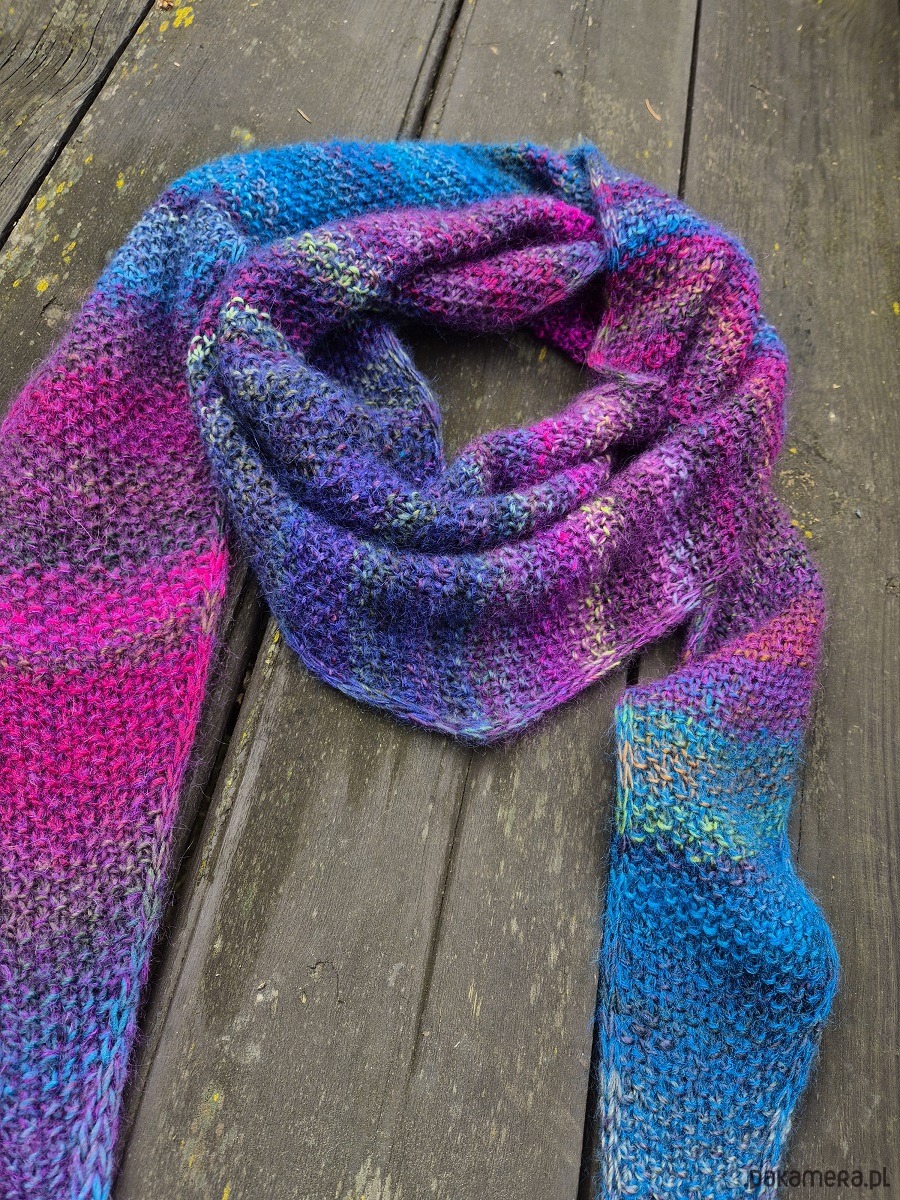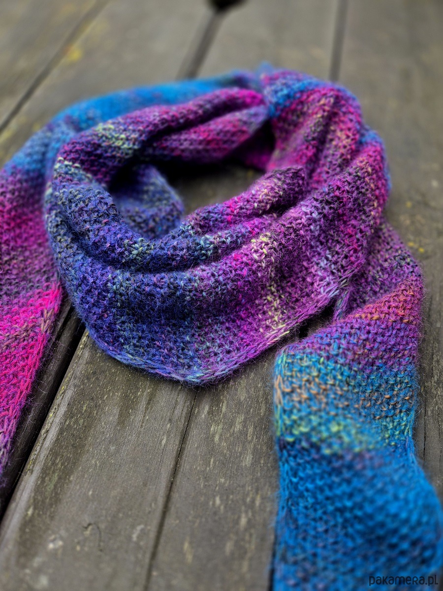 Miękka, puszysta chusta (szal w kształcie rozciągniętego trójkąta) wykonana ręcznie na drutach z wysokiej jakości włoskich włóczek.