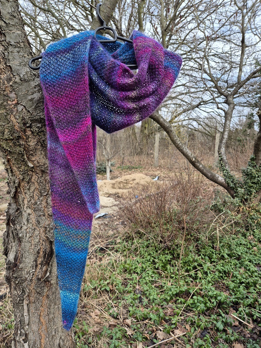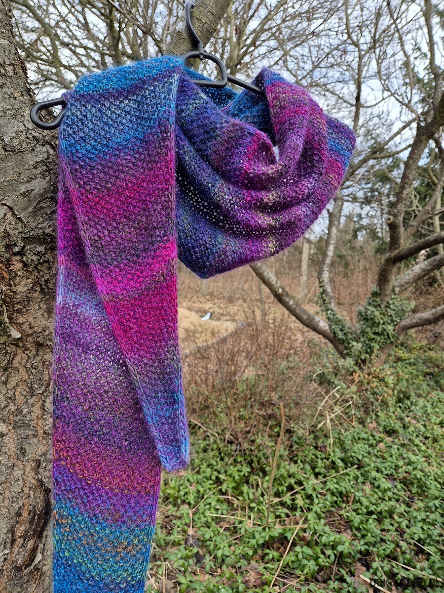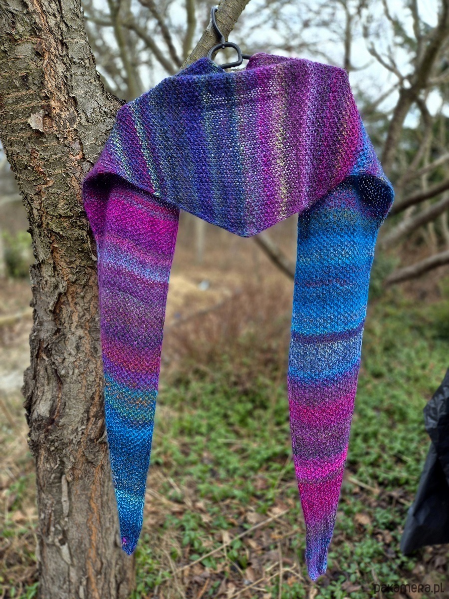 Miękka, puszysta chusta (szal w kształcie rozciągniętego trójkąta) wykonana ręcznie na drutach z wysokiej jakości włoskich włóczek.