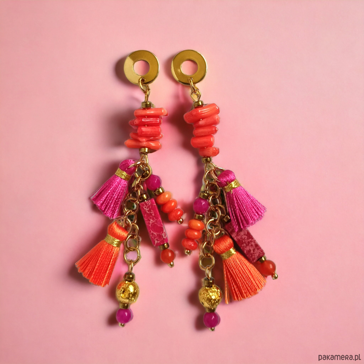 Kolczyki na ozdobnych sztyftach, wykonane ze starannie dobranych materiałów, w tym: koral, jadeit, agat, jaspis, chwosty, złoty hematyt, złota ława.