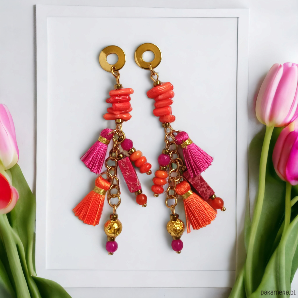 Kolczyki na ozdobnych sztyftach, wykonane ze starannie dobranych materiałów, w tym: koral, jadeit, agat, jaspis, chwosty, złoty hematyt, złota ława.