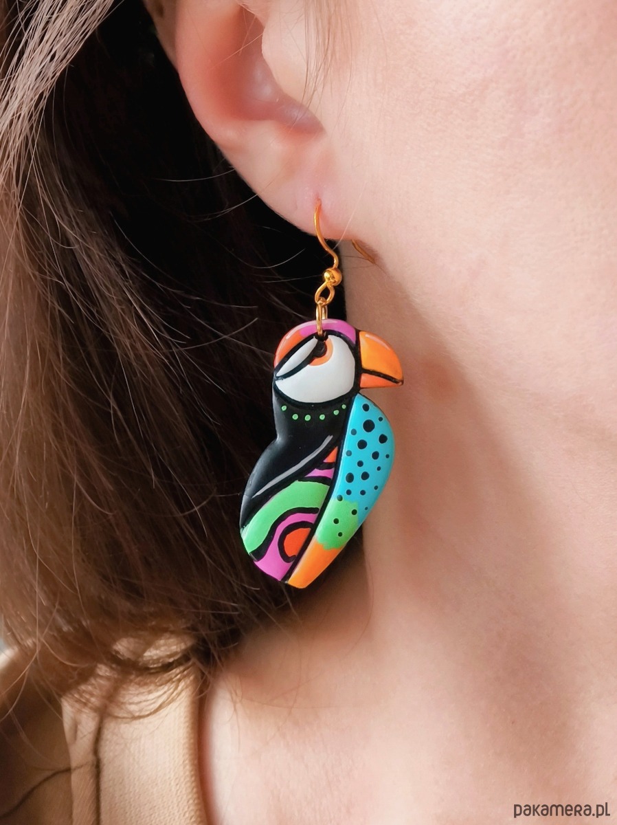 Kolorowe, wiszące kolczyki z abstrakcyjnym maskonurem to biżuteria, która przyciąga spojrzenia i dodaje stylizacji radości. Intensywne barwy i artystyczna forma inspirowana naturą sprawiają, że kolczyki są lekkie, wesołe i pełne charakteru. To idealny dodatek dla osób, które lubią oryginalną biżuterię handmade i subtelny artystyczny akcent.