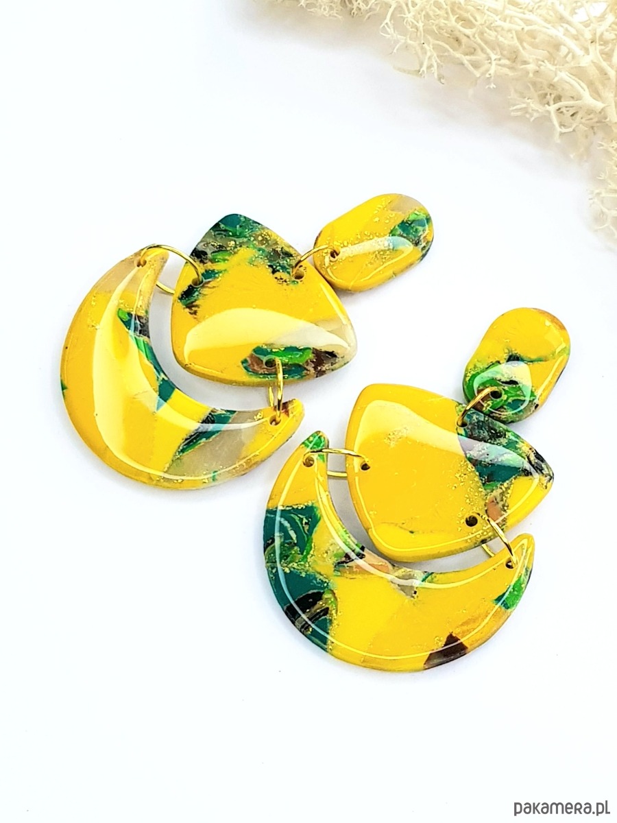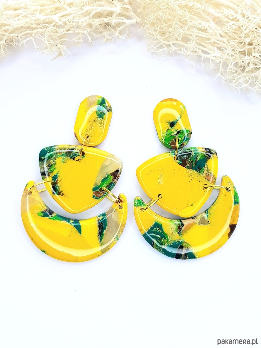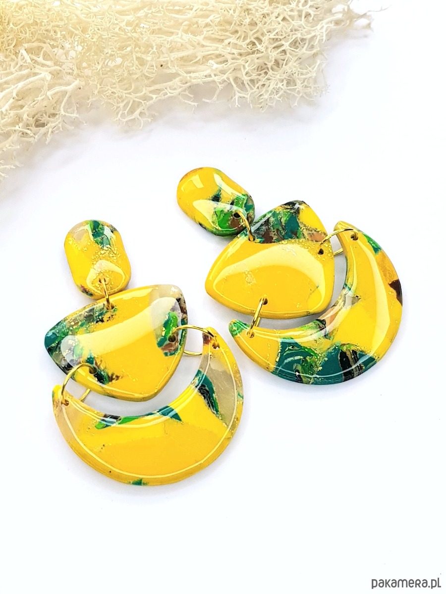 Cudownie przenikające się kolory żółci, zieleni i złota tworzą ciekawą strukturę i unikatową aranżację. Kolczyki są bardzo lekkie i wygodne.