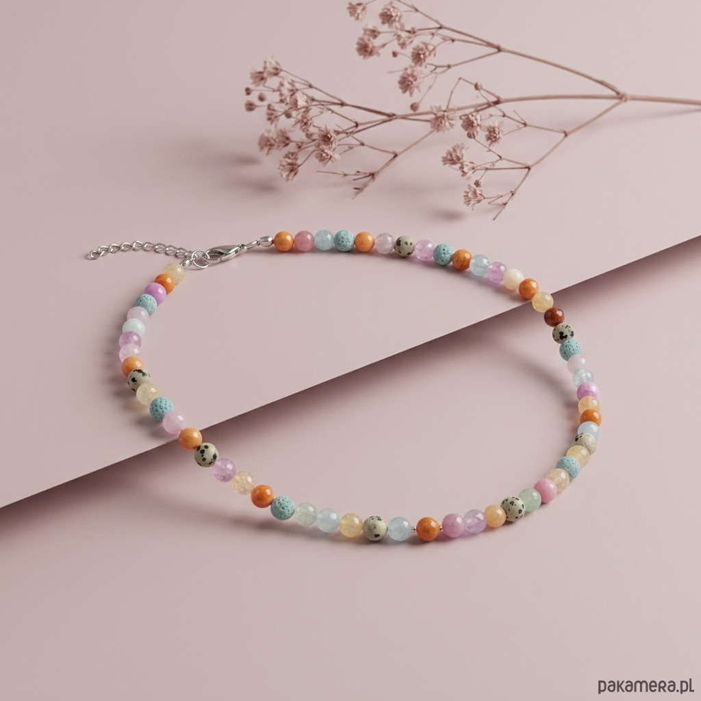 Wiosenny naszyjnik pełen energii i koloru, stworzony z połączenia jadeitu oraz jaspisu dalmatyńskiego. Soczyste i radosne barwy przyciągają wzrok, a jaspis przełamuje całą kompozycje swoją swobodną strukturą.