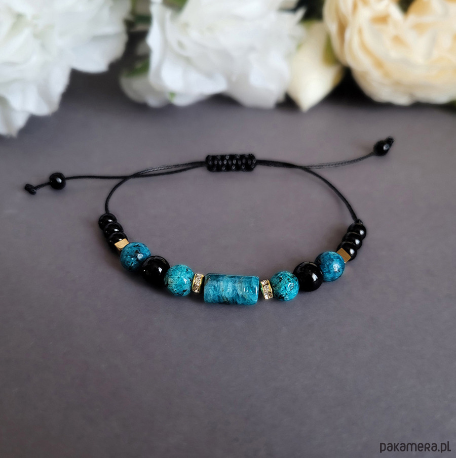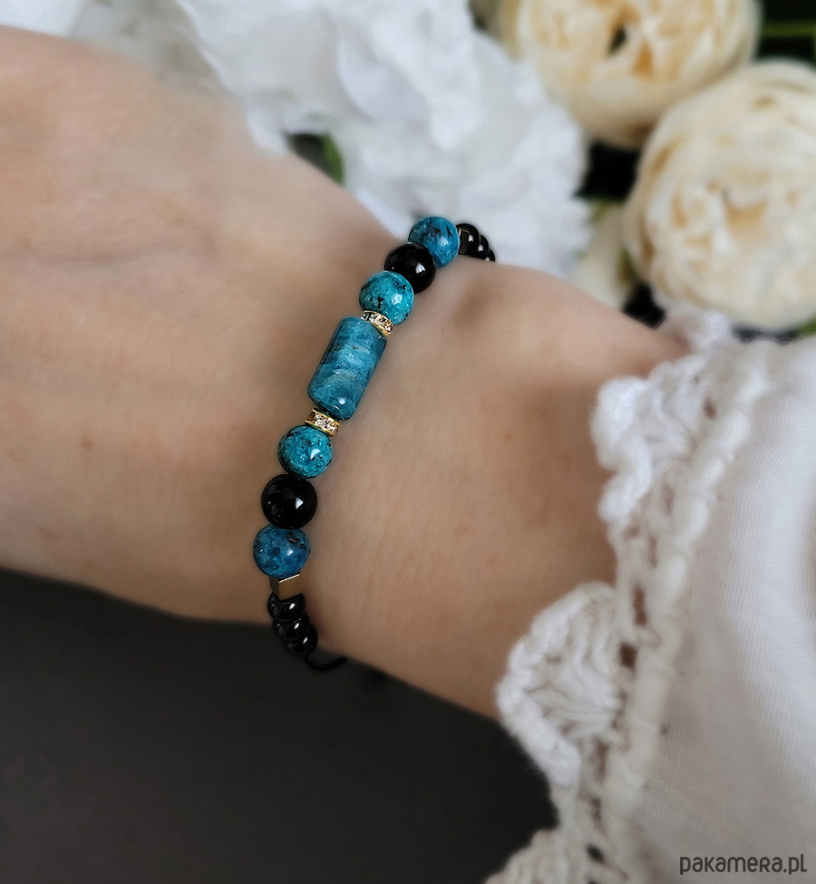 Piękna bransoletka zrobiona z kamieni naturalnych: Apatytu, Obsydianu, Jaspisu oraz Hematytu.