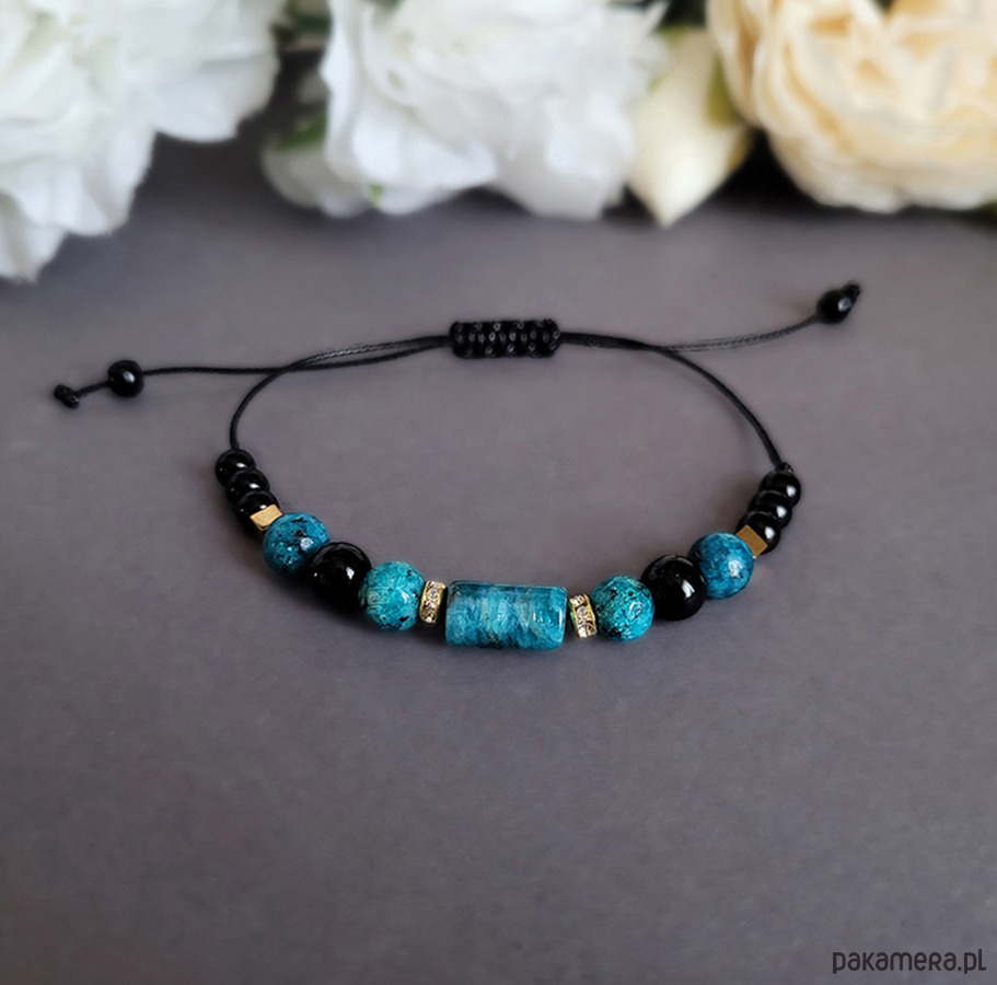 Piękna bransoletka zrobiona z kamieni naturalnych: Apatytu, Obsydianu, Jaspisu oraz Hematytu.
