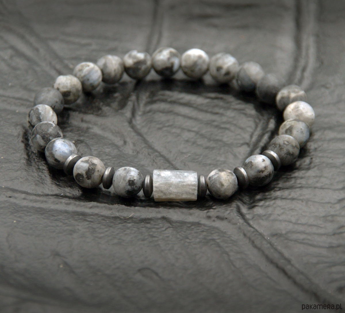 wykonana z matowego labradorytu (8mm) oraz surowej bryłki labradorytu (ok. 12-14mm) i przekładek z hematytu.