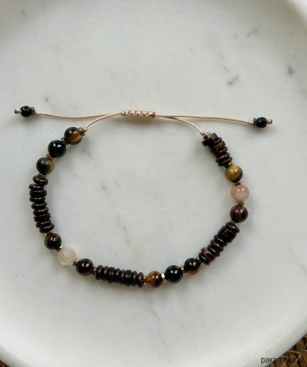 Męska bransoletka na regulowanym sznureczku z kokosowych koralików, Cytrynu, Tygrysiego Oka i kamienia słonecznego.