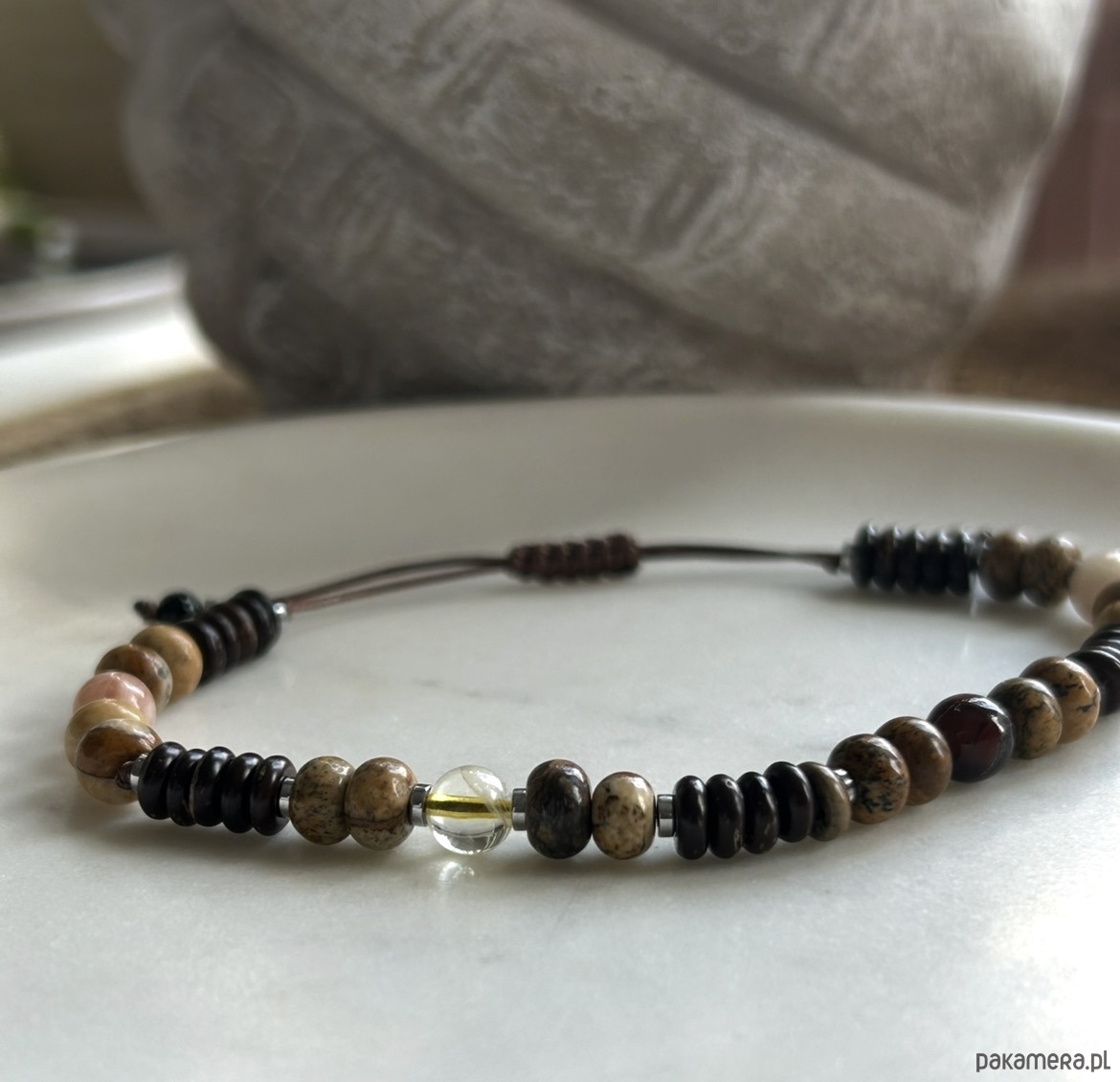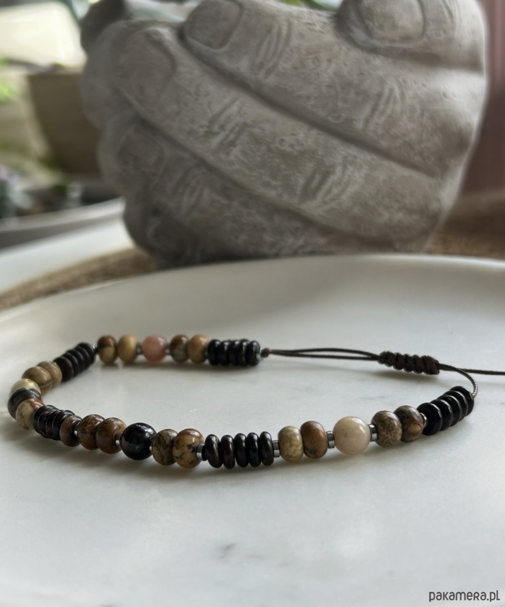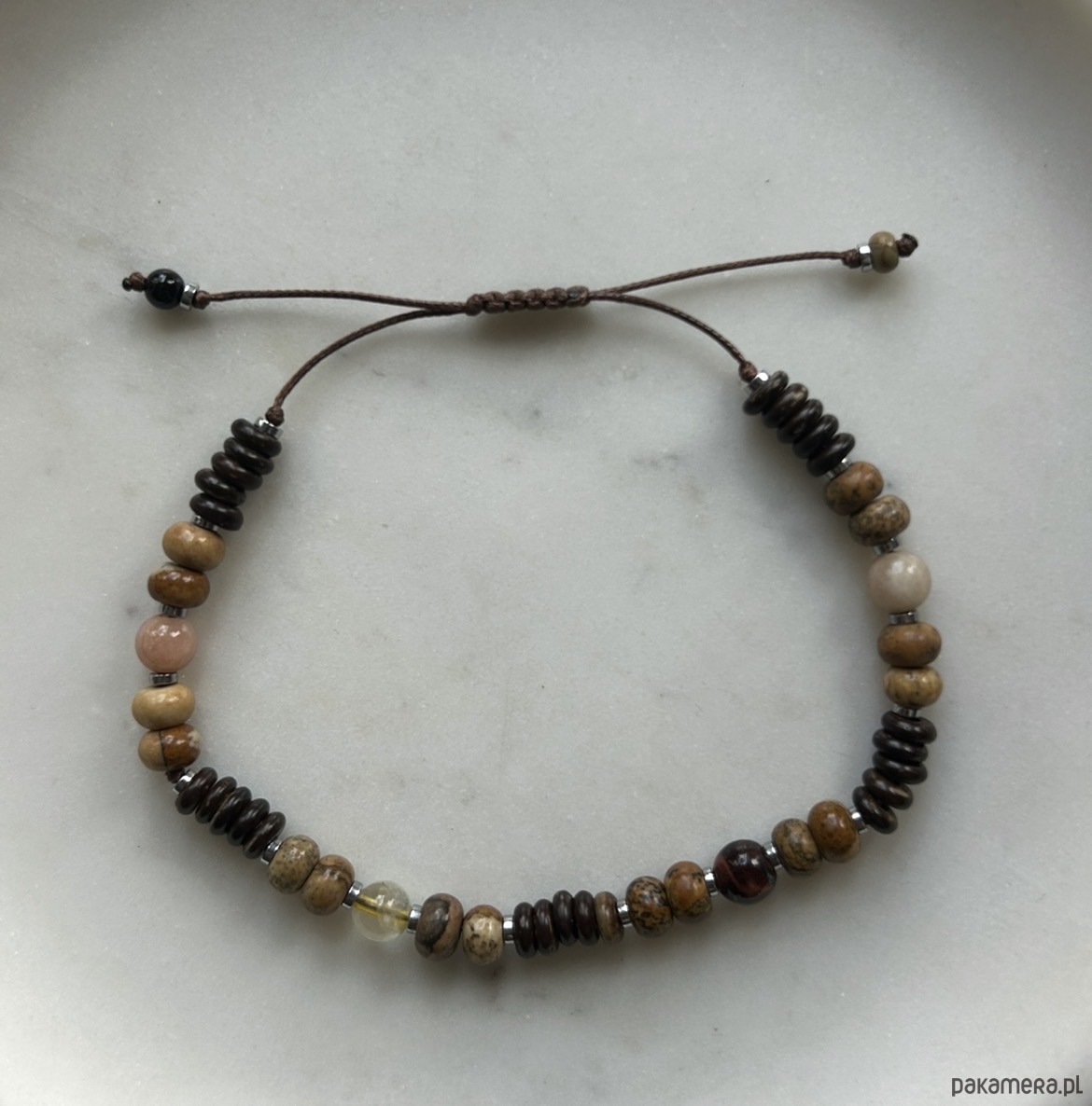 Męska bransoletka na regulowanym sznureczku z drewnianych koralików, Jaspisu , Tygrysiego Oka i kamienia słonecznego.