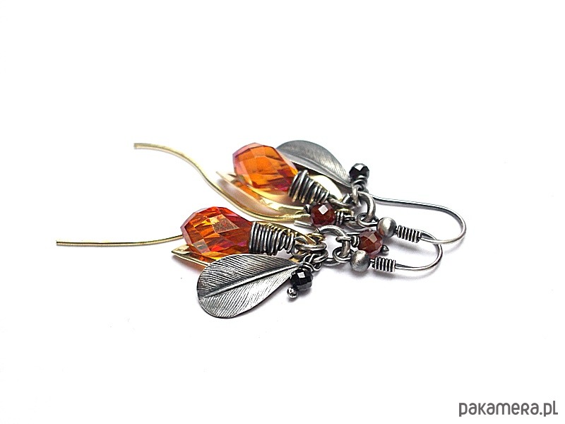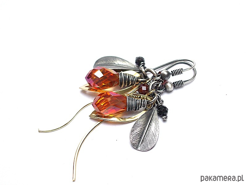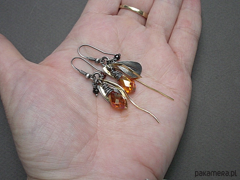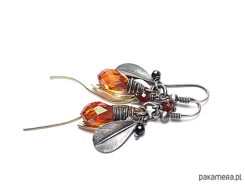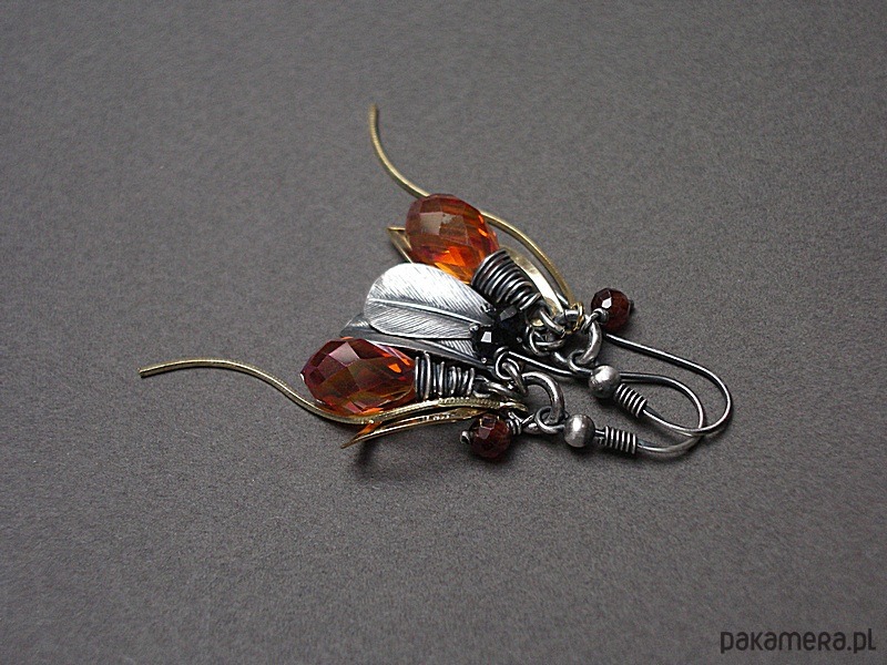 Kolczyki wykonane ze srebra i srebra pokrytego 24k złotem [pr. 925] w połączeniu z kryształkami oplecionymi drutem z czystego srebra [pr. 999],fasetowanymi kuleczkami granatów [4mm -hessonit] oraz kuleczkami spineli mystic [3mm]. Srebro częściowo oksydowane i przetarte. Całkowita długość kolczyków 6cm. Biżuteria ozdobnie zapakowana.