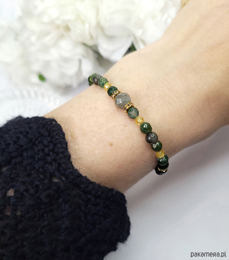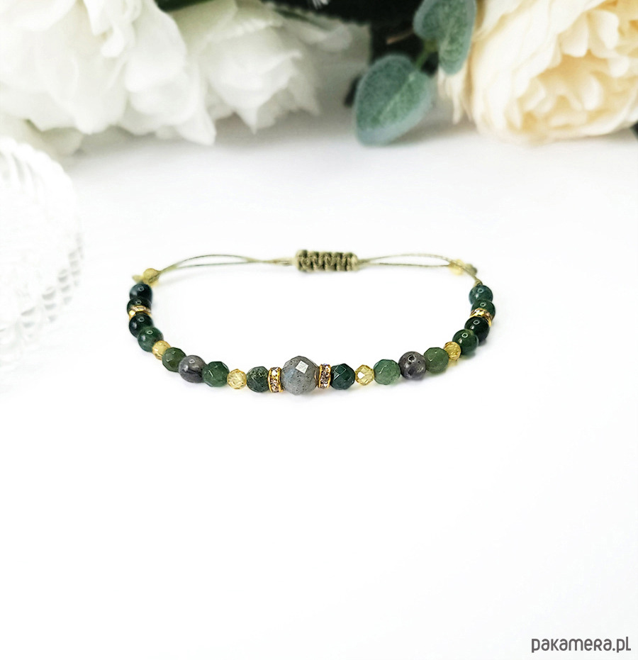 Bransoletka zrobiona z kamieni naturalnych: Labradorytu, Agatu mszystego oraz cudownie mieniących się Cyrkonii.