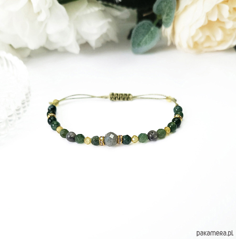 Bransoletka zrobiona z kamieni naturalnych: Labradorytu, Agatu mszystego oraz cudownie mieniących się Cyrkonii.