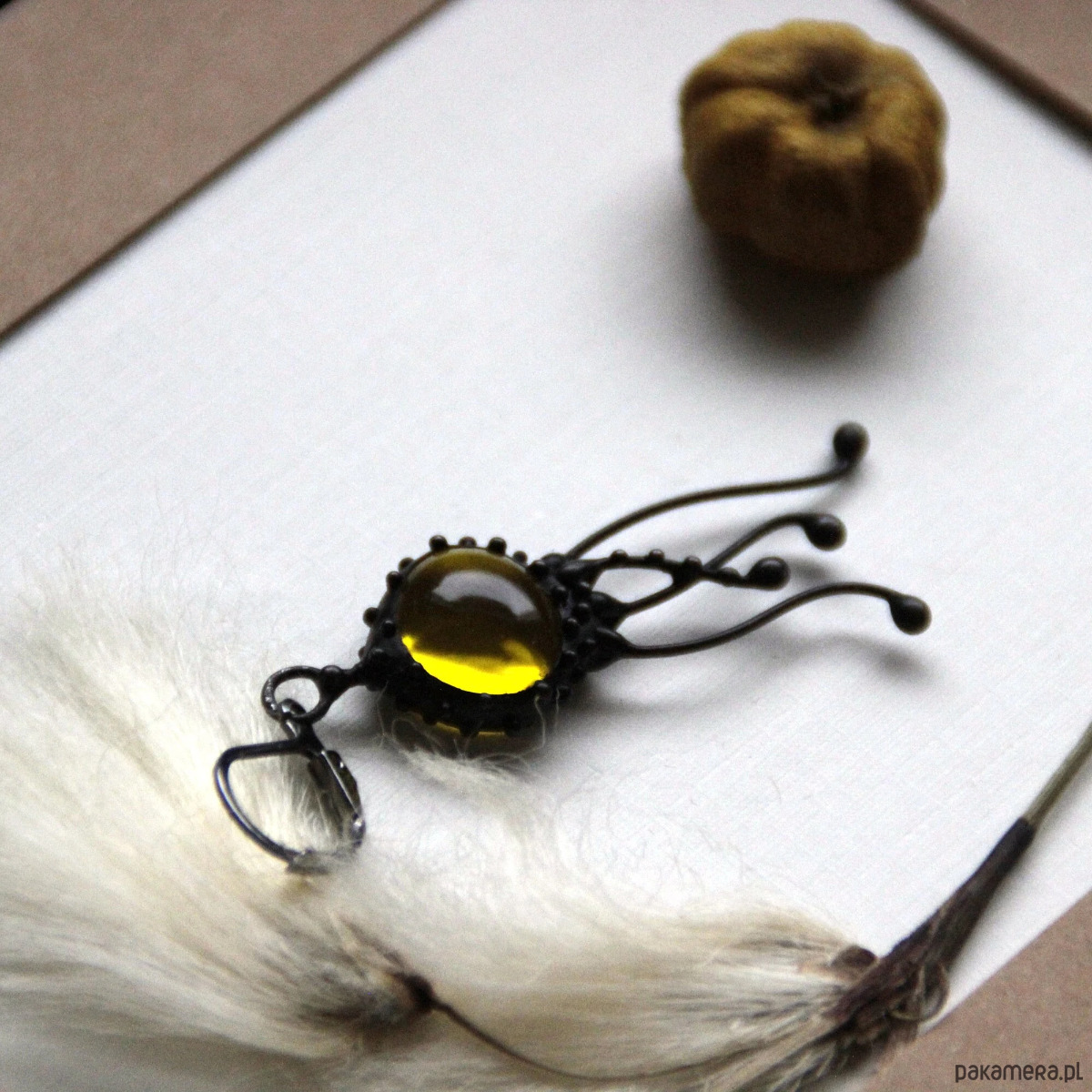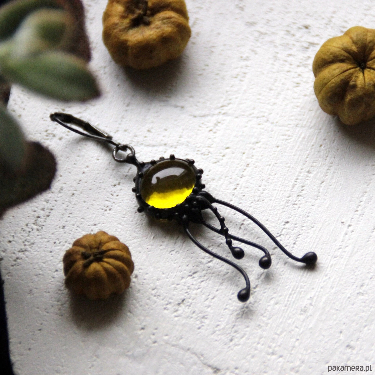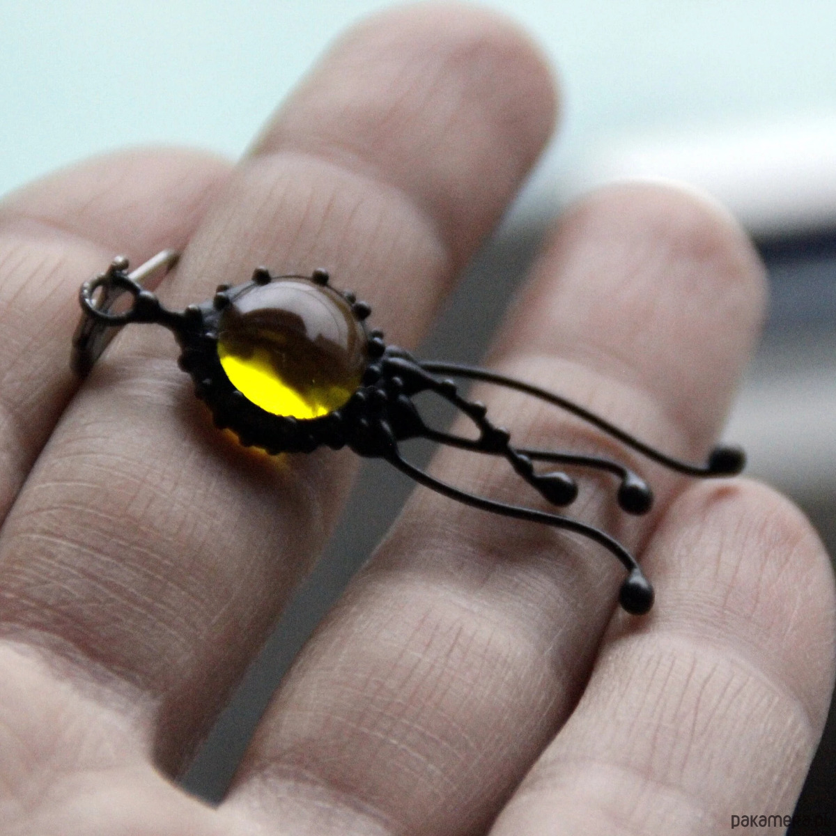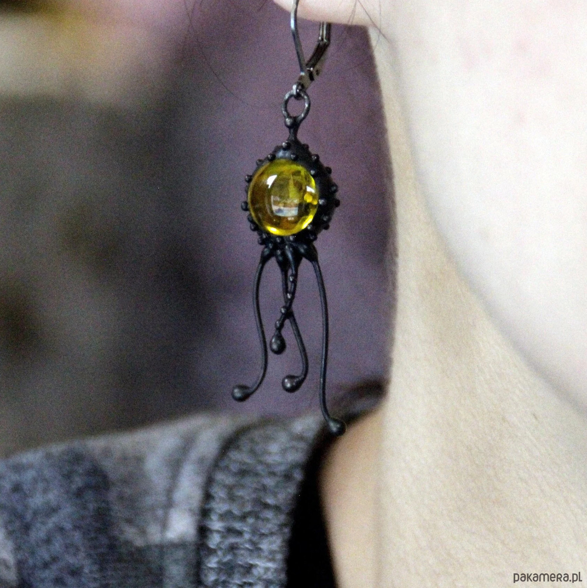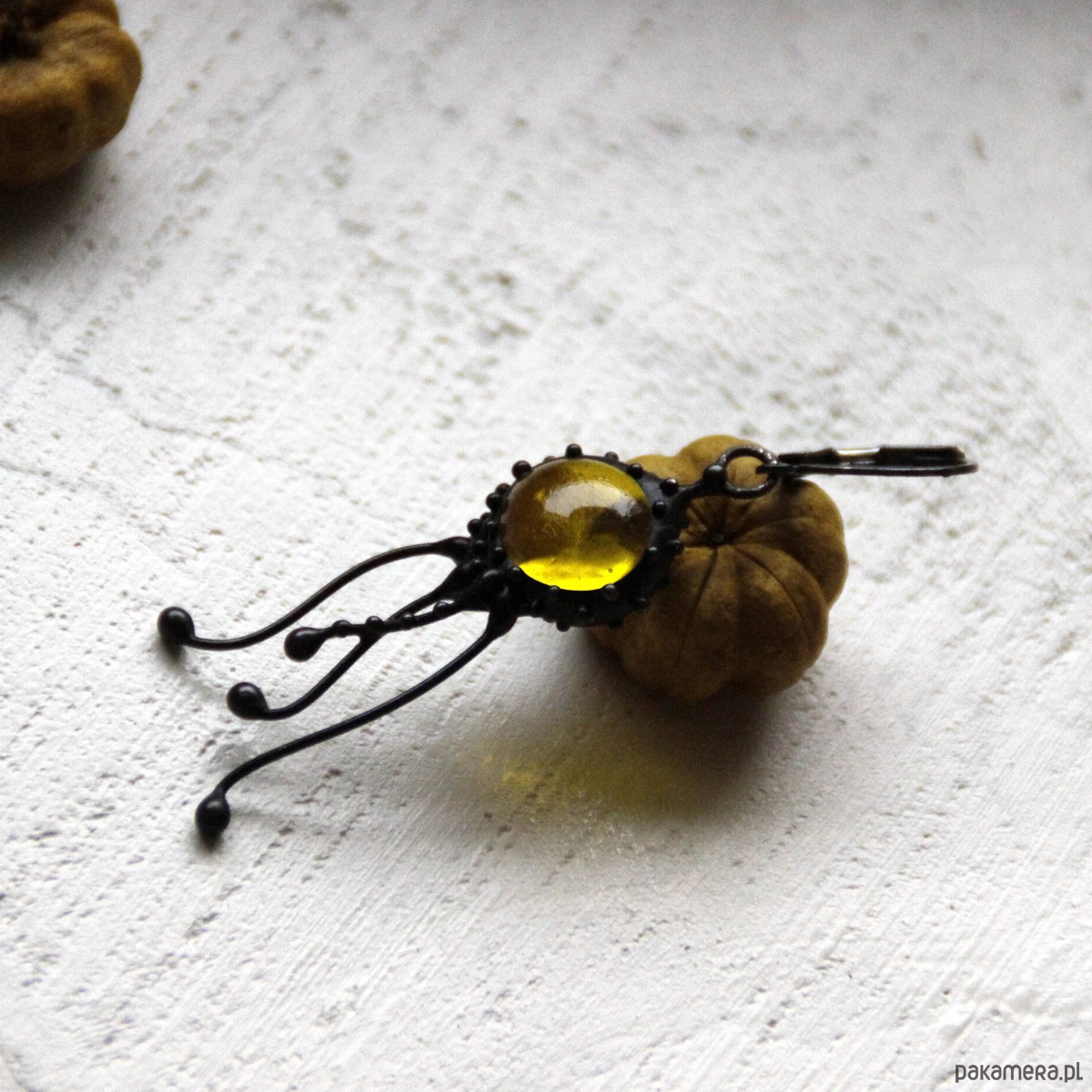 Kolczyk pojedynczy z motywem meduzy, wykonany ręcznie z miedzi, cyny, stali i żółtego szkła. Kolczyki są lekkie i wytrzymałe. Wszystkie elementy są ręcznie wykonane, co gwarantuje indywidualność każdego produktu wykonanego w pracowni Yadovito. Stop cyny i miedzi pokryty jest czarną patyną, która nadaje metalowi czarny kolor, a następnie polerowany roztworem wykończeniowym, aby nadać biżuterii szlachetny wygląd, a jednocześnie zapobiec utlenianiu się metalu. Rozmiar około 4/1 cm . Kolor czarny/żółty.