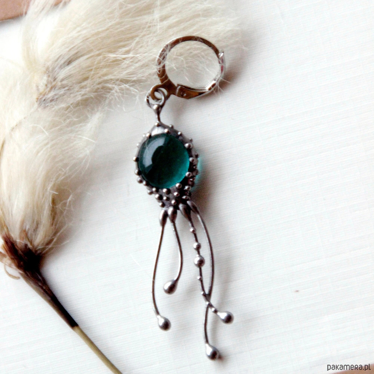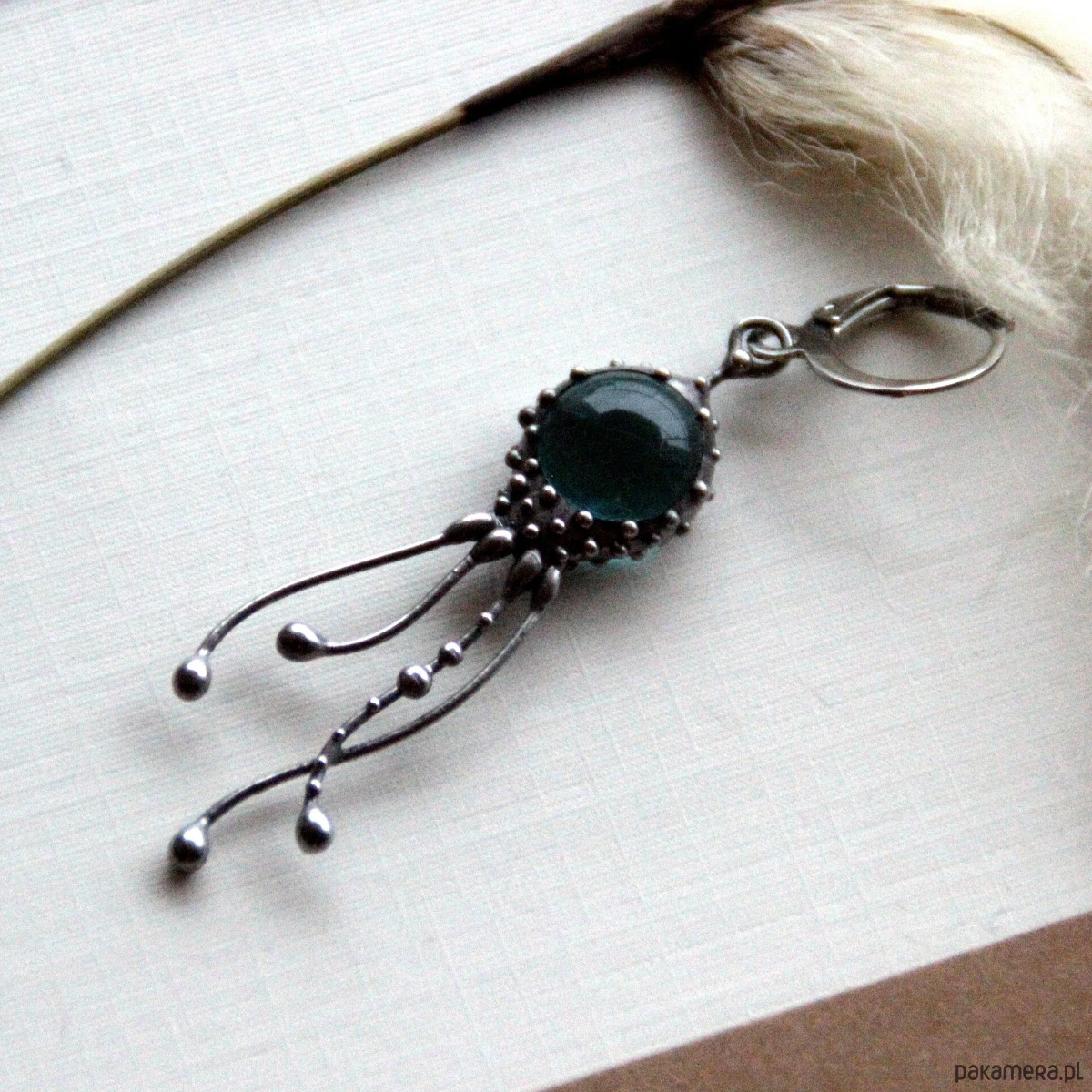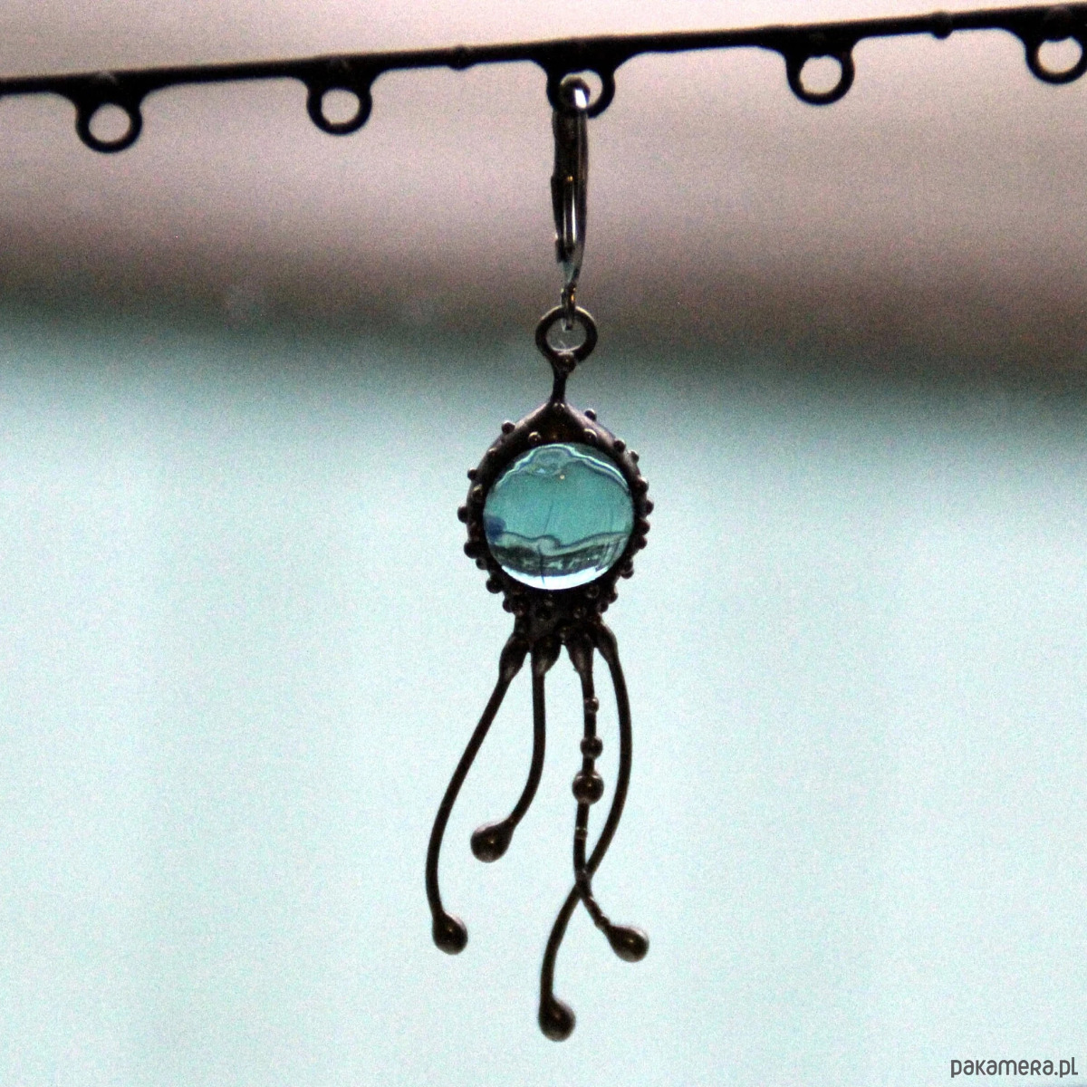 Kolczyk z motywem morskiego stworzenia w stylu psychodelicznym, wykonany ręcznie z miedzi, cyny, stali i niebieskiego szkła. Kolczyk jest lekki i wytrzymały, w stylu boho hippie ocean. Wszystkie elementy są wykonane ręcznie, co zapewnia indywidualność każdego produktu wytworzonego w warsztacie Yadovito. Stop cyny i miedzi jest polerowany roztworem wykończeniowym, aby nadać biżuterii szlachetny wygląd, a jednocześnie zapobiec utlenianiu się metalu. Rozmiar około 4/1 cm. Kolor srebrny/niebieski.
