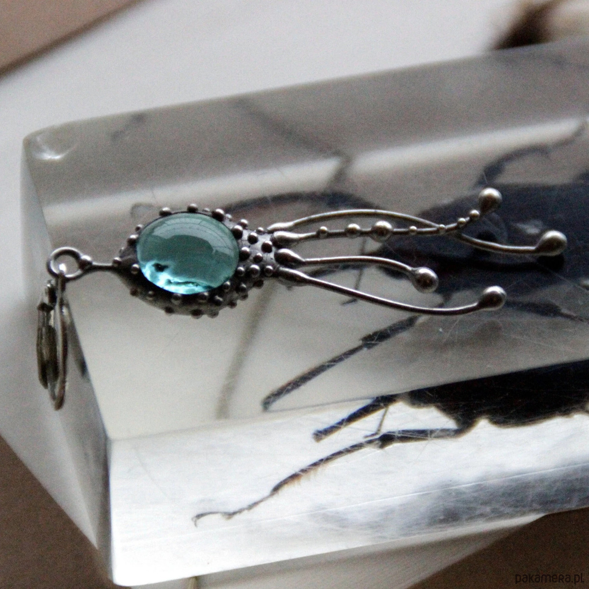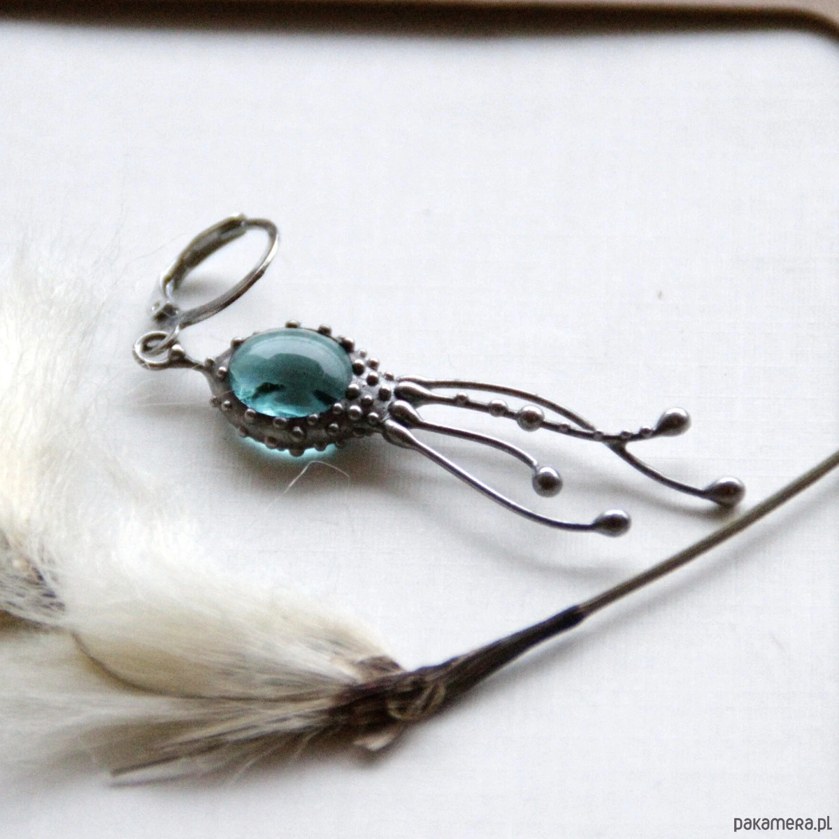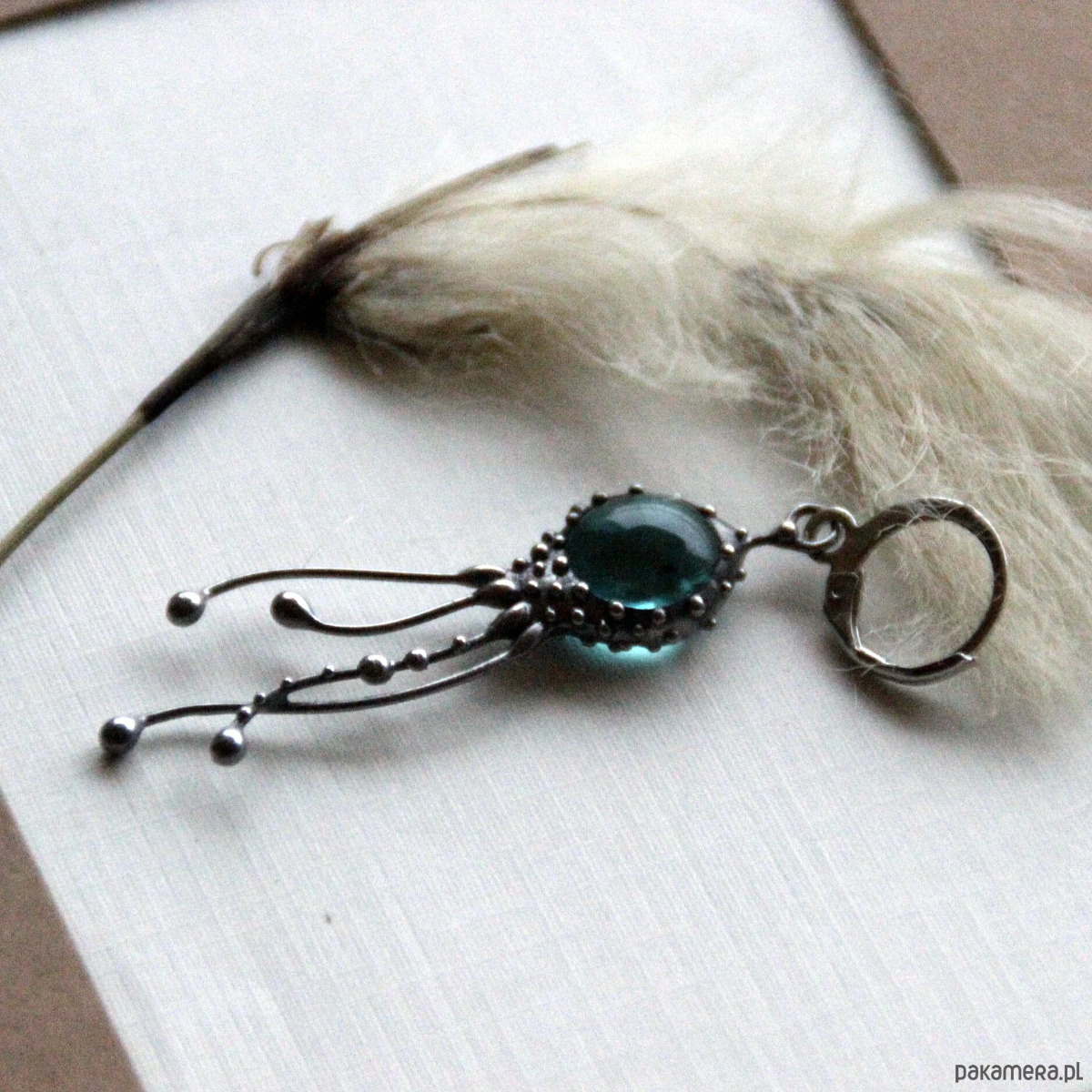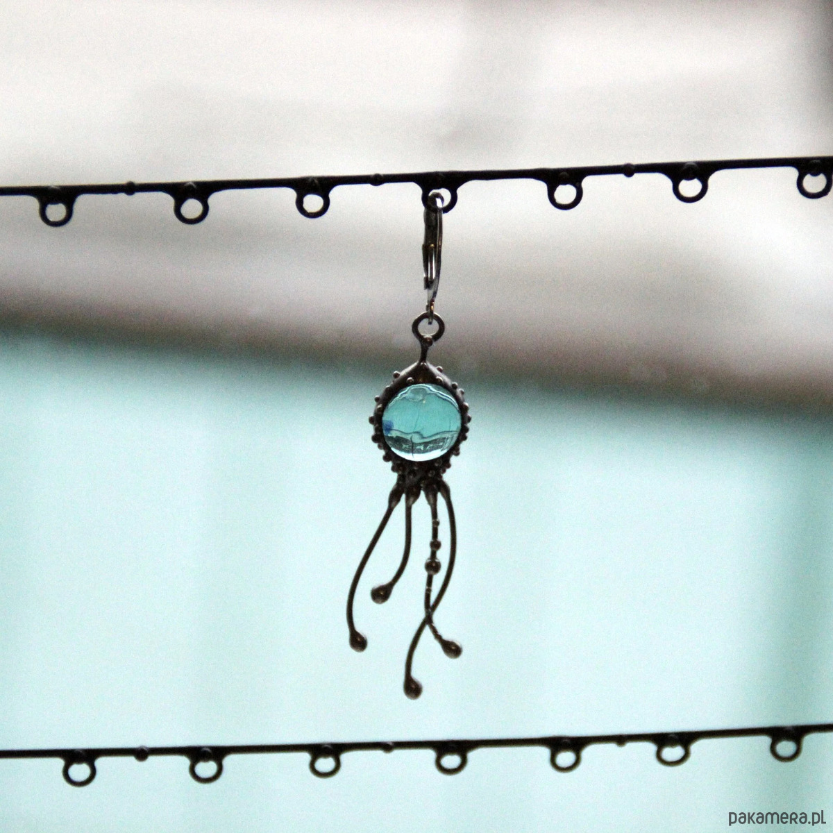 Kolczyk z motywem morskiego stworzenia w stylu psychodelicznym, wykonany ręcznie z miedzi, cyny, stali i niebieskiego szkła. Kolczyk jest lekki i wytrzymały, w stylu boho hippie ocean. Wszystkie elementy są wykonane ręcznie, co zapewnia indywidualność każdego produktu wytworzonego w warsztacie Yadovito. Stop cyny i miedzi jest polerowany roztworem wykończeniowym, aby nadać biżuterii szlachetny wygląd, a jednocześnie zapobiec utlenianiu się metalu. Rozmiar około 4/1 cm. Kolor srebrny/niebieski.