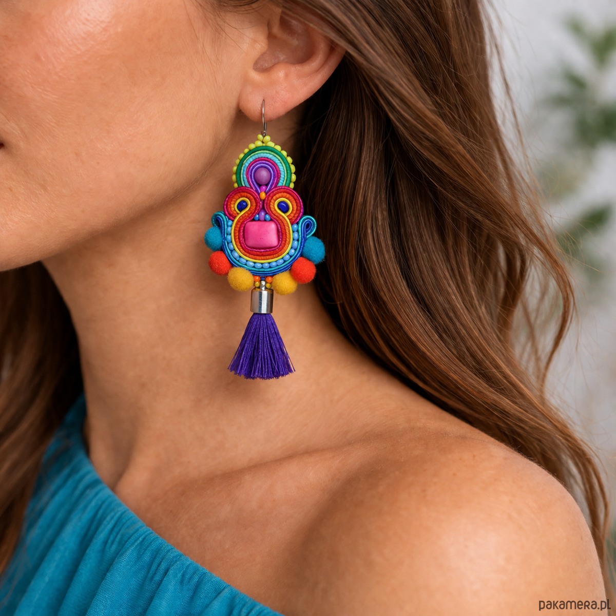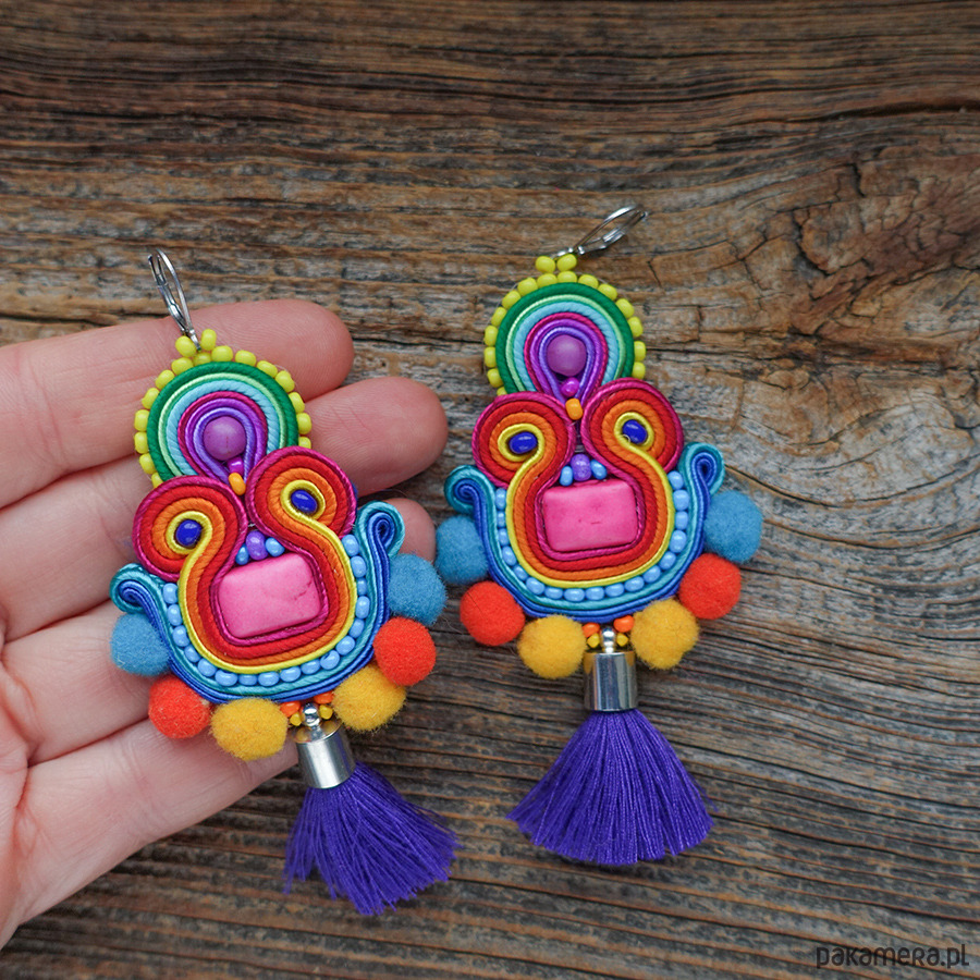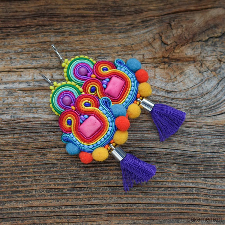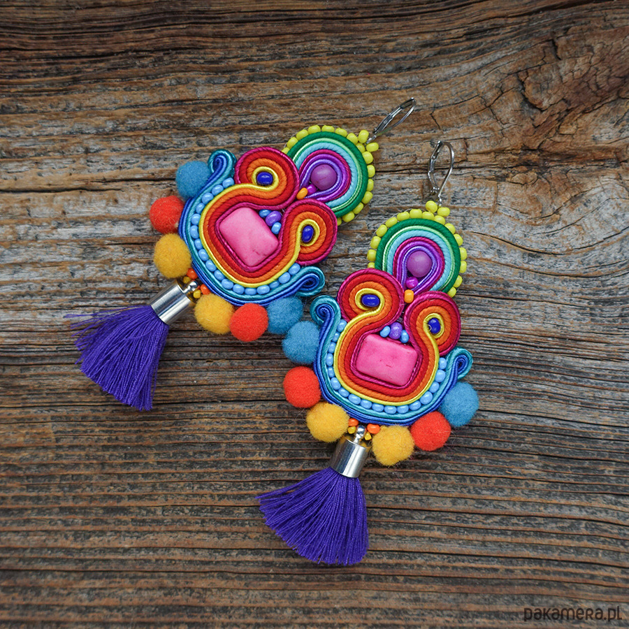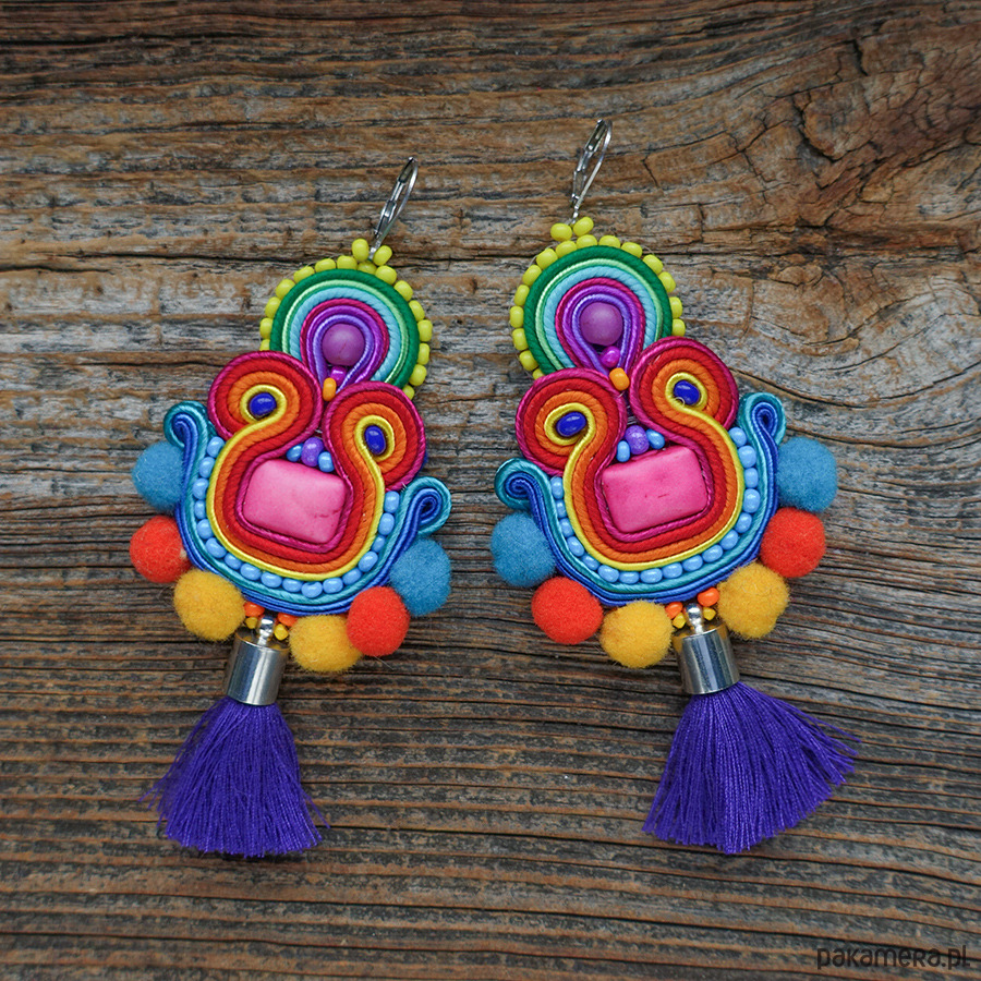 Efektowne, przyciągające uwagę kolczyki wykonane metodą haftu soutache. Intensywne połączenie fioletu, turkusu, kobaltu i ciepłych, energetycznych barw tworzy radosną, wyrazistą kompozycję w stylu boho z nutą etnicznego charakteru.