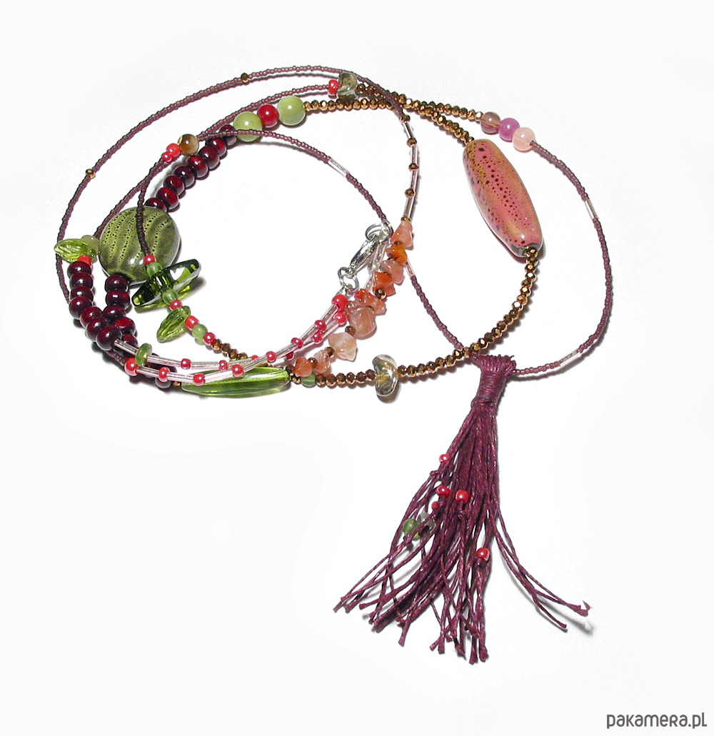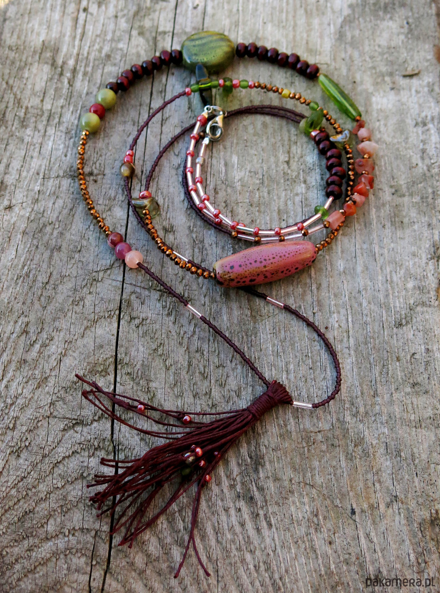 Konstrukcja naszyjnika opiera się na mocnej lince stalowej, ozdobą są elementy szklane, toho, ceramika, różany kwarc, drewno, agat afrykański i kryształ swarovski. Długość naszyjnika ok. 128 cm + długość lnianego chwosta ok. 8 cm, zapięcie posrebrzane.