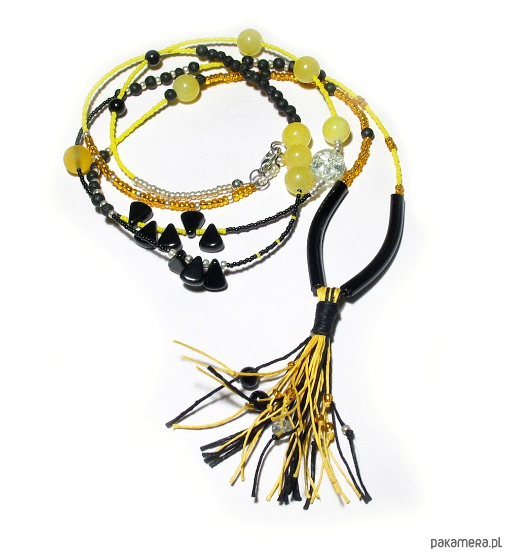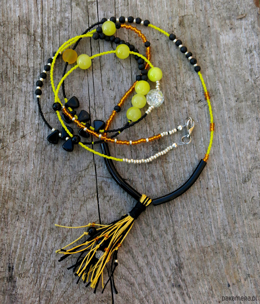 Wyjątkowy, wykonany w pojedynczym egzemplarzu naszyjnik zakończony chwostem z przędzy lnianej w kolorze żółci i czerni.