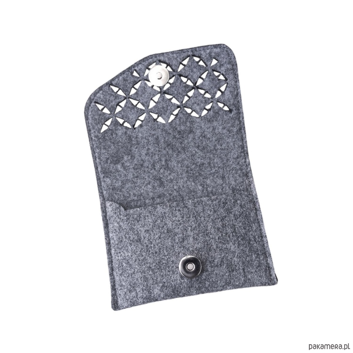 Proste, ale urocze etui z filcu spodoba się zapewne wszystkim kobietom ceniącym sobie drobne akcesoria. Uszyliśmy go stroną impregnowaną na zewnątrz. Przednia klapa ozdobiona geometrycznym ażurem oraz srebrnym zapięciem magnesowym. W środku znajdziemy jedną przegrodę na karty.