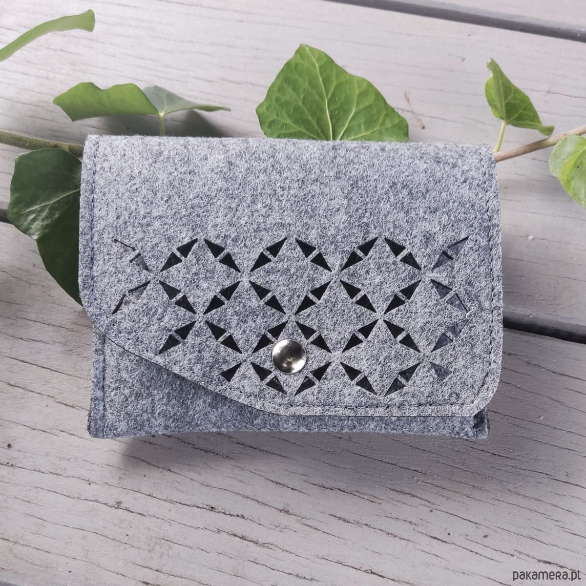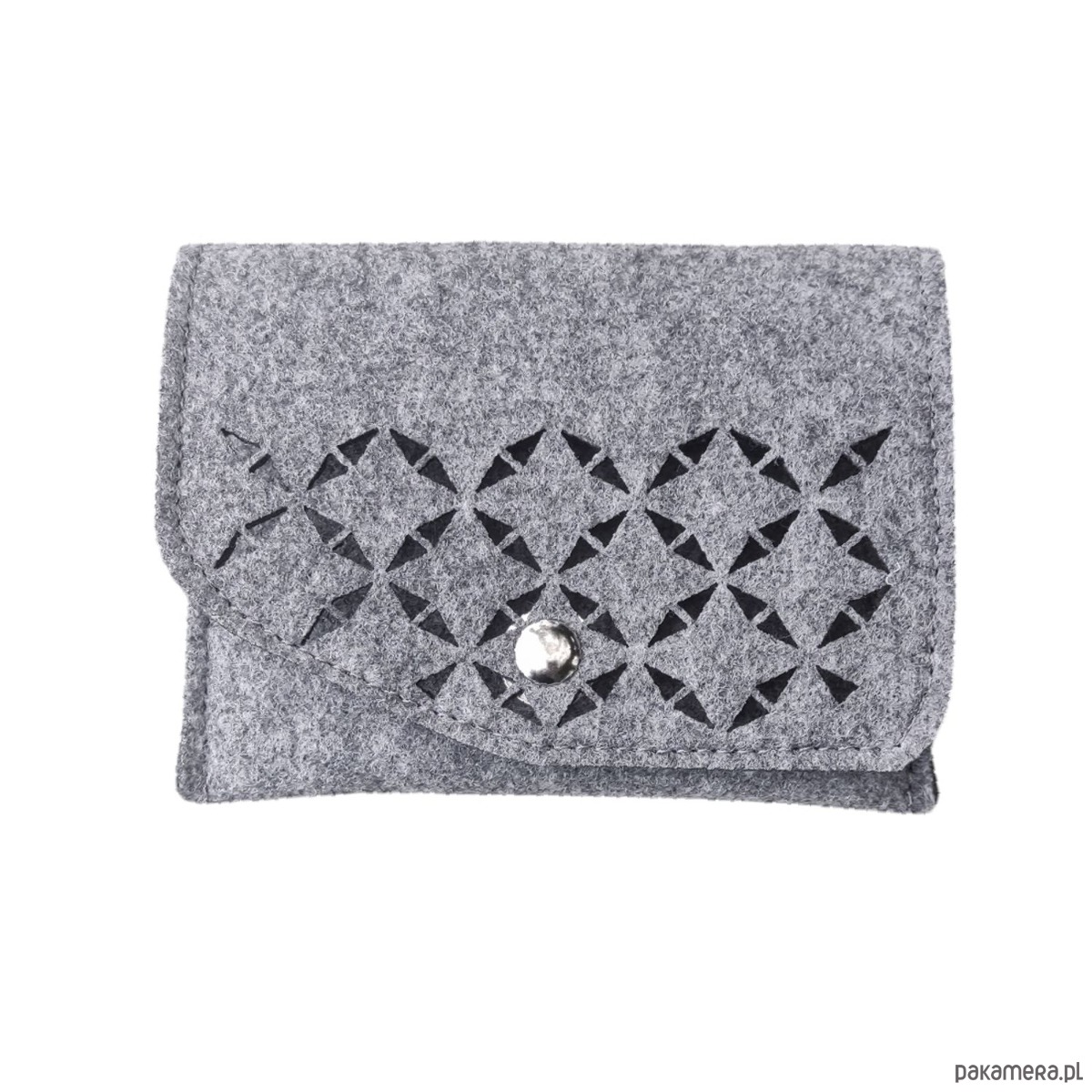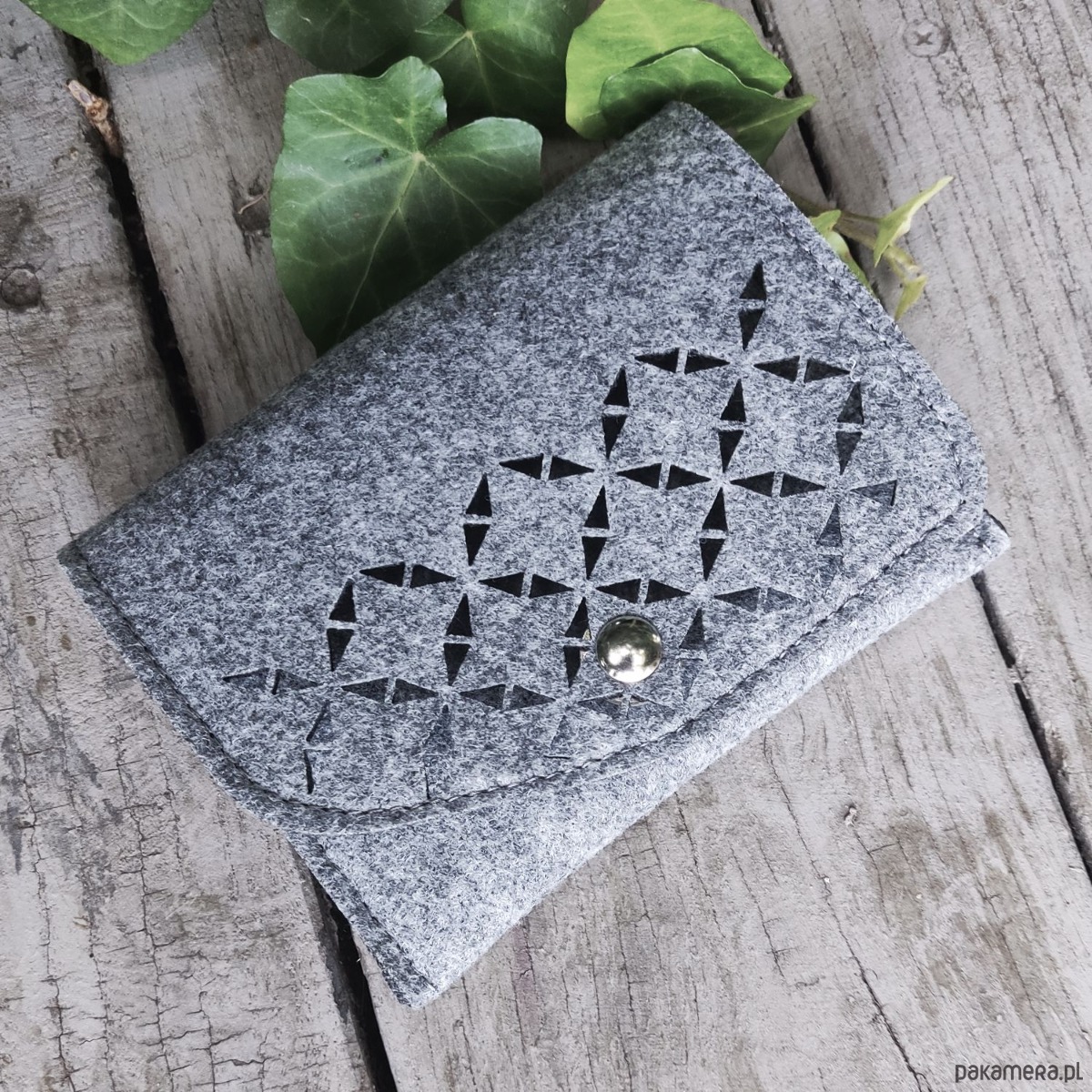Proste, ale urocze etui z filcu spodoba się zapewne wszystkim kobietom ceniącym sobie drobne akcesoria. Uszyliśmy go stroną impregnowaną na zewnątrz. Przednia klapa ozdobiona geometrycznym ażurem oraz srebrnym zapięciem magnesowym. W środku znajdziemy jedną przegrodę na karty.