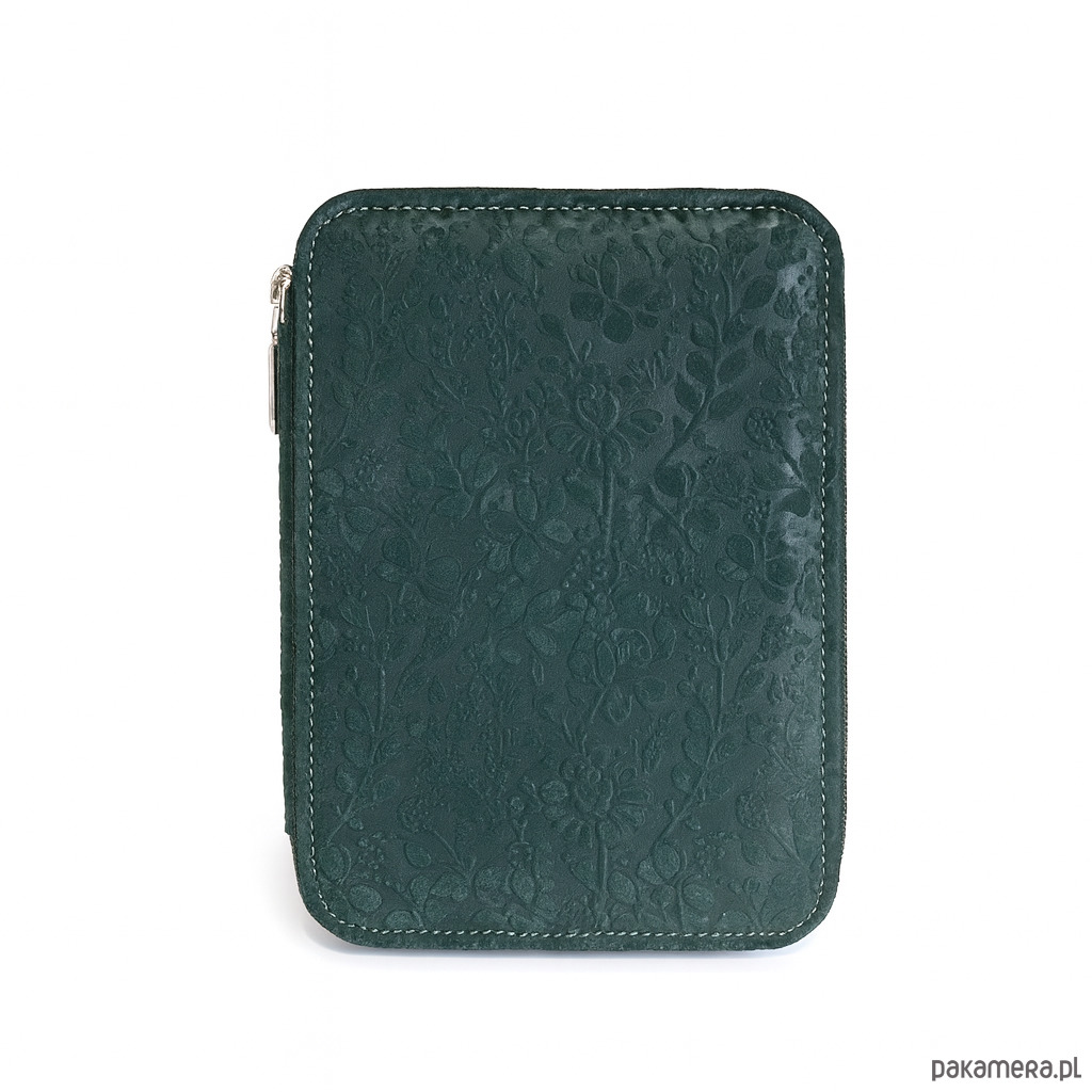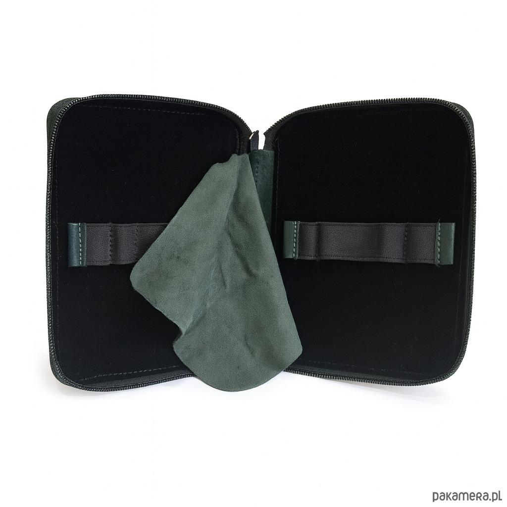 Etui wykonane z pięknej naturalnej skóry welurowej w kolorze ciemnej zieleni o tłoczonej fakturze. Skóra naturalna najwyższej jakości. Piękne etui w bardzo eleganckim kształcie . Etui jest zamykane za zamek błyskawiczny, uchwyty na pióra wykonane są z elastycznej gumki co daje możliwość umieszczenia piór o różnej grubości. Etui w środku wykonane jest z miękkiego materiału w kolorze czarnym, ma welurową kurtynę aby pióra były zabezpieczone. Etui robione ręcznie przy użyciu tradycyjnych metod kaletniczych, zgodnych ze starą sztuką rzemieślniczą. Wymiary 13,5cmx16cmx3cm