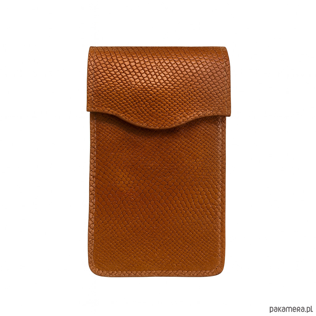 Etui wykonane z wysokiej jakości naturalnej skóry w kolorze koniakowym z tłoczoną fakturą węża. Skóra najwyższej jakości z lekko błyszczącym wykończeniem . Etui w bardzo eleganckim i oryginalnym kształcie . Etui składa się z dwóch osobnych części , posiada wyciągany wkład z przegródkami co bardzo ułatwia wkładanie piór . Etui robione ręcznie przy użyciu tradycyjnych metod kaletniczych, zgodnych ze starą sztuką rzemieślniczą. Wymiary 9,5cmx16cmx3cm