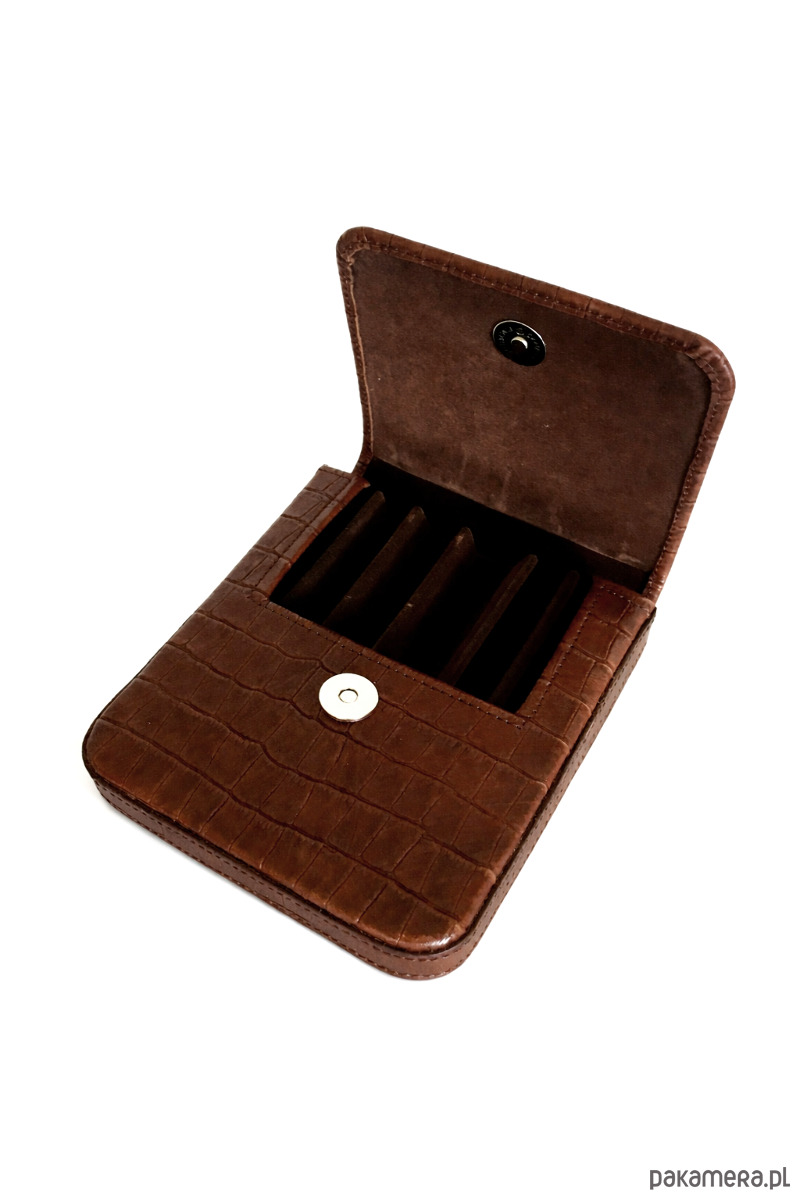 Etui wykonane z wysokiej jakości naturalnej skóry w kolorze ciemno brązowym z tłoczoną fakturą węża. Skóra o ciekawej fakturze drobnej łuski z matowym wykończeniem . Piękne etui w bardzo eleganckim i oryginalnym kształcie . Etui składa się z dwóch osobnych części , posiada wyciągany wkład z przegródkami co bardzo ułatwia wkładanie piór . Etui robione ręcznie przy użyciu tradycyjnych metod kaletniczych, zgodnych ze starą sztuką rzemieślniczą. Wymiary 13,5cmx16cmx3cm