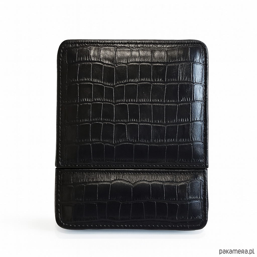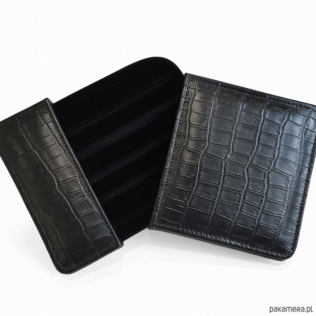 Etui wykonane z pięknej naturalnej skóry licowej w kolorze czarnym, o tłoczonej fakturze krokodyla. Skóra naturalna o najwyższej jakości. Piękne etui w bardzo eleganckim i oryginalnym kształcie . Etui składa się z dwóch osobnych części , jak futerał posiada wyciągany wkład z przegródkami co bardzo ułatwia wkładanie i przechowywanie piór . Etui robione ręcznie przy użyciu tradycyjnych metod kaletniczych, zgodnych ze starą sztuką rzemieślniczą. Wymiary 13,5cmx17cmx3cm