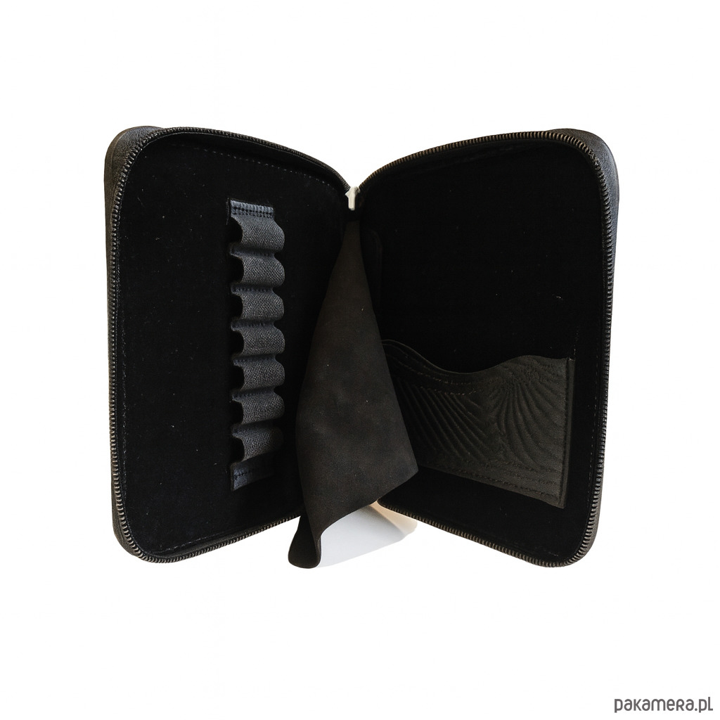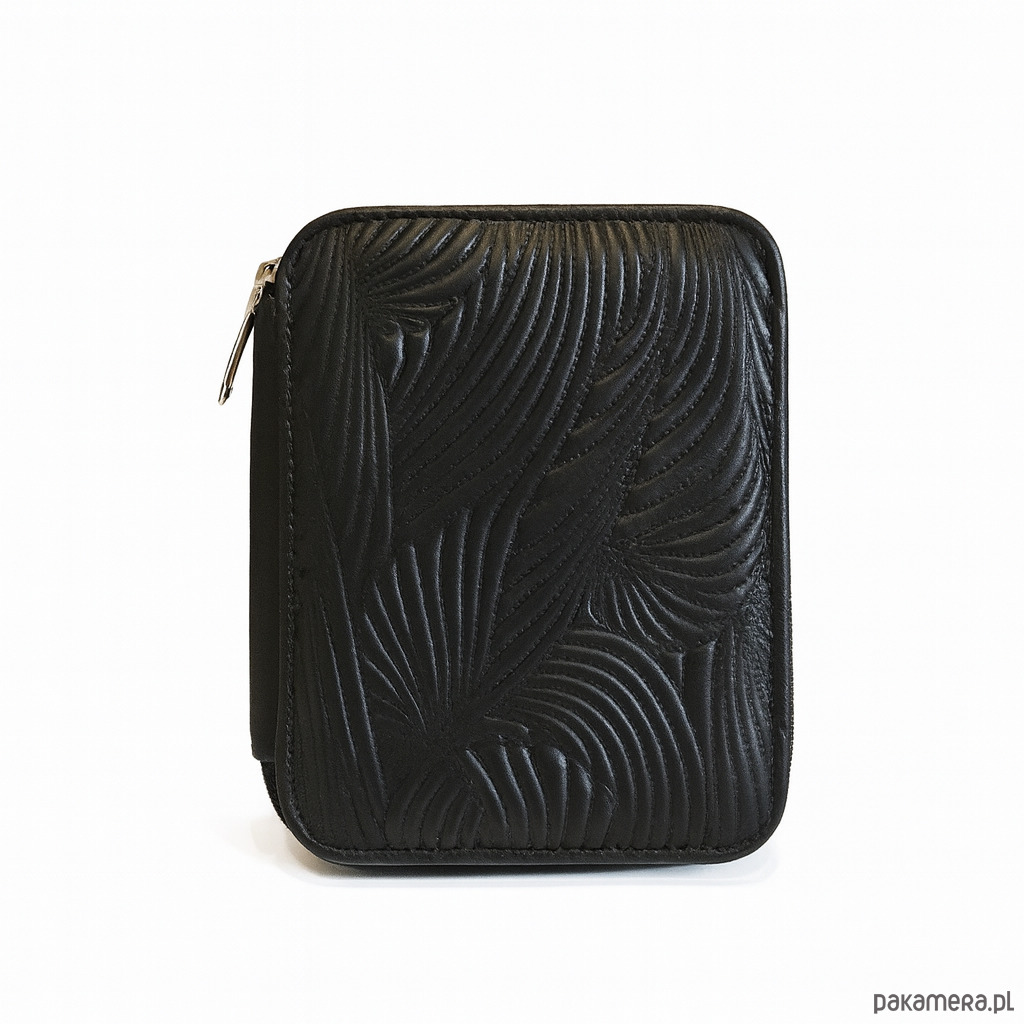 Etui wykonane z pięknej naturalnej skóry w kolorze czarnym o ciekawej tłoczonej fakturze. Skóra naturalna o najwyższej jakości. Piękne etui w bardzo eleganckim kształcie . Etui jest zamykane za zamek błyskawiczny, uchwyty na pióra wykonane są z elastycznej gumki co daje możliwość umieszczenia piór o różnej grubości. Etui w środku wykonane jest z miękkiego materiału w kolorze czarnym, ma welurową kurtynę aby pióra były zabezpieczone. i dodatkową kieszonkę na wizytówki.Etui robione ręcznie przy użyciu tradycyjnych metod kaletniczych, zgodnych ze starą sztuką rzemieślniczą. Wymiary 13,5cmx16cmx3cm